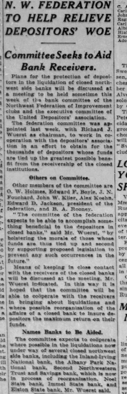 N. W. FEDERATION TO HELP RELIEVE DEPOSITORS' WOE to Aid Bank Receivers. Plans for the protection of deposithe liquidation closed north west side banks will discussed at meeting to be held sometime this week of bank of the of Improvement clubs and the executive committee the United Depositors' The was ap. pointed last week, with Richard Wuerst in the tion in an effort to obtain for the of depositors whose funds tied the greatest possible bene. fit the receivership of the closed Others on Committee. members of the committee are W. Holmes, Boyle, Fouchard, John W. Alex Koehn, Edward president of the Mme. and B. of the expects to be able to cital thing the depositors closed banks, said Mr. Wuerst, the those funds are tied and second by legislation prevent occurrences in the by any Means of close all keeping in contact closed be discussed at the Mr. Wuerst indicated. In this way hoped that the will sing committee be able to cooperate with the receivers bringing about liquidations where possible of the closed bank to insure depositors the maximum return on their funds. Names Banks to Be Aided. The expects to where possible in the now under of several closed banks, including the National bank, the Albany Park Na. tional and bank, which is Noel State bank, Immel State and Elston State bank. Mr. Wuerst sald.