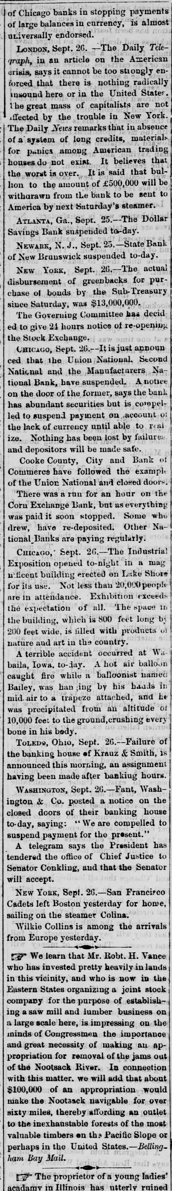 banks in stopping payments almost of of Chicago large balances in currency, is uliversally endorsed. LONDON, Sept. 26. -The Daily American Telein an article on the strongly engraph, it cannot be too radically erisis, forced says that there is nothing United States. insound here or in the are not mass of capitalists New York. The great by the trouble in absence The effected Daily News remarks that in materials system of long credits, trading of a panics among American that for do not exist. It believes that bulhouses is over. It is said will be the worst the amount of £500,000 sent to lion to from the bank to steamer. be America witharawn by next Saturday's ATLANTA, Ga., Sept. 25.--The Dollar Savings Bank suspended to-day. NEWARK, N. J., Sept. 25.-State to-day. Bank of New Brunswick suspended actual NEW YORK, Sept. 26.-The for purbonds disbursement of by greenbacks the Sub- Treasury since chase Saturday, of was $13,000,000. has Governing Committee decid ed The to give 24 hours notice of re-opening the Stock Exchange. Sept. 26.--It is just announ Second CHICAGO, that the Union National. Na ced and the Manufacturers A notice National Bank, have suspended. the bank tional door of the former, says compelon the abundant securities but is of has to suspend payment on account to real led lack of currency until able failures ize. the Nothing has been lost by safe. and depositors will be made City and Bank of have followed the doors. Commerce Cooke County, example of the Union National and closed the There was a run for an hour on Exchange Bank, but us severything who it soon stopped. was have re-deposited. drew, Corn paid regularly. Other Some Na tional Banks are paying CHICAGO, Sept. 26.-The in Industrial a mag Exposition opened to-night Lake Shore building erected on people neficent Not less than 20,000 exceeds for its use. in attendance. Exhibition II are expectation of all. The space by the building, which is 800 feet long of 200 the feet wide, is filled with products nature and art in the country. accident occurred at Wa Iowa, to day. A hot air named while a in baila, A terrible fire balloonist bands balloon caught was han ging by his and be Bailey, air to a trapeze attached, of mid precipitated from an altitude every 10,000 was feet to the ground crushing bone in his Ohio, body. Sept. 26. _Failure of is TOLED?, banking house of Krauz & Smith, announced the this morning, an assignment hours. having been made after banking WashWASHINGTON, Sept. 26.-Fant, the & Co. posted a notice on house ington dcors of their banking to closed to-day, saying: We are compelled suspend payment for the present." telegram says the President has to A the office of Chief Justice Senator tendered Senator Conkling, and that the will accept. NEW YORK, Sept. 26.-San Francisco home, Cadets left Boston yesterday for sailing on the steamer Colina. Wilkie Collins is among the arrivals from Europe yesterday. We learn that Mr. Robt. H. Vance has invested pretty heavily in lands the who this vicinity, and who is now in stock in States organizing a joint for the purpose of saw mill and lumber company Eastern a business establish- the on ing large scale here, is impressing on a minds of Congressmen the importance and great necessity of making all ap- out propriation for removal of the jams the Nootsack River. In connection about of with this matter. we will add that would of an appropriation Nootasck navigable thereby affording an sixty $100,000 make miles, the of the for outlet most over the inexhaustable forests or to valuable timbers on the Pacific Slope perhaps in the United States.-Bellingham Bay Mail. sedit s The proprietor of a young ladies' acadamy in Illinois has utterly rnined