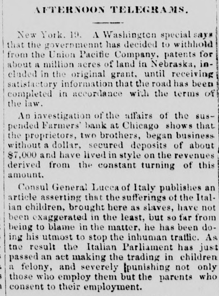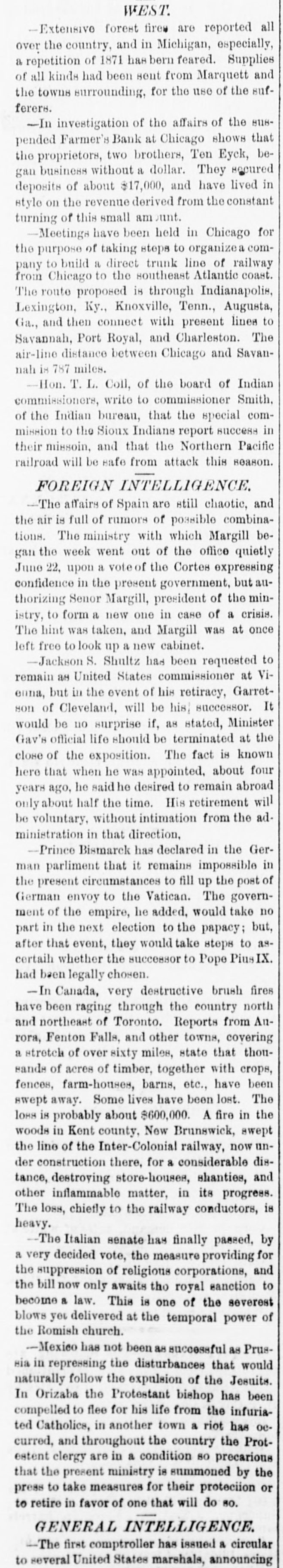 WEST. -Extensive forest fire are reported all over the country, and in Michigan, especially, a repetition of 1871 has bern feared. Supplies and of all kinds had been sent from Marquett the towns surrounding, for the use of the sufferers. -In investigation of the affairs of the 8118pended Farmer's Bank at Chicago shows that the proprietors, two brothers, Ten Eyek, began business without a dollar. They secured in deposits of about $17,000, and have lived style on the revenue derived from the constant turning of this small am ount. -Meetings have been held in Chicago for the purpose of taking steps to organizea comto build a direct trunk line of railway pany from Chicago to the southeast Atlantic coast. The route proposed is through Indianapolis, Lexington, Ky., Knoxville, Tenn., Augusta, Ga., and then connect with present lines to Savannah, Port Royal, and Charleston. The air-line distance between Chicago and Savannah is 787 miles. Hon. T. L. Coll, of the board of Indian commissioners, write to commissioner Smith, of the Indian bureau, that the special commission to the Sioux Indians report success in their missoin, and that the Northern Pacific railroad will be safe from attack this season. FOREIGN INTELLIGENCE. -The affairs of Spain are still chaotic, and the air is full of rumors of possible combinations. The ministry with which Margill began the week went out of the office quietly June 22, upon a vote of the Cortes expressing confidence in the present government, but authorizing Senor Margill, president of the ministry, to form a new one in case of a crisis. The hint was taken, and Margill was at once left free to look up a new cabinet. -Jackson S. Shultz had been requested to remain as United States commissioner at Vienna, but in the event of his retiracy, Garret- It son of Cleveland, will be his successor. would be no surprise if, as stated, Minister Gav's official life should be terminated at the close of the exposition. The fact is known here that when he was appointed, about four years ago, he said he desired to remain abroad will only about half the time. His retirement be voluntary, without intimation from the administration in that direction, -Prince Bismarck has declared in the German parliment that it remains impossible in the present circumstances to fill up the post of German envoy to the Vatican. The government of the empire, he added, would take no part in the next election to the papacy; but, after that event, they would take steps to ascertain whether the successor to Pope PiusIX. had been legally chosen. -In Canada, very destructive brush fires have been raging through the country north and northeast of Toronto. Reports from Aurora, Fenton Falls, and other towns, covering a of over sixty miles, state that thouacres of timber, together sande stretch of with have crops, been fences, farm-houses, barns, etc., swept away. Some lives have been lost. The loss is probably about $600,000. A fire in the woods in Kent county, New Brunswick, swept the line of the Inter-Colonial railway, now under construction there, for a considerable distance, destroying store-houses, shanties, and other inflammable matter, in its progress. The loss, chiefly to the railway conductors, is heavy. -The Italian senate has finally passed, by a very decided vote, the measure providing for the suppression of religious corporations, and the bill now only awaits tho royal eanction to become a law. This is one of the severest blows yet delivered at the temporal power of the Romish church. -Mexico has not been as successful as Prussia in repressing the disturbances that would naturally follow the expulsion of the Jesuits. In Orizaba the Protestant bishop has been compelled to flee for his life from the infuriaCatholics, in another town a riot has ocand the country curred, ted throughout condition precarious the Protestent clergy are in a 80 that the present ministry is summoned by the press to take measures for their protecion or to retire in favor of one that will do so. GENERAL INTELLIGENCE. -The first comptroller has issued a circular to several United States marshals, announcing