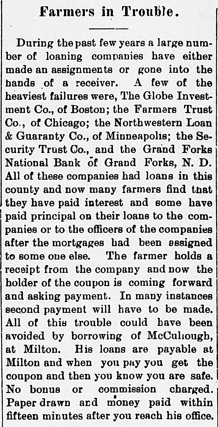 Farmers in Trouble. During the past few years a large number of loaning companies have either made an assignments or gone into the hands of a receiver. A few of the heaviest failures were, The Globe Investment Co., of Boston; the Farmers Trust Co., of Chicago; the Northwestern Loan & Guaranty Co., of Minneapolis; the Security Trust Co., and the Grand Forks National Bank of Grand Forks, N. D. All of these companies had loans in this county and now many farmers find that they have paid interest and some have paid principal on their loans to the companies or to the officers of the companies after the mortgages had been assigned to some one else. The farmer holds a receipt from the company and now the holder of the coupon is coming forward and asking payment. In many instances second payment will have to be made. All of this trouble could have been avoided by borrowing of McCulough, at Milton. His loans are payable at Milton and when you pay you get the coupon and then you know you are safe. No bonus or commission charged. Paper drawn and money paid within fifteen minutes after you reach his office.