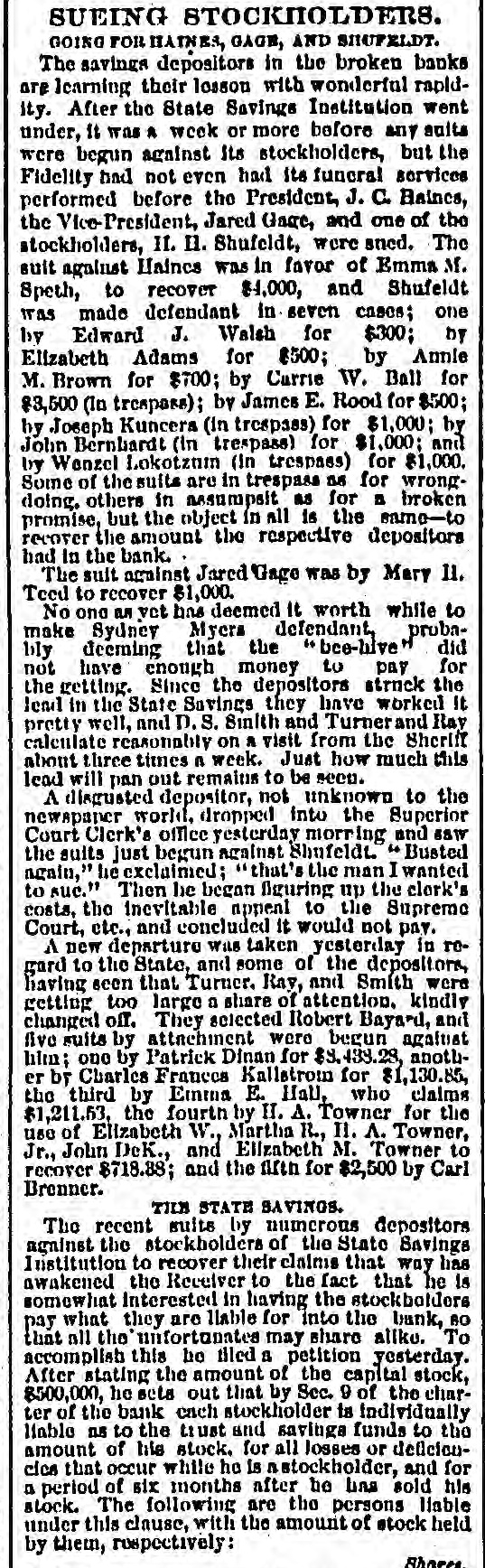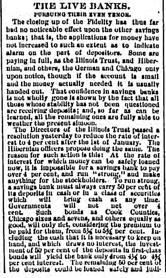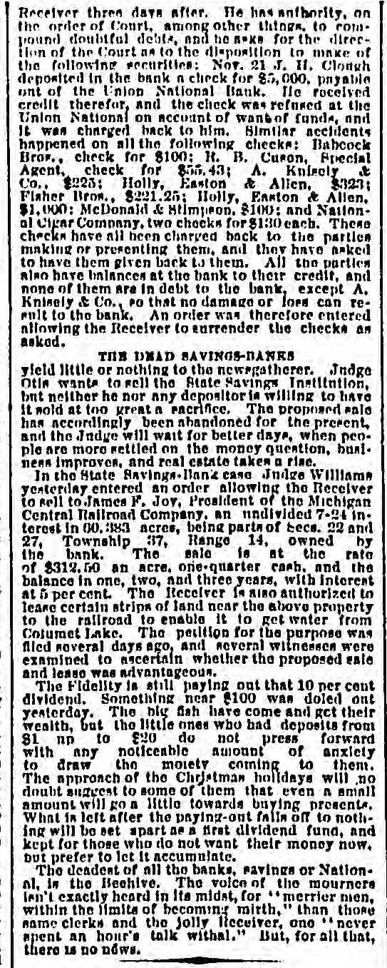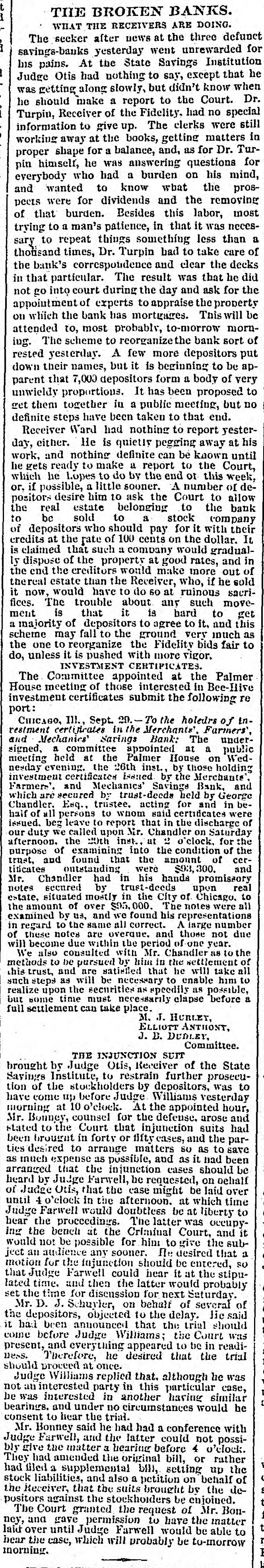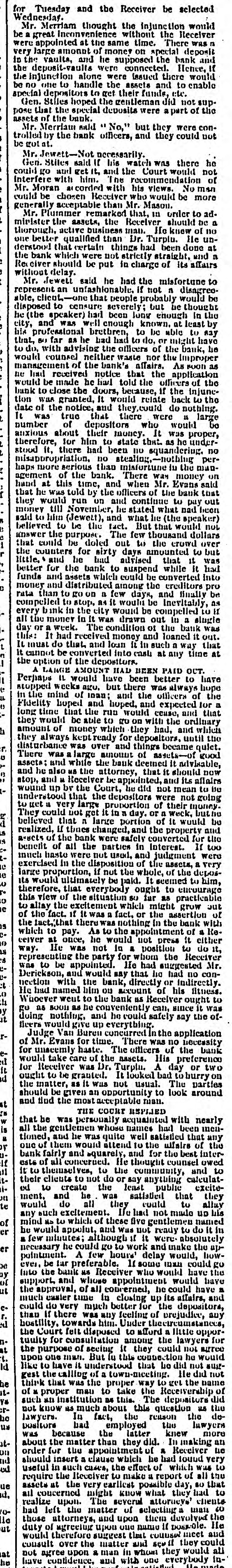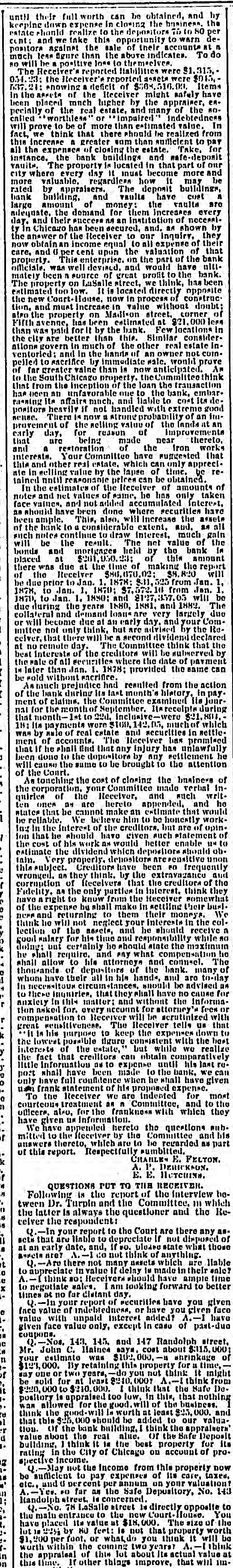 until their full worth can be obtained, and by keeping down expense in closing the business. the estate should realize to the depositors in to 80 per cent: and we take this opportunity to warn depositors against the sale of their accounts at n much less figure than the above indicates. Todo 80 will be a positive loss to themselves The Receiver reported liabilities were S1. 315,034. 23: the Receiver's reported assets were $015,637. 21: showing a deficit of $388,516.00 Items In the assets of the Receiver might safely have been placed much higher by the appraiser, en. pecially of the real estate, and many of the nocalled worthless or Impaired Indebtedness will prove to be of more than estimated value. In fact, we think that there should he realized from this Increase a greater som than sufficient to pay all the expenses of closing the estate. Take, for instance. the bank buildings and mafe-deposit Yauits, The property in located in that part of our city where every day It inust become more and more valuable. regardiess how It may be rated by appraisers. The deposit buildings, bank building, and vaults have cust a large amount of money: the vaults are adequate. the demand for them Increases every day. and their PROCESS na an Institution of necessi. ty In Chicago has been secured, and. an shown by the answer of the Receiver to our Inquiry, they now obtain an income equal to all expense of their care, and 0 per cent upon the valuation of that property. This enterprise. on the part of the bank officials. was well devised. and would have nitimately been n surree of great profit to the bank. The property on LaSalle street, we think, has been estimated too low. It is located directly opposite the new Court House, now in process of construe tion, and must increase in value without doubt: also the property on Madison street, corner of Fifth avenue, line been estimated at $21,000 less than was paid for It by the bank. Few locations In the city are better than this. Similar considerations govern In much of the other real estate Inventoried: and In the hands of an owner not coin. pelled to sacrifice by immediate wale. would prove of far greater value than in how anticipated As to the SouthChicago property. theCommitteothink that from the Inception of the loan the transaction has been an unfavorable one to the bank, embarrassing its affairs much. and liable to cost Its depositors heavily if not handled with extreme good вение. There is now # probability of an Improvement of the selling value of the lands at an early day, for reason of Improvements that are being made near thereto, and a restoration of the fron works interests. Your Committee have suggested that this and other real estate. which can only apprectate In selling value by the lapse of time. be retained until reasonable prices can be obtained. In the estimates of the Receiver of amounts of notes and net values of same, be line only taken face values, and not added accumulated Interest, as should have been done where securities have been ample. This, also, will Increase the assets of the bank to a considerable extent, and, as all such notes continue to draw interest, much gain will be the result. The net value of the bonds and mortgages held by the bank in placed at $261,050.23: of this amount there was due at the time of making the report of the Receiver $86,070.02 $8,820 will be due prior to Jan. 1. 1878: $11, 525 from Jan. 1, INTH. to Jan. 1, 1870: $7,572. 16 from Jan. 1870, to Jan. 1, 1880: and $127,357.05 will be due during the years 1880, 1881. and 1882. The collateral and demand loans are very largely due or will become due at an early day. and your Commuttee not only think, but are advised by the Rdceiver. that there will be a second dividend declared at no remote day. The Committee think that the best Interests of the creditors will be subserved by the sale of all securities where the date of payment 14 later than Jan. 1. 1878; provided the same can be sold without encrifice. As much prejudice had resulted from the action of the bank during its last month' history. in pay. ment of claims. the Committee examined its Journat for the month of September, Its recelpts during that month- 1st to 22d, inclusive -were $21,801. 18: 11a payments were S100, 142.03, muchof which was by male of real estate and securities in settle. ment of accounts. The Receiver has promised that If he shall find that any injury has unlawfully been done to the depositors by any settlement he will cause the same to be brought to the attention of the Court. As tonching the cost of closing the business of the corporation. your Committee made verbal inquiries of the Receiver, and such written ones DM are hereto appended, and he states that be cannot make an estimate that would be reliable. We believe him to be honestly workIng In the Interest of the creditors, but are of opin. ton that he should have given such statement of the cost of his work as would better enable 114 to estimate the dividend which depositors should oh. tain. Very properly. depositors recensitive unon this subject. Creditors have been PO frequently wronged. an they think. by the extravazance and corruption of Receivers that the creditors of the Fidelity. as the only parties In Interest. think they have right to know from the Receiver somewhat of the expense be shall make In settling their burl. nere and returning to them their moneys. We think he will not neglect your Interests in the col. lection of the assets, and he should receive n good salary for his time and responsibility while 80 doing: but certainly he should state the maximum he shall require. and any what compensation he shall allow to his attorneys and connsel. The thousands of depositors of the bank. many of whom have their all In his hands, and are to-day In necessitous circum- tances, should be advised as to these inquiries, that they shall have no cause for anxiety In this matter; and without the information nsked for. every acc