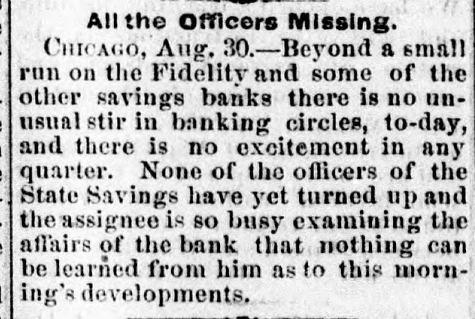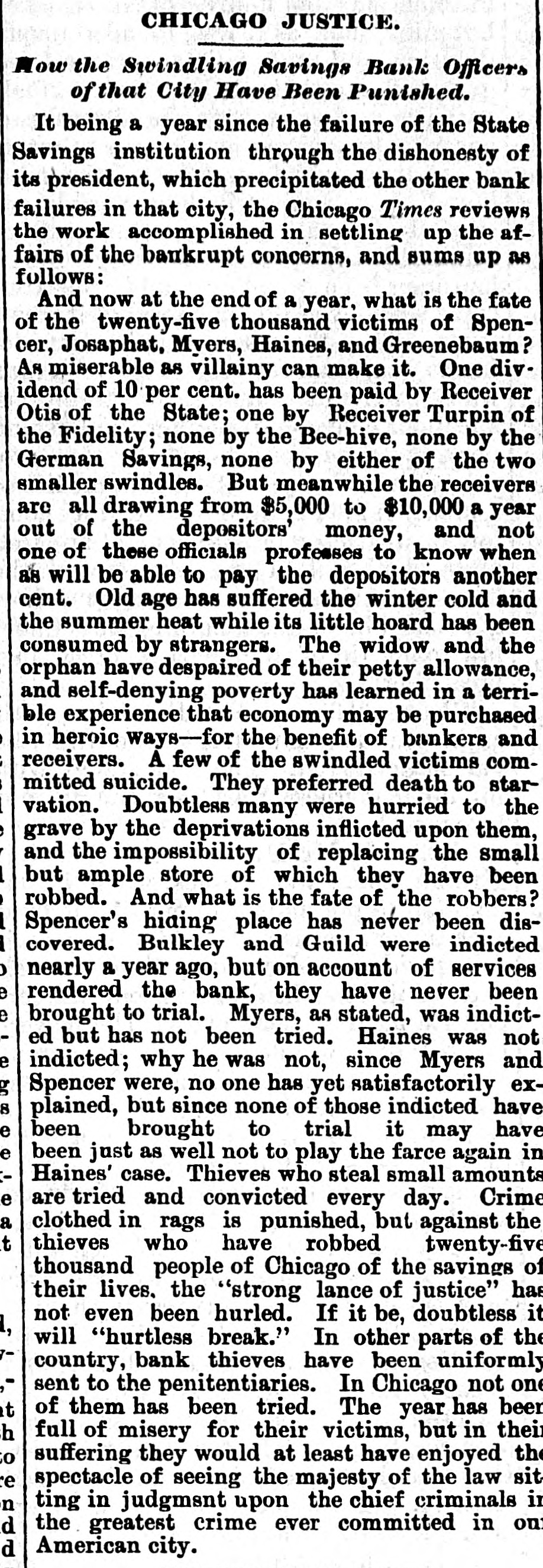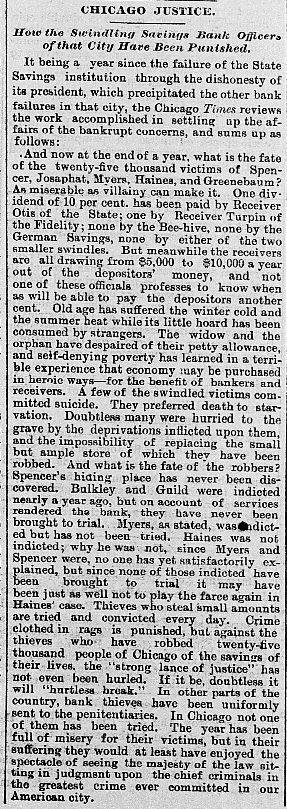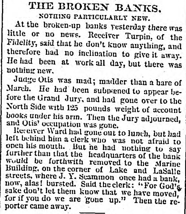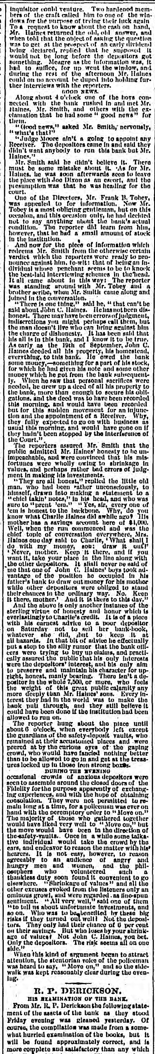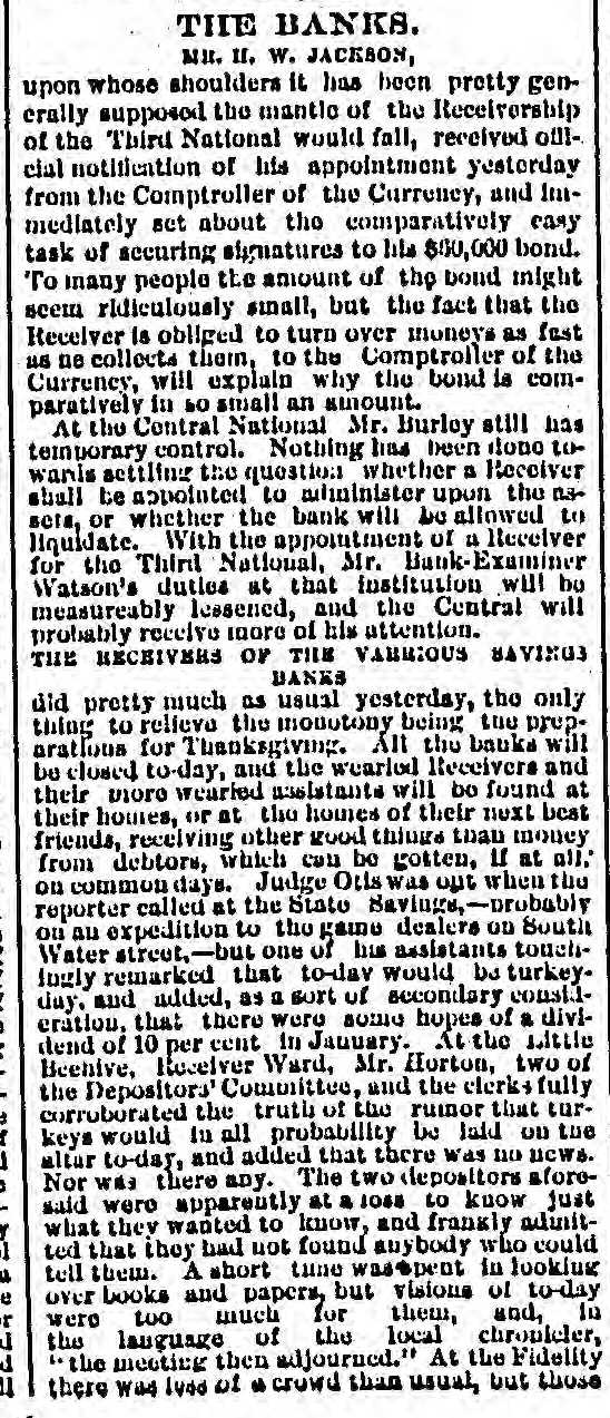 until their full worth can be obtained, and by keeping down expense in closing the business. the estate should realize to the depositors in to 80 per cent: and we take this opportunity to warn depositors against the sale of their accounts at n much less figure than the above indicates. Todo 80 will be a positive loss to themselves The Receiver reported liabilities were S1. 315,034. 23: the Receiver's reported assets were $015,637. 21: showing a deficit of $388,516.00 Items In the assets of the Receiver might safely have been placed much higher by the appraiser, en. pecially of the real estate, and many of the nocalled worthless or Impaired Indebtedness will prove to be of more than estimated value. In fact, we think that there should he realized from this Increase a greater som than sufficient to pay all the expenses of closing the estate. Take, for instance. the bank buildings and mafe-deposit Yauits, The property in located in that part of our city where every day It inust become more and more valuable. regardiess how It may be rated by appraisers. The deposit buildings, bank building, and vaults have cust a large amount of money: the vaults are adequate. the demand for them Increases every day. and their PROCESS na an Institution of necessi. ty In Chicago has been secured, and. an shown by the answer of the Receiver to our Inquiry, they now obtain an income equal to all expense of their care, and 0 per cent upon the valuation of that property. This enterprise. on the part of the bank officials. was well devised. and would have nitimately been n surree of great profit to the bank. The property on LaSalle street, we think, has been estimated too low. It is located directly opposite the new Court House, now in process of construe tion, and must increase in value without doubt: also the property on Madison street, corner of Fifth avenue, line been estimated at $21,000 less than was paid for It by the bank. Few locations In the city are better than this. Similar considerations govern In much of the other real estate Inventoried: and In the hands of an owner not coin. pelled to sacrifice by immediate wale. would prove of far greater value than in how anticipated As to the SouthChicago property. theCommitteothink that from the Inception of the loan the transaction has been an unfavorable one to the bank, embarrassing its affairs much. and liable to cost Its depositors heavily if not handled with extreme good вение. There is now # probability of an Improvement of the selling value of the lands at an early day, for reason of Improvements that are being made near thereto, and a restoration of the fron works interests. Your Committee have suggested that this and other real estate. which can only apprectate In selling value by the lapse of time. be retained until reasonable prices can be obtained. In the estimates of the Receiver of amounts of notes and net values of same, be line only taken face values, and not added accumulated Interest, as should have been done where securities have been ample. This, also, will Increase the assets of the bank to a considerable extent, and, as all such notes continue to draw interest, much gain will be the result. The net value of the bonds and mortgages held by the bank in placed at $261,050.23: of this amount there was due at the time of making the report of the Receiver $86,070.02 $8,820 will be due prior to Jan. 1. 1878: $11, 525 from Jan. 1, INTH. to Jan. 1, 1870: $7,572. 16 from Jan. 1870, to Jan. 1, 1880: and $127,357.05 will be due during the years 1880, 1881. and 1882. The collateral and demand loans are very largely due or will become due at an early day. and your Commuttee not only think, but are advised by the Rdceiver. that there will be a second dividend declared at no remote day. The Committee think that the best Interests of the creditors will be subserved by the sale of all securities where the date of payment 14 later than Jan. 1. 1878; provided the same can be sold without encrifice. As much prejudice had resulted from the action of the bank during its last month' history. in pay. ment of claims. the Committee examined its Journat for the month of September, Its recelpts during that month- 1st to 22d, inclusive -were $21,801. 18: 11a payments were S100, 142.03, muchof which was by male of real estate and securities in settle. ment of accounts. The Receiver has promised that If he shall find that any injury has unlawfully been done to the depositors by any settlement he will cause the same to be brought to the attention of the Court. As tonching the cost of closing the business of the corporation. your Committee made verbal inquiries of the Receiver, and such written ones DM are hereto appended, and he states that be cannot make an estimate that would be reliable. We believe him to be honestly workIng In the Interest of the creditors, but are of opin. ton that he should have given such statement of the cost of his work as would better enable 114 to estimate the dividend which depositors should oh. tain. Very properly. depositors recensitive unon this subject. Creditors have been PO frequently wronged. an they think. by the extravazance and corruption of Receivers that the creditors of the Fidelity. as the only parties In Interest. think they have right to know from the Receiver somewhat of the expense be shall make In settling their burl. nere and returning to them their moneys. We think he will not neglect your Interests in the col. lection of the assets, and he should receive n good salary for his time and responsibility while 80 doing: but certainly he should state the maximum he shall require. and any what compensation he shall allow to his attorneys and connsel. The thousands of depositors of the bank. many of whom have their all In his hands, and are to-day In necessitous circum- tances, should be advised as to these inquiries, that they shall have no cause for anxiety In this matter; and without the information nsked for. every acc