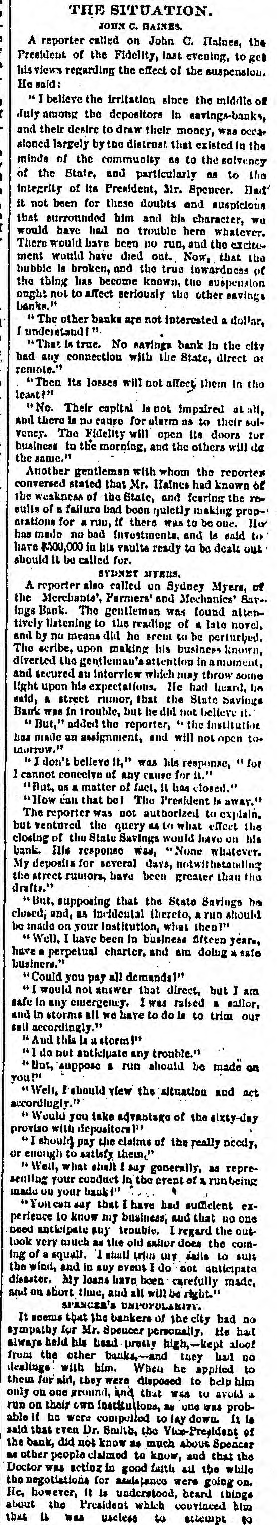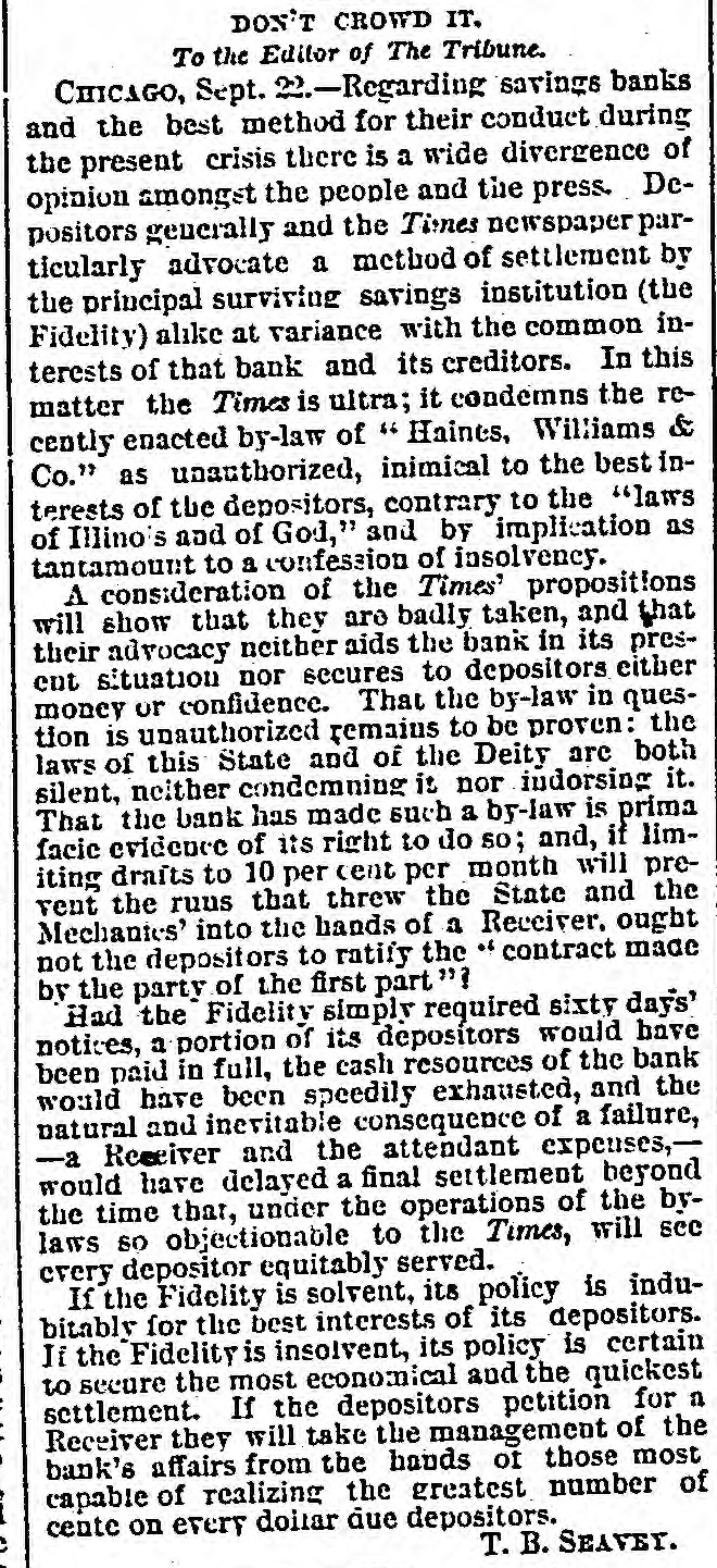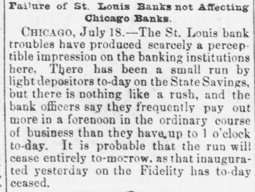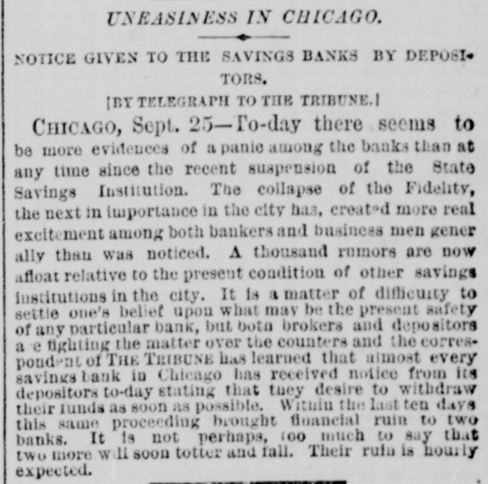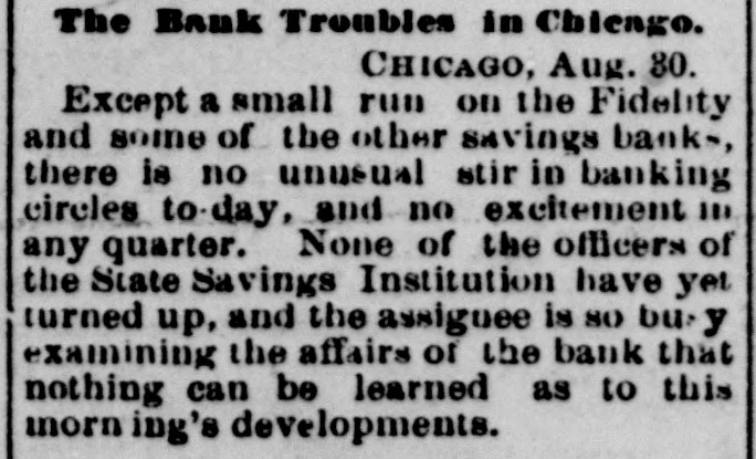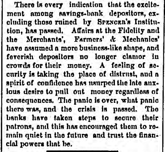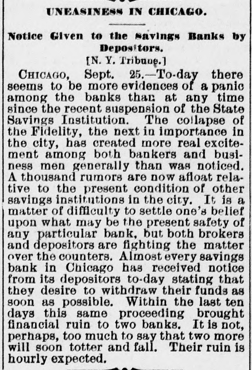until their full worth can be obtained, and by keeping down expense in closing the business. the estate should realize to the depositors in to 80 per cent: and we take this opportunity to warn depositors against the sale of their accounts at n much less figure than the above indicates. Todo 80 will be a positive loss to themselves The Receiver reported liabilities were S1. 315,034. 23: the Receiver's reported assets were $015,637. 21: showing a deficit of $388,516.00 Items In the assets of the Receiver might safely have been placed much higher by the appraiser, en. pecially of the real estate, and many of the nocalled worthless or Impaired Indebtedness will prove to be of more than estimated value. In fact, we think that there should he realized from this Increase a greater som than sufficient to pay all the expenses of closing the estate. Take, for instance. the bank buildings and mafe-deposit Yauits, The property in located in that part of our city where every day It inust become more and more valuable. regardiess how It may be rated by appraisers. The deposit buildings, bank building, and vaults have cust a large amount of money: the vaults are adequate. the demand for them Increases every day. and their PROCESS na an Institution of necessi. ty In Chicago has been secured, and. an shown by the answer of the Receiver to our Inquiry, they now obtain an income equal to all expense of their care, and 0 per cent upon the valuation of that property. This enterprise. on the part of the bank officials. was well devised. and would have nitimately been n surree of great profit to the bank. The property on LaSalle street, we think, has been estimated too low. It is located directly opposite the new Court House, now in process of construe tion, and must increase in value without doubt: also the property on Madison street, corner of Fifth avenue, line been estimated at $21,000 less than was paid for It by the bank. Few locations In the city are better than this. Similar considerations govern In much of the other real estate Inventoried: and In the hands of an owner not coin. pelled to sacrifice by immediate wale. would prove of far greater value than in how anticipated As to the SouthChicago property. theCommitteothink that from the Inception of the loan the transaction has been an unfavorable one to the bank, embarrassing its affairs much. and liable to cost Its depositors heavily if not handled with extreme good вение. There is now # probability of an Improvement of the selling value of the lands at an early day, for reason of Improvements that are being made near thereto, and a restoration of the fron works interests. Your Committee have suggested that this and other real estate. which can only apprectate In selling value by the lapse of time. be retained until reasonable prices can be obtained. In the estimates of the Receiver of amounts of notes and net values of same, be line only taken face values, and not added accumulated Interest, as should have been done where securities have been ample. This, also, will Increase the assets of the bank to a considerable extent, and, as all such notes continue to draw interest, much gain will be the result. The net value of the bonds and mortgages held by the bank in placed at $261,050.23: of this amount there was due at the time of making the report of the Receiver $86,070.02 $8,820 will be due prior to Jan. 1. 1878: $11, 525 from Jan. 1, INTH. to Jan. 1, 1870: $7,572. 16 from Jan. 1870, to Jan. 1, 1880: and $127,357.05 will be due during the years 1880, 1881. and 1882. The collateral and demand loans are very largely due or will become due at an early day. and your Commuttee not only think, but are advised by the Rdceiver. that there will be a second dividend declared at no remote day. The Committee think that the best Interests of the creditors will be subserved by the sale of all securities where the date of payment 14 later than Jan. 1. 1878; provided the same can be sold without encrifice. As much prejudice had resulted from the action of the bank during its last month' history. in pay. ment of claims. the Committee examined its Journat for the month of September, Its recelpts during that month- 1st to 22d, inclusive -were $21,801. 18: 11a payments were S100, 142.03, muchof which was by male of real estate and securities in settle. ment of accounts. The Receiver has promised that If he shall find that any injury has unlawfully been done to the depositors by any settlement he will cause the same to be brought to the attention of the Court. As tonching the cost of closing the business of the corporation. your Committee made verbal inquiries of the Receiver, and such written ones DM are hereto appended, and he states that be cannot make an estimate that would be reliable. We believe him to be honestly workIng In the Interest of the creditors, but are of opin. ton that he should have given such statement of the cost of his work as would better enable 114 to estimate the dividend which depositors should oh. tain. Very properly. depositors recensitive unon this subject. Creditors have been PO frequently wronged. an they think. by the extravazance and corruption of Receivers that the creditors of the Fidelity. as the only parties In Interest. think they have right to know from the Receiver somewhat of the expense be shall make In settling their burl. nere and returning to them their moneys. We think he will not neglect your Interests in the col. lection of the assets, and he should receive n good salary for his time and responsibility while 80 doing: but certainly he should state the maximum he shall require. and any what compensation he shall allow to his attorneys and connsel. The thousands of depositors of the bank. many of whom have their all In his hands, and are to-day In necessitous circum- tances, should be advised as to these inquiries, that they shall have no cause for anxiety In this matter; and without the information nsked for. every acc
