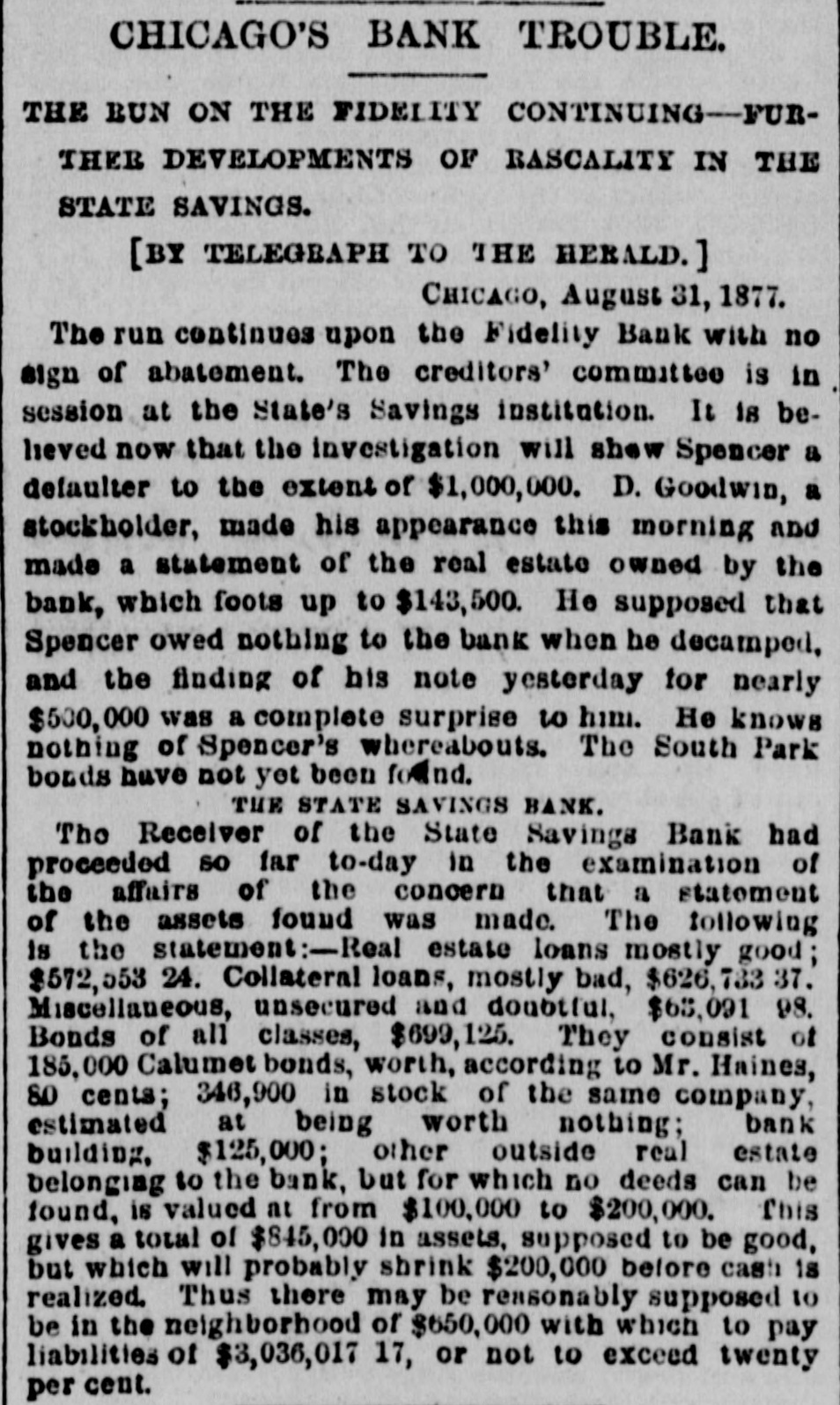 CHICAGO'S BANK TROUBLE. THE RUN ON THE FIDELITY CONTINUING-FUR THER DEVELOPMENTS OF RASCALITY IN THE STATE SAVINGS. [BY TELEGRAPH TO THE HERALD. ] CHICAGO, August 31, 1877. The run continues upon the Fidelity Bank with no sign of abatement. The creditors' committee is in session at the State's Savings institution. It is believed now that the investigation will shew Spencer a defaulter to the extent of $1,000,000. D. Goodwin, a stockholder, made his appearance this morning and made a statement of the real estate owned by the bank, which foots up to $143,500. He supposed that Spencer owed nothing to the bank when he decamped, and the finding of his note yesterday for nearly $500,000 was a complete surprise to him. He knows nothing of Spencer's whereabouts. The South Park bonds have not yet been found. THE STATE SAVINGS BANK. The Receiver of the State Savings Bank had proceeded so far to-day in the examination of the affairs of the concern that a statement of the assets found was made. The following is the statement:-Real estate loans mostly good; $572,553 24. Collateral loans, mostly bad, $626, 733 37. Miscellaneous, unsecured and doubtful, $65,091 98. Bonds of all classes, $699,125. They consist of 185,000 Calumet bonds, worth, according to Mr. Haines, so cents; 346,900 in stock of the same company, estimated at being worth nothing; bank building, $125,000; other outside real estate belonging to the bank, but for which no deeds can be found, is valued at from $100,000 to $200,000. This gives a total of $845,000 in assets, supposed to be good, but which will probably shrink $200,000 before cash is realized. Thus there may be reasonably supposed to be in the neighborhood of $650,000 with which to pay liabilities of $3,036,017 17, or not to exceed twenty per cent.