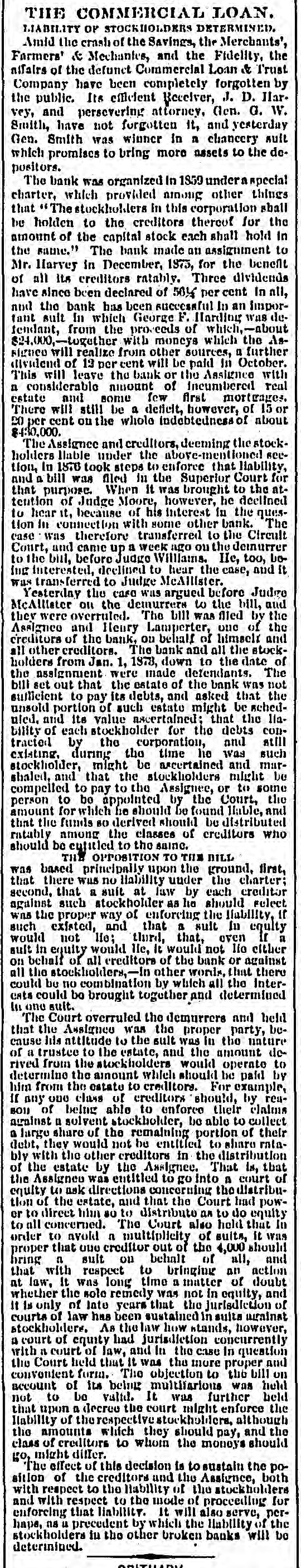 # THE COMMERCIAL LOAN. LIABILITY OF STOCKHOLDERS DETERMINED. Amid the crash of the Savings, the Merchants', Farmers' & Mechantes, and the Fidelity, the affairs of the defunct Commercial Loan & Trust Company have been completely forgotten by the public. Its efficient Receiver, J. D. Harvey, and persevering attorney, Gen. G. W. Smith, have not forgotten it, and yesterday Gen. Smith was winner in a chancery suit which promises to bring more assets to the depositors. The bank was organized in 1859 under a special charter, which provided among other things that "The stockholders in this corporation shall be holden to the creditors thereof for the amount of the capital stock each shall hold in the same." The bank made an assignment to Mr. Harvey in December, 1875, for the benefit of all its creditors ratably. Three dividends have since been declared of 56¼ per cent in all, nod the bank has been successful in an important suit in which George F. Harding was defendant, from the proceeds of which, about $24,000,-together with moneys which the Assignee will realize froin other sources, a further dividend of 13 per cent will be paid in October. This will leave the bank or the Assignee with a considerable amount of incumbered real estate and some few first mortrages. There will still be a deficit, however, of 15 or 20 per cent on the whole indebtedness of about $4:10,000. The Assignee and creditors, deeming the stockholders liable under the above-mentioned section, In 1876 took steps to enforce that liability, and a bill was filed in the Superior Court for that purpose. When it was brought to the attention of Judge Moore, however, he declined to hear it, because of his interest in the question in connection with some other bank. The case was therefore transferred to the Circuit Court, and came up a week ago ou the deinurrer to the bill, before Judge Williams. He, too, being interested, declined to hear the case, and it was transferred to Judge McAllister. Yesterday the case was argued before Judre McAllister on the demurrers to the bill, and they were overruled. The bill was filed by the Assignee and Henry Lamperter, one of the creditors of the bank, on behalf of himself and all other creditors. The bank and all the stockholders from Jan. 1, 1873, down to the date of the assignment were made defendants. The bill set out that the estate of the bank was not sufficient to pay its debts, and asked that the unsold portion of such estate might be scheduled, and its value ascertained; that the liability of each stockholder for the debts contracted by the corporation, and still existing, during the time he was such stockholder, might be ascertained and marshaled, and that the stockholders might be compelled to pay to the Assignee, or to some person to be appointed by the Court, the amount for which he should be found liable, and that the funds so derived should be distributed ratably among the classes of creditors who should be entitled to the same. THE OPPOSITION TO THE BILL was based principally upon the ground, first, that there was no liability under the charter; second, that a suit at law by each creditor against such stockholder as he should select was the proper way of enforcing the liability, if such existed, and that a sult in equity would not lie; third, that, even it a suit in equity would lie, it would not lis either on behalf of all creditors of the bank or against all the stockholders,-in other words, that there could be no combination by which all the interests could bo brought together and determined in one suit. The Court overruled the demurrers and held that the Assignee was the proper party, because his attitude to the sult was in the nature of a trustee to the estate, and the amount derived from the stockholders would operate to determine the amount which should be paid by him from the estate to creditors. For example, If any one class of creditors should, by reason of being able to enforce their claims against a solvent stockholder, be able to collect a large share of the remaining portion of their debt, they would not be entitled to share ratably with the other creditors in the distribution of the estate by the Assignee. That is, that the Assigned was entitled to go into a court of equity to ask directions concerning the distribution of the estate, and that the Court had power to direct him so to distributo as to do equity to all concerned. The Court also held that in order to avoid a multiplicity of suits, it was proper that one creditor out of the 4,000 should bring a suit on behalt of all, and that with respect to bringing an action at law, it was long time a matter of doubt whether the sole remedy was not in equity, and it is only of late years that the jurisdiction of courts of law has been sustained in suits against stockholders. As the law how stands, however, a court of equity had jurisdiction concurrently with a court of law, and in the case in question the Court held that it was the more proper and convontent form. The objection to the bill on account of its being multifarious was held not to be valid. It was further held tinat upon a decree the court might enforce the liability of the respective stockholders, although the amounts which they should pay, and the class of creditors to whom the moneys should go, might differ. The effect of this decision is to sustain the position of the creditors and the Assignee, both with respect to the liability of the stockholders and with respect to the mode of proceeding for enforcing that liability. It will also serve, perhape, na u precedent by which the liability of the stockholders in the other broken banks will be determined.