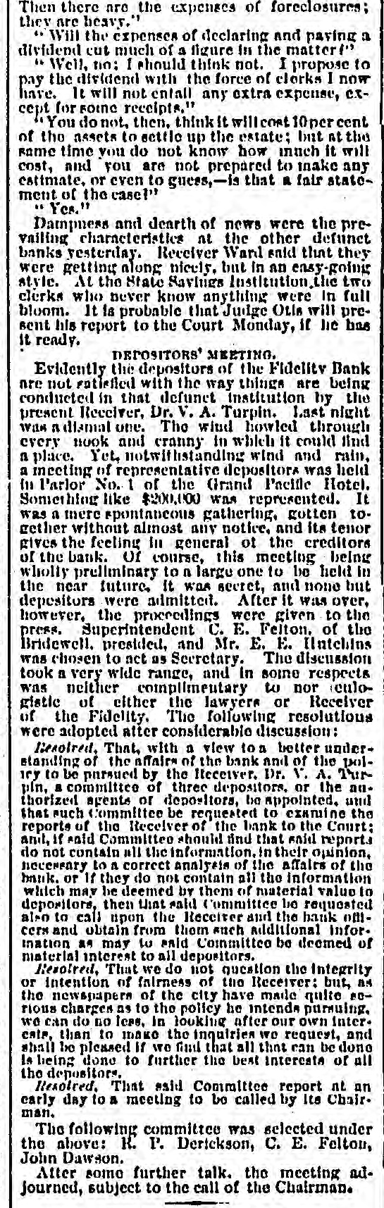 Then there are the expenses of foreclosures; they are heavy." Will the expenses of declaring and paying a dividend cut much of a figure In the matter " Well, no: 1 should think not. I propose to pay the dividend with the force of clorks I now have. It will not entall any extra expense, except for soine receipts." You do not, then, think It will cost 10 per cent of the assets to settle up the estate; but at the same time you do not know how inuch it will cost, and you are not prepared to make any estimate, or even to guess,-is that a fair statement of the casel" Yes." Dampuess and dearth of news were the prevailing characteristics at the other defunct banks yesterday. Receiver Ward said that they were getting along nicely, but in an easy-going style. At the State Savings Institution, the two clerks who never know anything were In full bloom. It la probable that Judge Other will present his report to the Court Monday, if lie has It ready. DEPOSITORS' MEETING. Evidently the depositors of the Fidelity Bank are not satisfied with the way things are being conducted in that defunct institution by the present Receiver, Dr. v. A. Turpin. Last night Was dismal one. The wind howled through every nook and cranny in which it could find a place. Yet, notwithstanding wind and rain, a meeting of representative depositors was held in l'arlor No. 1 of the Grand Pacific Hotel. Something like $200,000 was represented. It was a mere spontaneous gathering, gotten together without almost any notice, and its tenor gives the feeling In general of the creditors of the bank. Of course, this meeting being wholly preliminary to n large one to be held in the near future. It Was secret, and none but depesitors were admitted. After it was over, however, the proceedings were given to the press. Superintendent C. E. Felton. of the Bridewell. presided, and Mr. E. E. Intebins was chosen to net as Secretary. The discussion took a very wide range, and In some respects was neither complimentary to nor (culogistle of either the lawyers or Receiver of the Fidelity, The following resolutions were adopted after considerable discussion: Desolved. That, with a view to a better understanding of the affairs of the bank and of the polany to be pursued by the Receiver. Dr. v. A. This pin, a committee of three depositors. or the authorized agents of depositors, be appointed. and that such Committee be requested to examine the reports of the Receiver of the bank to the Court: and, If said Committee should find that said reports do not contain all the information. in their opinion, necessary to a correct analysis of the affairs of the bank. or If they do not contain all the information which may be deemed by them of material value to depositors, then that said Committee be requested also to call upon the Receiver and the bank officers and obtain from them such additional Infor. ination as may to said Committee be deemed of material interest to all depositors. Resolved, That we do not question the Integrity or intention of fairness of the Receiver: but, as the newspapers of the city have made quite 80rious charges as to the policy he intends pursuing, we can do no less, in looking after our own interesta, than to make the inquiries we request, and shall be pleased If we find that all that can be done is being done to further the best interests of all the depositors. Resolved. That said Committee report nt an early day to a meeting to be called by Its Chairman. The following committee was selected under the above: R. P. Derickson, C. E. Felton, John Dawson. Atter somo further talk. the meeting adjourned, subject to the call of the Chairman.