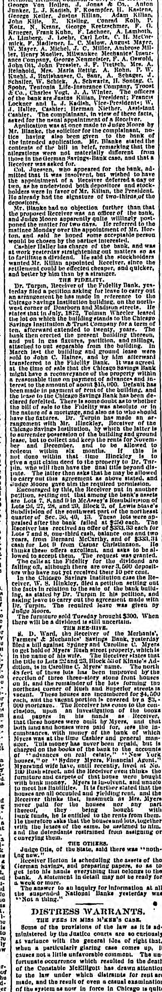 George Von Hollen, J. Jonas & Co. Anton Junker. L. J. Kadish, F. Koompfer. H. Kastens, John George Keller. Justus Killan, Adam Killan, Kille, E. Kisling, Conrad Kolb, P. Kotz. N Krane, George Kretzschmer. F. A. Krneger, Frank Kuhn, F. Lachner, A. Lamboth, 0. mick, Limberg. J. Lochr, Carl Lotz. C. H. McCorW. F. Madiener, L.. C. Malow, August Mayer. Mayer. A. Michel. T. C. Miller, Ambrose MIIance ler, Henry Mueller. Milwankee Mechanics InsurJohn Company, George Nonmeister, F. A. Oswold, OIL, John Pressler. 3. F. Pretsch, Mrs. Reinhold, Mrs. Maria Rettig. A. Rohn. P. W. A. Knehl. 3. Rutishanser, c. Saur, A. Schager, J. Schaller, W. Schick, A. Schwartz, H. Sontag. C. Spohr, & Tentonia Life Insurance Company, Troost of Co., Charles Vogt. J. A. Winter. The officers the bank are Tustus Killan, President: Francis J. Lockner and L. J. Kadish, Vice President: W, Haller, Cashier: Herman Niether, Assistant Cashier. The complainant, in view of these facts, neted for the nanal appaintment of a Receiver. Application was at once made to Judge Monro by tice Mr. Blanke, the solicitor for the complainant, nohaving also been given to the bank of the intended application. Mr. Blanke stated the contents of the bill in brief. remarking that the allegations were not materially different from those in the German Savings-Bank case, and that a Receiver was asked for. Col. Juessen. who appeared for the bank, nd. mitted the that It was insolvent. but wished to have appointment of A Receiver deferred a two, an he understood both depositore and day stock- or holders Ho were in favor of Mr. Killan, the President. depositors. already had the signature of thirds of the Mr. Blanke had no objection further than that and the proposed Receiver was an officer of the Judge Moore apparently quite willingly bank, poned the matter for two days. He referred to post. the matinee ton, Monday over the appointment of Mr. Hor. would and said he hoped some acceptable person be chosen by the parties interested. Cashier Haller has charge of the bank. and was to at work yesterday straightening out matters 50 factiitate a dividend. He said the stockholders as wanted Mr. Killan appointed Receiver. since the settlement and could be effected cheaper, and quicker, better by him than by a stranger. THE FIDELITY. Dr. Turpin, Receiver of the Fidelity Bank. terday filed a petition asking for leave to carry yes. out an arrangement he has made in reference to the Chicago west avings Institution building, on the north. corner of Dearborn and Madison streets. states the lot that In July, 1872, Tolman Wheeler leased He on which the building stands to the Chicago Savings ten. Institution & Trust Company for a term of afterward extended to twenty, years. The and bank then crected the present building thereon, attached put In cas fixtures, partition, and railings, March to out separable from the building. In sold Inst the building and ground lease were to John C. Haines and by him transferred to the Fidelity Bank. It was afterward at might the time of sale that the Chicago Savings agreed Bank a have a reconveyance of the property within reasonable time on payment of advances and interest been to the amount of moont $15,000. Default has the made In payment of rent of the building. and lease to the Chicago Savings Bank has been declared the bill forfeited. There la some doubt an to whether of rate to the Fidelity was absolute the have nature of a mortgage, and also on to who should or in the lixtures. Dr. Turpin has made an rangement with Mr. Hinckley, Receiver of the ar. Chicago to Savings Institution, by which the latter is lease, surrender possession of the building and ground ber but to collect and keep the rents for Novemredeom and within December, six and to be allowed to not done within that months. time Hinckley If this Is to In give pin. a quit claim deed to ite property to Dr. Tur. who will then have the tinal title beyond disto Dute The latter then nake that he may be allowed Judge carry out this agreement as above stated. and Moore gave him the required permission. Encouraged by this, the Receiver put in another are petition, setting out that among the bank's assets Lots Lots 7, M,and 0 in McAnney's Resubdivision of 20. 27, 28, and 20. Illock 2, of Lewis blan Subdivision of the southwest part of the northeast quarter of Sec. 30, 40, 13. These lots were appraised after the bank failed at $250 each. Lots Receiver has received an offer of $333. each The 7 and 8. one third cash, balance one and two for years, from llernard McCarthy. and of $333.31 thinks cash for Lot 0 from Caspar Christianson. lie lowed these offers excellent, and asks to be alThe to accept them. The request was granted. calls at the Fidelity for the dividend falling off, although there are over 3, 500 deposit- are ore In who have not yet received their 10 per cent. the Chicago Savings Institution case the Receiver, the W. S. Hinkley, filed a petition setting ont facts In relation to the sale of the bank build. Ing. as stated by Dr. Turpin It his petition, and asking Dr. leave to carry out the agreement made with Purpin. The required leave was given by Judge Moore. The furniture sold Tuesday brought $300. When there will be a dividend is still uncertain. THE BEE-HIVE. S. D. Ward, the Receiver of the Merhante', U Farmers' & Mechanics' Savings Bank, filed to a bill against Sydney and Caroline yesterday C. Myers in get hold of Myers Rush street property. which the name of his wife. the title to Lots *2*3 and 23, Illock The Receiver Blot Kinxie's states that Addition, is in Caroline C. Myers name. The north 48 feet of these lots line been improved by the erection of three three-story stone front houses on it. and the remainder of the lots forming northeast corner of Rush and Superior streets the vacant. These houses are incombered for is each, aud the vacant portion in covered by $4,500 000 mortgage. The Receiver has come to the a $3,and cinsion, papers upon in an his Investigation of t