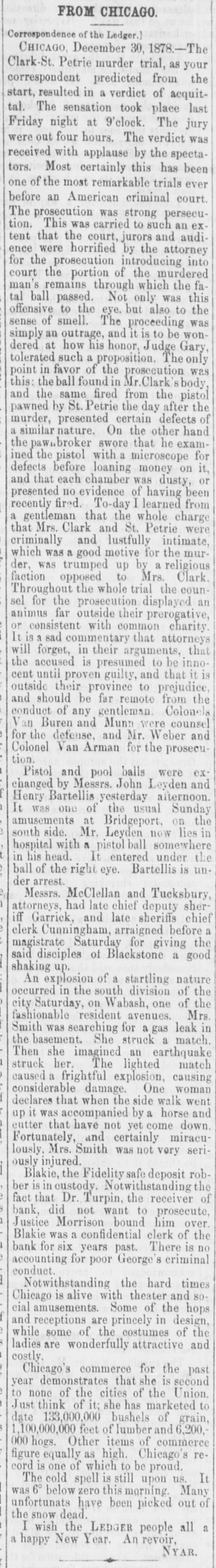# FROM CHICAGO. [Correspondence of the Ledger.] CHICAGO, December 30, 1878.-The Clark-St. Petrie murder trial, as your correspondent predicted from the start, resulted in a verdict of acquittal. The sensation took place last Friday night at 9'clock. The jury were out four hours. The verdict was received with applause by the spectators. Most certainly this has been one of the most remarkable trials ever before an American criminal court. The prosecution was strong persecution. This was carried to such an extent that the court, jurors and audience were horrified by the attorney for the prosecution introducing into court the portion of the murdered man's remains through which the fatal ball passed. Not only was this offensive to the eye, but also to the sense of smell. The proceeding was simply an outrage, and it is to be wondered at how his honor, Judge Gary, tolerated such a proposition. The only point in favor of the prosecution was this: the ball found in Mr. Clark's body, and the same fired from the pistol pawned by St. Petrie the day after the murder, presented certain defects of a similar nature. On the other hand the pawnbroker swore that he examined the pistol with a microscope for defects before loaning money on it, and that each chamber was dusty, or presented no evidence of having been recently fired. To-day I learned from a gentleman that the whole charge that Mrs. Clark and St. Petrie were criminally and lustfully intimate, which was a good motive for the murder, was trumped up by a religious faction opposed to Mrs. Clark. Throughout the whole trial the counsel for the prosecution displayed an animus far outside their prerogative, or consistent with common charity. It is a sad commentary that attorneys will forget, in their arguments, that the accused is presumed to be innocent until proven guilty, and that it is outside their province to prejudice, and should be far remote from the conduct of any gentleman. Colonels Van Buren and Munn were counsel for the defense, and Mr. Weber and Colonel Van Arman for the prosecution. Pistol and pool balls were exchanged by Messrs. John Leyden and Henry Bartellis yesterday afternoon. It was one of the usual Sunday amusements at Bridgeport, on the south side. Mr. Leyden now lies in hospital with a pistol ball somewhere in his head. It entered under the ball of the right eye. Bartellis is under arrest. Messrs. McClellan and Tucksbury, attorneys, had late chief deputy sheriff Garrick, and late sheriffs chief clerk Cunningham, arraigned before a magistrate Saturday for giving the said disciples of Blackstone a good shaking up. An explosion of a startling nature occurred in the south division of the city Saturday, on Wabash, one of the fashionable resident avenues. Mrs. Smith was searching for a gas leak in the basement. She struck a match. -Then she imagined an earthquake struck her. The lighted match caused a frightful explosion, causing considerable damage. One woman declares that when the side walk went up it was accompanied by a horse and cutter that have not yet come down. Fortunately, and certainly miraculously, Mrs. Smith was not very seriously injured. Blakie, the Fidelity safe deposit robber is in custody. Notwithstanding the fact that Dr. Turpin, the receiver of bank, did not want to prosecute, Justice Morrison bound him over. -Blakie was a confidential clerk of the bank for six years past. There is no accounting for poor George's criminal -conduct. Notwithstanding the hard times -Chicago is alive with theater and social amusements. Some of the hops and receptions are princely in design, while some of the costumes of the ladies are wonderfully attractive and costly. Chicago's commerce for the past year demonstrates that she is second to none of the cities of the Union. Just think of it; she has marketed to date 133,000,000 bushels of grain, 1,100,000,000 feet of lumber and 6,200,-000 hogs. Other items of commerce figure equally as high. Chicago's re-cord is one of which to be proud. The cold spell is still upon us. It was 6º below zero this morning. Many unfortunats have been picked out of the snow dead. I wish the LEDGER people all a a happy New Year. An revoir, NYAR.