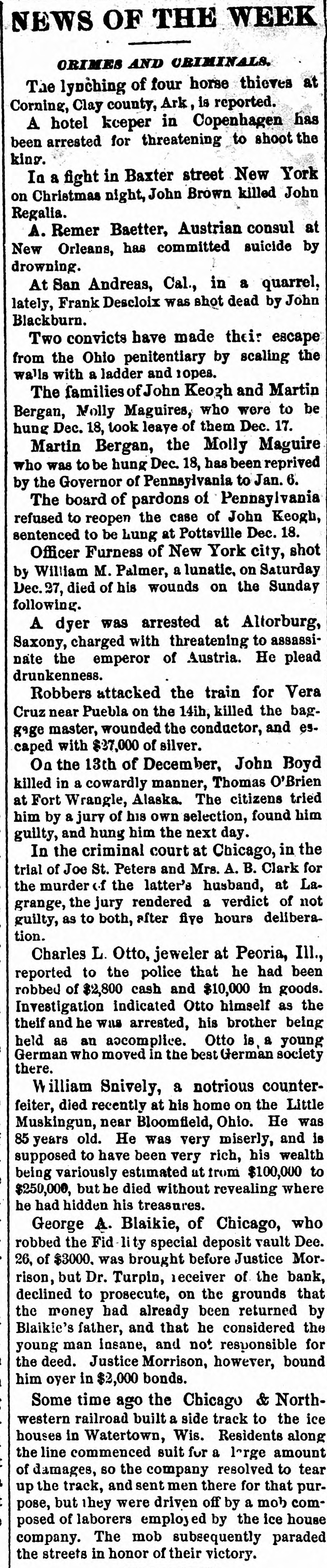 # NEWS OF THE WEEK ORIMES AND ORIMINALS. The lynching of four horse thieves at Corning, Clay county, Ark, is reported. A hotel kceper in Copenhagen has been arrested for threatening to shoot the king. In a fight in Baxter street New York on Christmas night, John Brown killed John Regalia. A. Remer Baetter, Austrian consul at New Orleans, has committed suicide by drowning. At San Andreas, Cal., in a quarrel, lately, Frank Descloix was shot dead by John Blackburn. Two convicts have made their escape from the Ohio penitentiary by scaling the walls with a ladder and ropes. The families of John Keogh and Martin Bergan, Molly Maguires, who were to be hung Dec. 18, took leave of them Dec. 17. Martin Bergan, the Molly Maguire who was to be hung Dec. 18, has been reprived by the Governor of Pennsylvania to Jan. 6. The board of pardons of Pennsylvania refused to reopen the case of John Keogh, sentenced to be hung at Pottsville Dec. 18. Officer Furness of New York city, shot by William M. Palmer, a lunatic, on Saturday Dec. 27, died of his wounds on the Sunday following. A dyer was arrested at Altorburg, Saxony, charged with threatening to assassinate the emperor of Austria. He plead drunkenness. Robbers attacked the train for Vera Cruz near Puebla on the 14ih, killed the baggage master, wounded the conductor, and escaped with $37,000 of silver. On the 13th of December, John Boyd killed in a cowardly manner, Thomas O'Brien at Fort Wrangle, Alaska. The citizens tried him by a jury of his own selection, found him guilty, and hung him the next day. In the criminal court at Chicago, in the trial of Joe St. Peters and Mrs. A. B. Clark for the murder of the latter's husband, at Lagrange, the jury rendered a verdict of not guilty, as to both, after five hours deliberation. Charles L. Otto, jeweler at Peoria, Ill., reported to the police that he had been robbed of $2,800 cash and $10,000 in goods. Investigation indicated Otto himself as the theif and he was arrested, his brother being held as an accomplice. Otto is a young German who moved in the best German society there. William Snively, a notorious counter-feiter, died recently at his home on the Little Muskingun, near Bloomfield, Ohio. He was 85 years old. He was very miserly, and is supposed to have been very rich, his wealth being variously estimated at from $100,000 to $250,000, but he died without revealing where he had hidden his treasures. George A. Blaikie, of Chicago, who robbed the Fid-lity special deposit vault Dee. 26, of $3000, was brought before Justice Morrison, but Dr. Turpin, receiver of the bank, declined to prosecute, on the grounds that the money had already been returned by Blaikie's father, and that he considered the young man insane, and not responsible for the deed. Justice Morrison, however, bound him oyer in $2,000 bonds. Some time ago the Chicago & North-western railroad built a side track to the ice houses in Watertown, Wis. Residents along the line commenced suit for a large amount of damages, so the company resolved to tear up the track, and sent men there for that purpose, but they were driven off by a mob composed of laborers employed by the ice house company. The mob subsequently paraded the streets in honor of their victory.