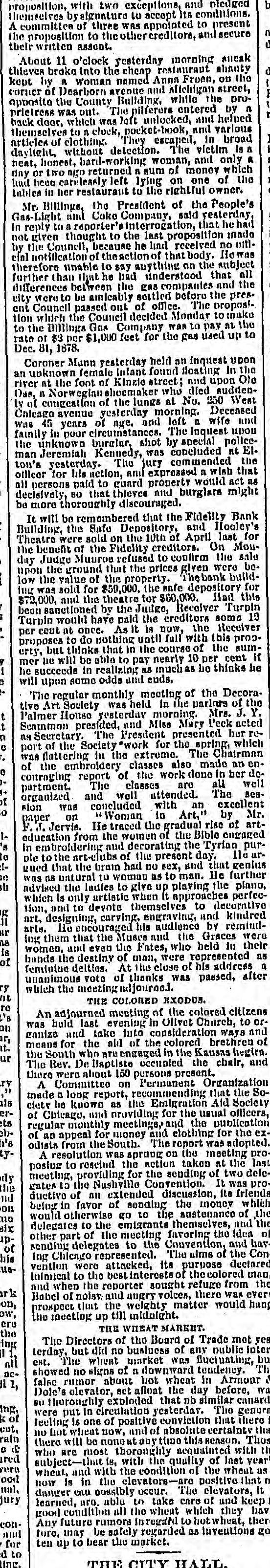 proposition, with two exceptions, and pledged themselves by signature to accept its conditions. A committee of three was appointed to present the proposition to the other creditors, and secure their written assent. About 11 o'clock yesterday morning sneak thieves broke into the cheap restaurant shanty kept by a woman named Anna Froen, on the corner of Dearborn avenue and Michigan street, opposite the County Building, while the pro- prietress was out. The pilferers entered by a back door, which was left unlocked, and helped themselves to a clock, pocket-book, and various articles of clothing. They escaped, in broad daylight, without detection. The victim is a neat, honest, hard-working woman, and only a day or two ago returned a sum of money which had been carelessly left lying on one of the tables in her restaurant to the rightful owner. Mr. Billings, the President of the People's Gas-Light and Coke Company, said yesterday, in reply to a reporter's interrogation, that he had not given thought to the last proposition made by the Council, because he had received no offi- cial notification of the action of that body. He was therefore unable to say anything on the subject further than that he had understood that all differences between the gas companies and the city were to be amicably settled before the pres- ent Council passed out of office. The proposi- tion which the Council decided Monday to make to the Billings Gas Company was to pay at the rate of $3 per $1,000 feet for the gas used up to Dec. 31, 1878. Coroner Mann yesterday held an inquest upon an unknown female infant found floating in the river at the foot of Kinzie street; and upon Ole Das, a Norwegian shoemaker who died sudden- ly of congestion of the lungs at No. 250 West Chicago avenue yesterday morning. Deceased was 45 years of age, and left a wife and family in poor circumstances. The inquest upon the unknown burglar, shot by special police- man Jeremiah Kennedy, was concluded at El- ton's yesterday. The jury commended the officer for his action, and expressed a wish that all persons paid to guard property would act as decisively, so that thieves and burglars might be more thoroughly discouraged. It will be remembered that the Fidelity Bank Building, the Safe Depository, and Hooley's Theatre were sold on the 10th of April last for the benefit of the Fidelity creditors. On Mon- day Judge Muuroe refused to confirm the sale upon the ground that the prices given were be- low the value of the property. The bank build- ing was sold for $50,000, the safe depository for $72,000, and the theatre for $60,000. Had this been sanctioned by the Judge, Receiver Turpin would have paid the creditors some 12 per cent at once. As it is now, the Receiver proposes to do nothing until fall with this prop- erty, but thinks that in the course of the sum- mer he will be able to pay nearly 10 per cent if he succeeds in realizing as much as he thinks he will upon some odds and ends. The regular monthly meeting of the Decora- tive Art Society was held in the parlors of the Palmer House yesterday morning. Mrs. J. Y. Scammon presided, and Miss Mary Peck acted as Secretary. The President presented her re- port of the Society's work for the spring, which was flattering in the extreme. The Chairman of the embroidery classes also made an en- couraging report of the work done in her de- partment. The classes are all well organized and well attended. The ses- sion was concluded with an excellent paper on "Woman in Art," by Mr. F. J. Jervis. He traced the gradual rise of art- education from the women of the Bible engaged in embroidering and decorating the Tyrian pur- ple to the art-clubs of the present day. He ar- gued that the brain had no sex, and that genius was as natural to woman as to man. He further advised the ladies to give up playing the piano, which is only artistic when it approaches perfec- tion, and to devote themselves to decorative art, designing, carving, engraving, and kindred arts. He encouraged his audience by remind- ing them that the Muses and the Graces were women, and even the Fates, who held in their hands the destiny of man, were represented as feminine deities. At the close of his address a unanimous vote of thanks was passed, after which the meeting adjourned. # THE COLORED EXODUS. An adjourned meeting of the colored citizens was held last evening in Olivet Church, to or- ganize and take into consideration ways and means for the aid of the colored brethren of the South who are engaged in the Kansas hegira. The Rev. De Baptiste occupied the chair, and there were about 150 persons present. A Committee on Permanent Organization made a long report, recommending that the So- ciety be known as the Emigration Aid Society of Chicago, and providing for the usual officers, regular monthly meetings, and the publication of an appeal for money and clothing for the ex- odists from the South. The report was adopted. A resolution was sprung on the meeting pro- posing to rescind the action taken at the last meeting, providing for the sending of two dele- gates to the Nashville Convention. It was pro- ductive of an extended discussion, its friends being in favor of sending the money which would otherwise go to the sustenance of the delegates to the emigrants themselves, and the other part of the meeting favoring the idea of sending delegates to the Convention, and hav- ing Chicago represented. The aims of the Con- vention were attacked, its purpose declared inimical to the best interests of the colored man, and when the reporter sought refuge from the Babel of noisy and angry voices, there was every prospect that the weighty matter would hang the meeting up till midnight. # THE WHEAT MARKET. The Directors of the Board of Trade met yes- terday, but did no business of any public inter- est. The wheat market was fluctuating, but showed no signs of a downward tendency. The false rumor about hot wheat in Armour & Dole's elevator, set afloat the day before,