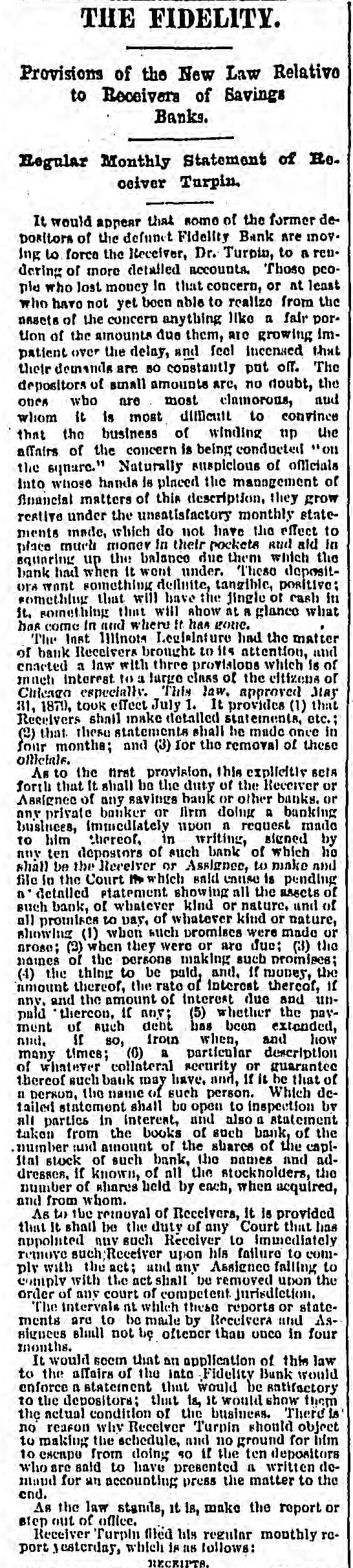 # THE FIDELITY. Provisions of the New Law Relativo to Receivera of Savings Banks. Regular Monthly Statement of Receiver Turpin, It would appear that some of the former depositors of the defunct Fidelity Bank are inov-ing to force the Receiver, Dr. Turpin, to a rendering of more detailed accounts. Those people who lost money in that concern, or at least who have not yet been able to realize from the assets of the concern anything like a fair portion of the amounts due them, are growing impatient over the delay, and feel incensed that their demands are so constantly put off. The depositors of small amounts are, no doubt, the ones who are most clamorous, and whom it is most difficult to convince that the business of winding up the affairs of the concern is being conducted "on the square." Naturally suspicious of officials into whose hands is placed the management of financial matters of this description, they grow restive under the unsatisfactory monthly state-ments made, which do not have the effect to place much money in their pockets aud aid in squaring up the balance due them which the bank had when it went under. These depositors want something definite, tangible, positive; somethiug that will have the jingle of cash in it, something that will show at a glance what has come in and where it has gone. The Inst Minota Legislature had the matter of bank Receivers brought to its attention, and enacted a law with three provisions which is of much interest to a large class of the citizens of Chicago especially. This law, approved May 31, 187), took effect July 1. It provides (1) that Receivers shail make detalled stateinents, etc.; (2) that these statements shall be made once in four months; and (3) for the removal of these ollletale. As to the first provision, this explicitly sets forth that it shall be the duty of the Receiver or Assignee of any savings bank or other banks, or any private banker or firm doing a banking businees, immediately upon a request made to him im thereof, in writing, signed by any ten depostors of such bank of which ho shall be the Receiver or Assignce, to make and file in the Court which sald entise is pending a detailed statement showing all the assets of such bank, of whatever kind or nature, und of all promises to vay, of whatever kind or nature, showing (1) when such promises were made or arose; (3) when they were or are due; (3) the names of the persons making such promises; (4) the thing to be pald, and, if money, the amount thereof, the rate of interest thereof, if any, and the amount of interest due and unpaid thercon, if any; (5) whether the payment of such dent has been extended, if so, iroin when, and how many times; (0) a particular description of whatever collateral security or guarantee thereof such bauk may have, and, if it be that of a person, the name of such person. Which de-tailed statement shall bo open to inspection by alt parties in interest, and also a statement taken from the books of such bank, of the number sud amount of the shares of the capi-ital stock of such bank, the names and ad-dresses, if known, of all the stockholders, the number of shares held by each, when acquired, and from whom. As to the renoval of Receivers, it is provided that it shall be the duty of any Court that has appointed any such Receiver to Immediately remove such Receiver upon his failure to com-ply with the act; and any Assigncc falling to comply with the act shall be removed upon the order of any court of competent jurisdiction. The intervale at which these reports or state-ments are to be made by Receivera and As-signees slull not be oftener than onco in four months. It would seem that an application of this law to the affairs of the lato Fidelity Bank would enforce a statement that would be satifactory to the depositors; that is, it would show them the actual condition of the business. There is no reason why Receiver Turpin should object to making the schedule, and no ground for him to escape from doing so if the ten depositors who are said to have presented a written de-maud for an accounting press the matter to the end. As the law stanuls, it is, make the report or step out of office. Receiver Turpin filed his regular monthly report yesterday, which is as follows: # RECRIPTS,