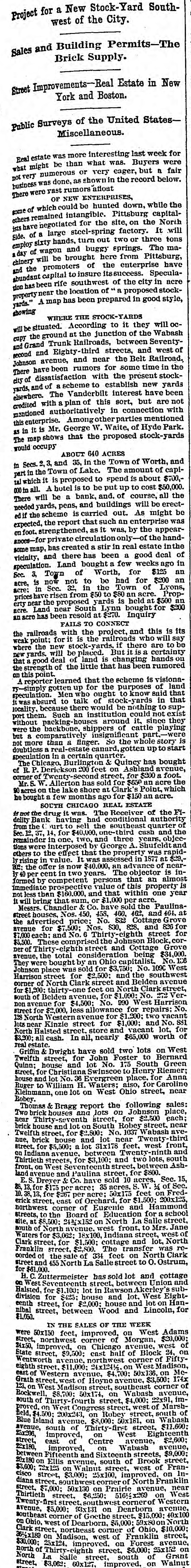 Project for a New Stock-Yard South- west of the City. Sales and Building Permits-The Brick Supply. Street Improvements-Real Estate in New York and Boston. Public Surveys of the United States- Miscellaneous. Real estate was more interesting last week for what might be than what was. Buyers were not very numerous or very eager, but a fair business was done, as shown in the record below. There were vast rumors afloat OF NEW ENTERPRISES, some of which could be hunted down, while the others remained intangible. Pittsburg capital- ists have negotiated for the site, on the North Side, of a large steel-spring factory. It will employ sixty hands, turn out two or three tons a day of wagon and buggy springs. The ma- chinery will be brought here from Pittsburg, and the promoters of the enterprise have abundant capital to insure its success. Specula- tion has been rife southwest of the city in acre property near the location of " a proposed stock- yards." A map has been prepared in good style, showing WHERE THE STOCK-YARDS will be situated. According to it they will oc- cupy the ground at the junction of the Wabash and Grand Trunk Railroads, between Seventy- second and Eighty-third streets, and west of Johnson avenue, and near the Belt Railroad, There have been rumors for some time in the city of dissatisfaction with the present stock- yards, and of a scheme to establish new yards elsewhere. The Vanderbilt interest have been credited with a plan of this sort, but are not mentioned authoritatively in connection with this enterprise. Among other parties mentioned as in it is Mr. George W. Waite, of Hyde Park. The map shows that the proposed stock-yards would occupy ABOUT 640 ACRES in Secs. 2, 3, and 35, in the Town of Worth, and part in the Town of Lake. The amount of capl- tal which it is proposed to spend is about $700,- 000 in all. A hotel is to be put up to cost $50,000. There will be a bank, and, of course, all the needed yards, pens, and buildings will be erect- ed if the scheme is carried out. As might be expected, the report that such an enterprise was on foot, strengthened, as it was, by the appear- ances for private circulation only-of the hand- some map, has created a stir in real estate in the vicinity, and there has been a good deal of speculation. Land bought a few weeks ago in Sec. 3, Town of Worth, for $125 an acre, is now not to be had for $200 an acre: in Sec. 32, in the Town of Lyons, prices have risen from $50 to $80 an acre. Prop- erty near the proposed yards is held at $500 an acre. Land near South Lynn bought for $200 an acre has been resold at $270. Inquiry FAILS TO CONNECT the railroads with the project, and this is its weak point; for it is the railroads who will say where the new stock-yards, if there are to be new yards, will be placed. But it is a certainty that a good deal of land is changing hands on the strength of the little that has been rumored on this point. A reporter learned that the scheme is visiona- ry-simply gotten up for the purposes of land speculation. Men who ought to know said that it was absurd to talk of stock-yards in that locality, because there would be nothing to sup- port them. Such an institution could not exist without packing-houses around it, since they were the backbone, shippers of cattle playing but a comparatively insignificant part, were not more than a finger. So the whole story is doubtless a real-estate canard, gotten up to start speculation in a certain quarter. The Chicago, Burlington & Quincy has bought of R. P. Derickson 200 feet on Ashland avenue, corner of Twenty-second street, for $200 a foot. Mr. S. W. Allerton has sold for $650 an acre the 90 acres on the lake shore at Clark's Point, which he bought a few months ago for $150 an acre. SOUTH CHICAGO REAL ESTATE is not the drug it was. The Receiver of the Fi- delity Bank having had conditional authority from the court to sell the southeast quarter of Sec. 12, 37, 14, for $40,000, one-third cash and the remainder in one, two, and three years, objec- tions were interposed by George A. Shufeldt and others to the effect that the property was rapid- ly rising in value. It was assessed in 1877 at $20,- 000; the offer is now $40.000, an advance of near- ly 40 per cent in two years. The objector is in- formed by competent persons that an almost immediate prospective value of this property is not less than $160.000, and that within one year it will bring that sum, or $1,000 per acre. Messrs. Chandler & Co. have sold the Paulina- street houses, Nos. 450, 458, 460, 462, and 464, at the advertised price; No. 832 Cottage Grove avenue for $7,500; Nos. 830, 828, and 826 for $7,000 each; and No. 6 Thirty-eighth street for $4.500. These comprised the Johnson Block, cor- ner of Thirty-eighth street and Cottage Grove avenue, the total consideration being $34,000. They were bought by an Ohio capitalist, No. 126 Johnson place was sold for $3,750; No. 1090 West Harrison street for $2,500; and the southwest corner of North Clark street and Belden avenue for $1,300; thirty-one feet on North Clark street, south of Belden avenue, for $1.000; No. 272 Ver- non avenue for $4,500; No. 990 West Harrison street for $2,000, less allowance for repairs; No. 128 North Western avenue for $1,200; two vacant lots near Kinzie street for $1,000; and No. 881 North Halsted street, store and vacant lot, for $3,900; all cash. In all, nearly $65,000 worth of real estate. Griffin & Dwight have sold two lots on West Twelfth street, for John Foster to Bernard Quinn; house and lot No. 175 South Green street, for Christiana Swinscoe to Henry Riemer; house and lot No. 38 Evergreen place, for Anna Ruger to William H. Waters; also, for Caroline Kleinmann, one lot on West Ohio street, near Robey. Thomas & Bragg report the following sales: Two brick houses and lots on Johnson place, near Thirty-seventh street, for $2.500 each; brick house and lot on South Robey street, near Twelfth street, for $2,800; No. 1037 Wabash ave- nue, brick hou