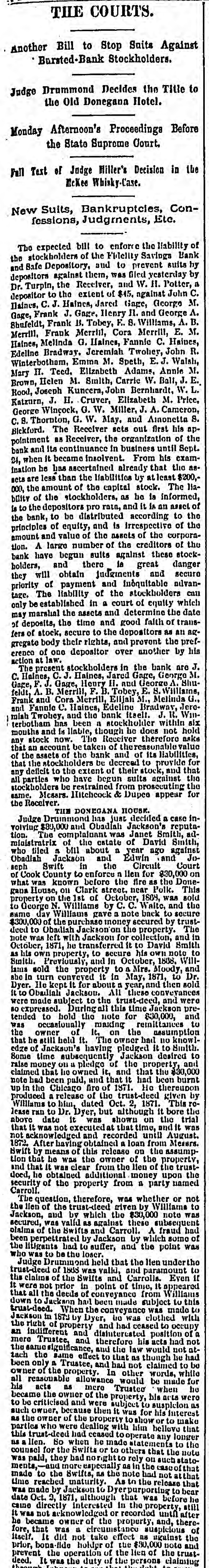 Judge Drummond has just decided a case in-volving $39,000 and Obadiah Jackson's reputa-tion. The complainant was Janet Smith, ad-ministratrix of the estate of David Smith, who tiled a bill about a year ago against Obadiah Jackson and Edwin and Jo-seph Swift in the Circuit Court of Cook County to enforce n llen for $30,000 on what was known before the fire as the Done-gana House, on Clark street, near Polk. This property on the 1st of October, 1869, was sold to George N. Williams by C. C. Waite, and the same day Williams gave a note back to secure $300,000 of the purchase inoney secured by trust-deed to Obadiah Jackson on the property. The note was left with Jackson for collection, and in October, 1871, he transferred it to David Smith as his own property, to secure his own noto to Smith. Previously, and in October, 1808, Will-lams sold the property to a Mrs. Moody, and she in turn conveyed it in May, 1871, to Dr. Dyer. Ile kept it for about a year, and then sold it to Obailialı Jackson. All these conveyances were made subject to the trust-deed, and wero so expressed. During all this time Jackson pre-tended to hold the note for $30,000, and was occasionally making remittances to the owner of it, on the assumption that he still held it. The owner had no knowl-edge of Jackson's having pledged it to Smith. Some time subsequently Jackson desired to raise money on a pledge of the property, and claimed that he owned it, and that the $30,000 note had been pald, and that it had been burnt up in the Chicago firo of 1971. He thereupon produced a release of the trust-deed given by Williams to him, dated Oct. 2, 1871. This ro-lease ran to Dr. Dyer, but although it bore the above date it was shown on the trial that it was not executed at that time, and it was not acknowledged and recorded unill August. 1872. After having obtained a loan from Meaurs. Swift by means of this release on the assump-tion that he was the owner of the property, and that it was clear from the lien of the trust-doed, he obtained additional money upon the security of the property from a party named Carroll.
