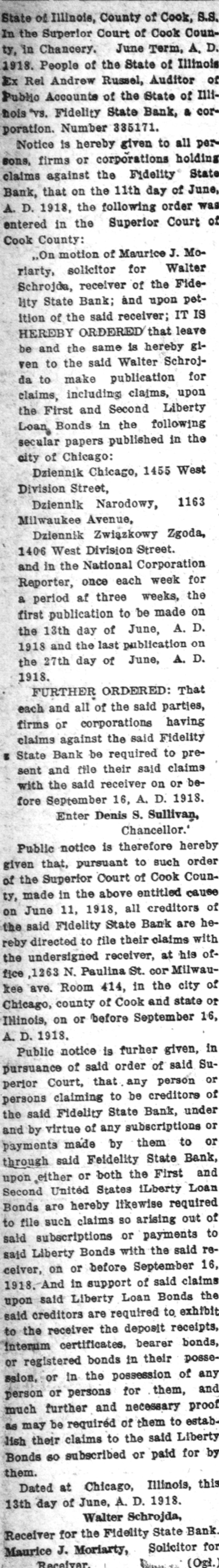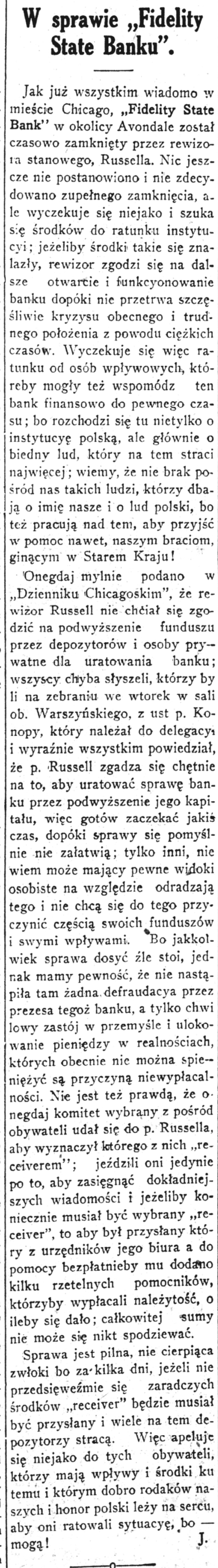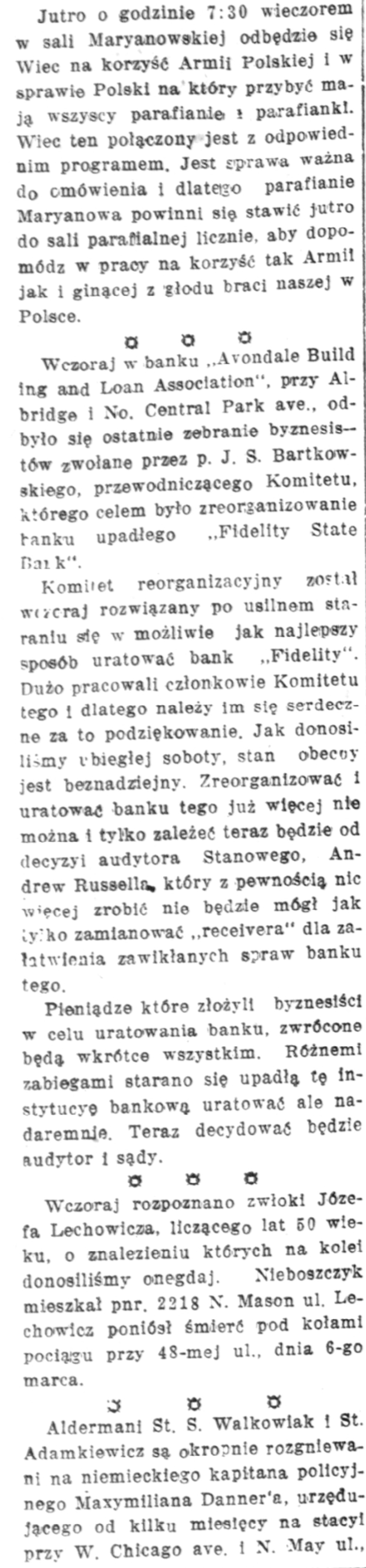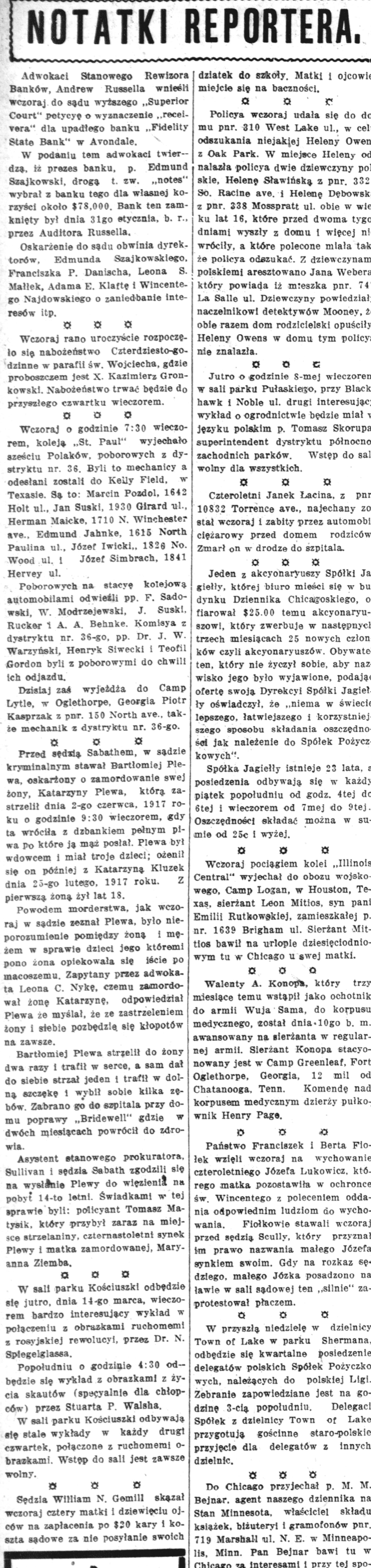 # NOTATKI REPORTERA. Dzisiaj wieczorem w hotelu La Selle, w śródmieściu odbędzie się bankiet przy udziale reprezentantów 75 narodowości zamieszkałych, w celu ponowienia swej lojalności dla sztandaru Stanów Zjednoczonych. Ze branie to i bankiet urządza liga „Na- tional Security League". Spodziewa- nem jest, że na dzisiejszy bankiet stawi się przynajmniej 1,800 osób różnych narodowości. Przewodniczą- cym będzie p. Jan F. Smulski, prezes banku „Northwestern Trust and Sa- vings Bank". Bankiet rozpocznie się o godz. 6:30 wieczorem. Bilety nabyć można jeszcze przy drzwiach sali ban- kietowej. Do hali Warszyńskiego przy No. Cen tral Park avenue i Wolfram ulicy, ze- brało się wczoraj wieczorem około 750 akcyonaryuszy i depozytorów banku u- padłego Fidelity State Bank. Zebranie to zagaił Wincenty Najdowski - na przewodniczącego powołano adwokata Piotra H. Schwabę. Do zdania raportu z tego co słyszeli u rewizora i u p. Smulskiego, powoła- no p. Jana Konopę. Powiedział on iż tak Stanowy rewizor bankowy Russell jak i p. Jan F. Smulski uważają to za rzecz niemożliwą uchronienie banku raz już upadłego i w takim stanie jak bank Fidelity. Rewizor Russell nawet słyszeć nie chciał o przyjęciu owych ze- branych $50,000 w celu spłacenia dłu- gów tegoż banku. Depozytorzy banku tego otrzymać mają nie mniej jak 50c na dolarze a może i nawet 65c na dolarze. Podczas posiedzenia przyszło także do paru u- tarczek dość ostrych ale obeszło się bez bójki. Wybrano Komitet składający się z adwokatów Piotra H. Schwabę i Józefa Lisak, oraz pp. Szymona Sikor- skiego, Jana F. Bartkowskiego i Kirch nera, w celu udania się do rewizora Russella dzisiaj by ten z pomiędzy nich wybrał „receivera" dla depozytorów banku Fidelity. Komitet ma zdać ra- port w przyszłą sobotę. Administracye wszystkich Towa- rzystw na Jackowie zbiorą się w przy- szłą niedzielę, dnia 10-go b. m., popo- łudniu o godzinie 3-ciej w sali parail nej w celu postarania się o flage ho- norową (service flag) i wywieszenia jej dla uczczenia naszych wojaków z Jackowa. Na zebranie to stawić się ma- ją reprezentanci wszystkich Towa- rzystw tak męskich jak i żeńskich na Jackowie. Dwóch dzisiaj znajduje się w szpita- lu „Bridewell" a dwóch na policyi pod kluczem a powodem tego jest bójka ja- ka zaszła wezoraj w domu przy Elston ave. Historya taka: Bolesław Szcze- pański, i Anna Krysiak, żona Jana Kry- siaka, matka trojga dzieci, mieszkali pnr. 1430 Fleetwood ulica przez jakiś czas; naraz naprzykrzyło się życie ta- kie Annie Krysiak i tak powróciła do męża i dzieci, rzeczy swoje zostawiając tymczasem w domu Szepańskiego. Mąż Krysiakowej wraz z Janem Olesiewi- czem z pnr. 1001 No. Ashland avenue udał się do domu Szozepańskiego i roz- biwszy zamek weszli do domu jego aby zabrać z powrotem rzeczy należące de Krysiakowej. W czasie jak to się dzia- ło ktoś dał znać o „mufówce" Szeze- pańskiemu do fabryki gdzie on praco- wał. Przybiegł Szczepański i począł okładać obu rurą żelazną po głowie, tamci też, że krew nie woda, poczęli nawzajem Szczepańskiego okładać ku- łakami. Zakończyło się na tem, że Kry- siakowie odstawieni zostali na stacyę policyjną przy Chicago ave. a Szcze- pańskiego i Olesiewiczą ambulansem za wieziono do szpitali w „Brajdwili" - gdzie lekarze orzekli iż obaj mają szan sę wyzdrowienia. ran na głowie i lewej nodze; prz pomocy innego obywatela zaszedł do kancelaryi Dra Jana Bony, który u- dzielił mu pierwszej pomocy lekar- skiej. Wczoraj o godzinie 3-ciej rano włamali się rabusie do wyszynku ob. Kuczkiewicza, nar, 118-tej ul. i Mi- chigan ave., i zabrali z kasy $6.50 gotówce. Franciszek Potulski przyznał się wczoraj w sądzie przed sędzią Saba- them do zastrzelenia swego przyja- ciela, Wojciecha Zeli. W domu pnr. 2649 W. 21-sza ul., ale powiada, że uczynił to w obronie własnej. Zela doniósł policyi że Potulski jest „slakierem" a ten pono w złości za- bił Zelę. Sprawę Potulskiego roz- strzygnie dzisiaj ława przysięgłych. Stan żądać będzie kary śmierci. Wieczór z powodu 10-letniego ist- nienia Towarzyswa „Promień" od- będzie się w sobotę, dnia 9go lute- go, b. r., w sali Związku Polek. Pro- gram wieczoru jest nadzwyczaj uro- maicony. Oprócz części muzykalno- wolkalnej, zostanie wystawiony ury- wek z „Dziadów" arcydzieła naszej poezyi. Dochód z uroczystości ja- ko zwykle, tak i tym razem przezna- cza Tow. „Promień" na głodnych w Czczyźnie. Wczoraj o godzinie 9:30 rano w kościele Najśw. Maryi Panny w Bridgeporcie odbył się ślub panny Rozalii Tomaszewskiej z panem Ja- nem Kamka. Ślubu dzielił i Mszą św. na intencyę nowożeńców odprawił X. S. Sehnke. Drużbowali: panna Maryanna Ke- bierska, kuzynka pani młodej, z pa- nem Stanisławem J. Kamka, kuzy- nem pana młodego; panna Janina Tomaszewska, kuzynka pani młodej, z panem Stanisławem Wojciechow- skim. Państwo Kamka zamieszkali na stałe pnr. 1005 W. 32ga ulica. Na czternaście lat więzienia skaza- ny wczoraj został Piotr Puszczyński liczący lat 19 wieku, za branie u- działu w zamordowaniu Adolfa Se- dingera, właściciela składu żywności. Edwarda Bolla, robotnik pracujący dla kompanii gazowej, w czasie na- prawiania rur gazowych w sutere- nach budynku pnr. 1322 Milwaukee ave., zaczadzony został uchodzącym gazem. Oddano go przyjaciołom jego którzy nieszczęśliwym zaraz się za- cpiekowali. Sędzia Edmund K. Jarecki oddał wczoraj Stefanowi Masaresowi z In- diana Harbor, Ind., szesnaście 10- dolarówek jakie od niego wyłudził Paweł Engler i Łukasz Król, sprze- dając mu maszynkę do robienia pie- niędzy. Pieniądze te znalazła policyja w kieszeniach dwóch wyżej wymie- nionych naciągaczy. Sprawę ich odło- żono na później. # TELEGRAMY KRAJOWE # DALSZE ATAKI NA SEKR. BAKERA. Waszyngton, 6. lutego. — Są widoki, że debaty w senacie trwać będą czas nieogr