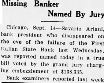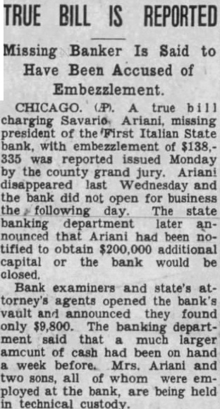 CHICAGO. (AP). true bill charging Savario Ariani, missing president of the First Italian State bank, with embezzlement of $138,335 was reported issued Monday by the county grand jury. Ariani disappeared last and the bank did not open for business the following day. The state banking department later announced that Ariani had been notified to obtain $200,000 additional capital or the bank would be closed. Bank examiners and state's attorney's agents opened the bank's vault and announced they found only $9,800. The banking department said that much larger amount of cash had been on hand a week before. Mrs. Ariani and two sons, all of whom were employed at the bank, are being held in technical custody.