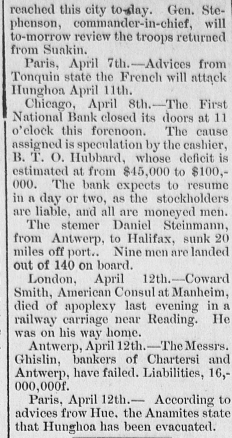 Gen. Stereached this city to-day. phenson, commander-in-chief, will to-morrow review the troops returned from Suakin. Paris, April 7th.-Advices from Tonquin state the French will attack Hunghoa April 11th. Chicago, April 8th.-The First National Bank closed its doors at 11 o'clock this forenoon. The cause assigned is speculation by the cashier, B. T. O. Hubbard, whose deficit is estimated at from $45,000 to $100,000. The bank expects to resume in a day or two, as the stockholders are liable, and all are moneyed men. The stemer Daniel Steinmann, from Antwerp, to Halifax, sunk 20 miles off port.. Nine men are landed out of 140 on board. London, April 12th.-Coward Smith, American Consul at Manheim, died of apoplexy last evening in a railway carriage near Reading. He was on his way home. Antwerp, April 12th.-The - Messrs. Ghislin, bankers of Chartersi and Antwerp, have failed. Liabilities, 16,000,000f. Paris, April 12th.- According to advices frow Hue, the Anamites state that Hunghoa has been evacuated.