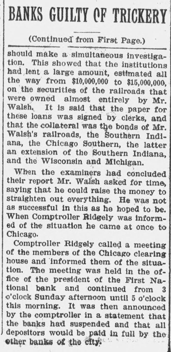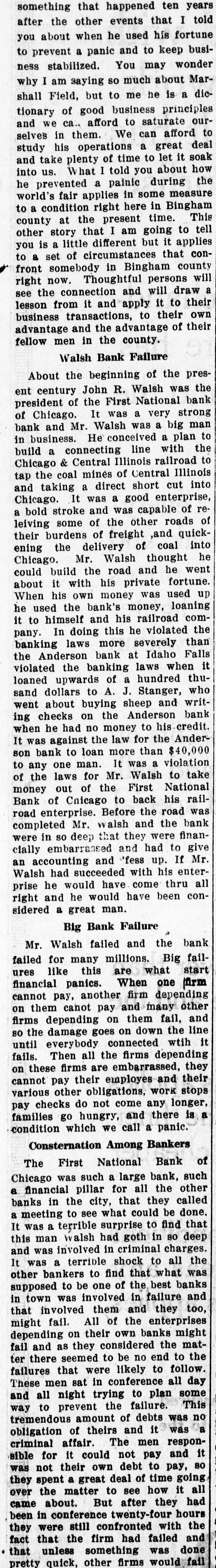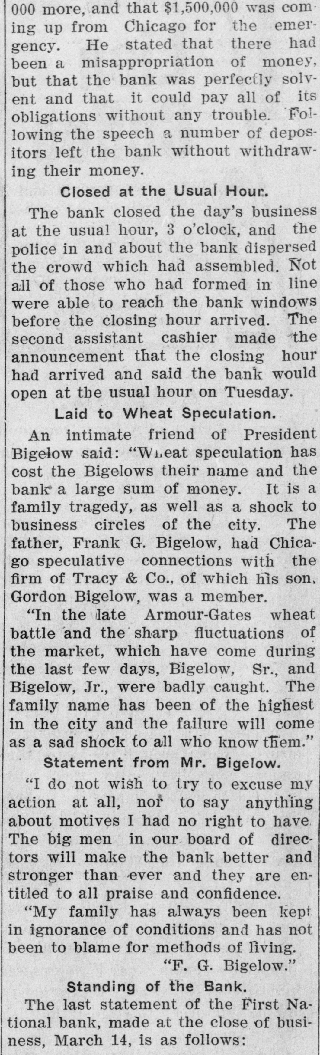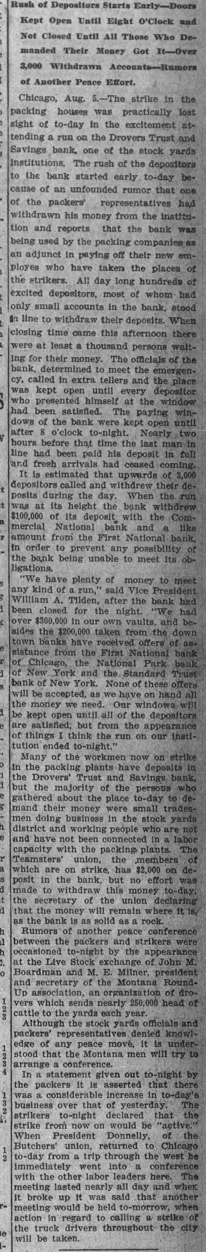 Rush of Depositors Starts Early-Doors and Kept Open Until Eight O'Clock DeClosed Until All Those Who i manded Not Their Money Got It-Over [ 3,000 Withdrawn Accounts-Rumors Another Peace Effort. , ) of Aug. 5.-The strike in lost the e Chicago, houses was practically ate packing to-day in the excitement and sight of a run on the Drovers Trust yards tending bank, one of the stock Savings The rush of the depositors beinstitutions. bank started early to-day that one to the of an unfounded rumor had cause packers' representatives instituof the his money from the bank was withdrawn reports that the as tion and used by the packing companies new embeing adjunct in paying off their places of an who have taken the of ployes etrikers. All day long hundreds whom had the depositors, most of stood excited small accounts in the bank, When 1 only line to withdraw their deposits. there a in time came this afternoon waitclosing were at least a thousand officials persons of the their money. The the emergening for determined to meet and the place bank, called in extra tellers every depositor D cy, was kept open himself until at the window winwho presented The paying until V had been satisfied. bank were kept Nearly open two dows of 8 o'clock the to-night. the last man in before that his deposit in had been ceased line hours after paid time had coming. 3,000 full and fresh arrivals upwards of t is estimated that withdrew their dedepositors day. When t posits its height the the a It at during called the and with bank withdrew the Com- run was of its deposit and a like r mercial $100,000 National bank National bank, amount from the First any possibility ob- of the in order bank to being prevent unable to meet its to meet S 5 ligations. "We have plenty of said money Vice President had a any kind A. of Tilden, a run," after night. the bank "We had K William closed for the vaults, and bebeen $300,000 in our taken own from the down e sides over the $200,000 received offers of bank asr town banks have the First National bank d sistance Chicago, from the National Standard Park Trust S of York and the of these offers d bank of New be of accepted, New York. as we None Our have windows on hand will all e will the money we until need. all of the depositors be kept open but from the appearance instiof ended to-night." on now are things satisfied, I think the run on our strike o 1 tution Many of the workmen have deposits in d e in the packing Trust plants and Savings persons bank, who the Drovers' majority of the to-day to g but about the small their money the stock h mand gathered the business place were in who are trades- yards de- not e men doing and working connected people in a labor r district have not been plants. The of a capacity and with union, the packing the members $2,000 on deS in Teamsters' on strike, has effort was d this which are the bank, but money no to-day, t d posit to withdraw the union declaring is, made the secretary of will remain where it h that the money is as solid as a rock. conference 1 as the bank of another peace strikers were h Rumors the packers and appearance d. o between occasioned o-night exchange by the of John M. at the Live and Stock M. E. Montana Milner, president Round- dro1 Boardman secretary of the organization of 2 3 and association, an nearly 250,000 head of Up which sends each year. cattle vers to the yards yards officials knowl- and 2 that stood Althoupepresentatives the stock move, denied it is under- try to 3 packers' edge of any the peace Montana men will 4 by to-night 1 packers it increase arrange In a statement a conference. is given asserted out in that to-day's there 3 The the a considerable of yesterday. over declared was business to-night that would be that "active." the the 1 2 When union, the strike strikers from President now on returned Donnelly, to Chicago of west he from a trip a The to-day Butchers' immediately went through into leaders conference here. other labor day and when with the lasted nearly said all that another when meeting up it was to-morrow, of the it broke would be held calling a strike city e will be taken. meeting action truck in regard drivers to throughout the