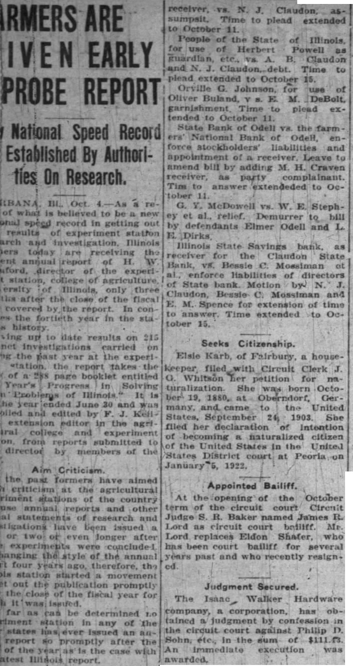 RMERS ARE IVEN EARLY PROBE REPORT National Speed Record Established By Authorities On Research. of what is believed to be new onal speed record in getting out results of experiment station E. Dirks arch and investigation. Illinois )ers today are receiving the ent annual report of H. W uford, director of the experi station, college of agriculture ersity of Illinois, only three the after the close of the fiscal covered by the report. In con es the fortieth year in the sta tober ving up to date results on 215 net investigations carried on hg the past year at the experi station. the report takes the of 288 page booklet entitled Year's Progress in Solving in Problems of Illinois. It is he year ended June 30 and was oiled and edited by F. J. Kell extension editor in the agri tral college and experiment from submitted to director by members of the Aim Criticism. the past formers have aimed 21 criticism at the agricultural rimênt stations of the country use annual reports and other ial statements of research and stigations have been issued or two of even longer after experiments were conclude hanging the style of the annual it four years ago, therefore, the bis station started a movement et out the publication promptly the close of the fiscal year for It was issued. far as can be determined no riment station In any of the states has, ever Issued an anreport so promptly after the of the year as is the case with atest Illinois report. receiver, vs. N. J. Claudon, assumpsit, Time to plead extended to October 11. People of the State of Illinois, for use of Herbert Powell as guardian, etc., vs. A. B. Claudon and N. J. Claudon, debt. Time to plead extended to October 15. Orville G. Johnson, for use of Oliver Buland, E. M. DeBolt, garnishment Time to plead ex tended to October 11. State Bank of Odell V8. the farm ers' National Bank of OdeH, en force stockholders' liabilities and appointment of a receiver. Leave to amend bill by adding M. H. Craven receiver, as party complainant. Tim to answer extendeded to October G. Y, McDowell VS. W. E. Stephey et al., relief. Demurrer to bill by defendants Elmer Odell and L. Illinois State Savings bank, as receiver for the Claudon State Bank, VS. Bessie C. Mossiman at al. enforce liabilities of directors of State bank. Motion by N. J. Claudon, Bessie C. Mossiman and E. M. Spence for extension of time to answer, Time extended to Oc- Seeks Citizenship. Elsie Karb, of Fairbury, a housekeeper filed with Circuit Clerk J. G. Whitson her petition for na turalization She was born October 19, 1880, at Oberndorf, Ger many, and came to the United States, September 24, 1903. She filed her declaration of Intention of becoming naturalized citizen of the United States in the United States District court at Peoria on Appointed Bailiff. At opening of the October term of the circuit court Circuit Judge S. R. Baker named James R. Lord as circuit court bedliff. Mr Lord replaces Eldon Shafer, who has been court bailiff for several years past and who recently resign- Judgment Secured. The Isane, Walker Hardware company, a corporation, has obtained a judgment by confession in the circuit court against Philip D. Sohn, éte, In the sum of $111.03 An immediate execution was