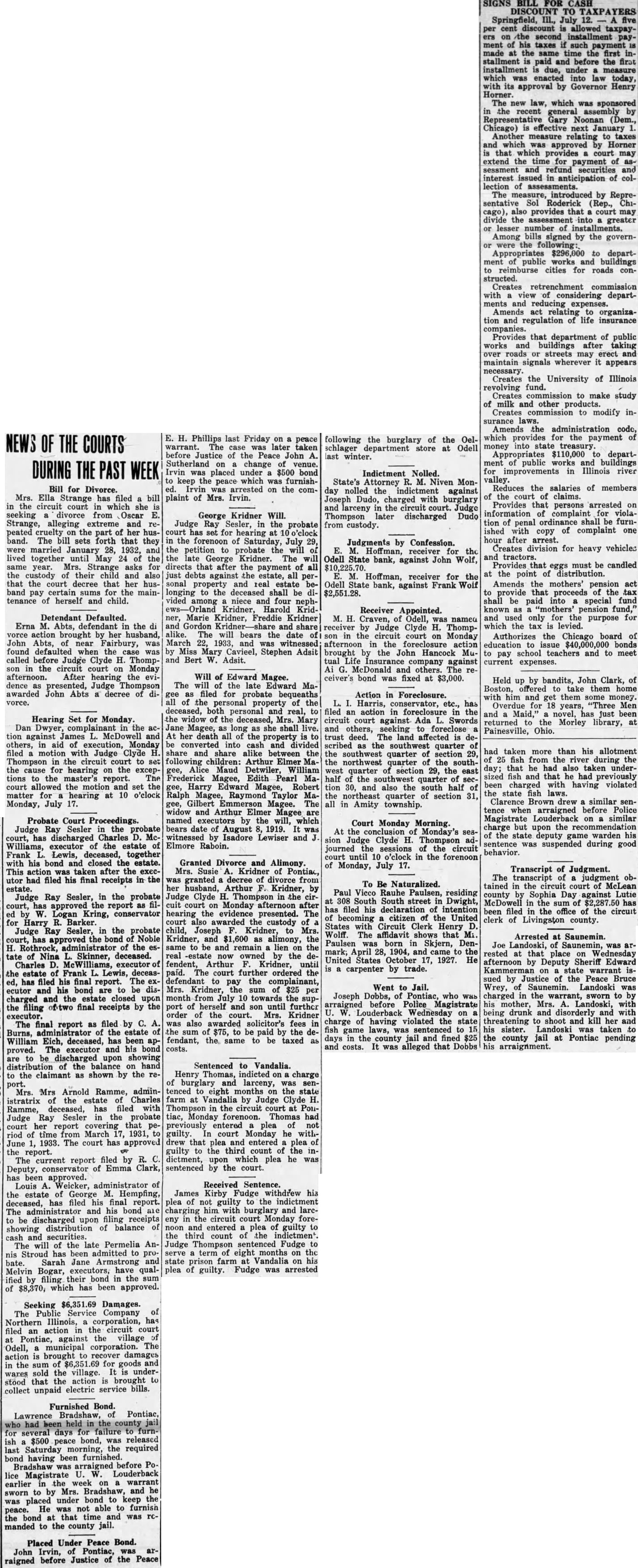 SIGNS BILL FOR CASH DISCOUNT TO TAXPAYERS Springfield, III., July 12. cent discount allowed taxpaysecond installment payment of his taxes such made at the same time first stallment paid and before the first installment due, under measure which was enacted into law today, approval by Governor Henry Horner. The new law, which was sponsored recent general assembly by Representative Gary Noonan (Dem., Chicago) effective next January Another measure relating to taxes which approved Horner that which provides court may extend time for payment sessment and refund securities and interest issued in anticipation of lection The measure, introduced by Representative Roderick (Rep., Chiprovides that court may divide the into greater lesser number of installments. Among bills signed by the governwere following: Appropriates $296,000 to department public works buildings to reimburse cities for roads structed. Creates retrenchment commission with view considering departments and reducing expenses. Amends relating organization and regulation of life insurance companies. Provides that department of public works buildings after taking over roads streets may erect maintain signals wherever appears necessary. Creates the University of Illinois revolving fund. Creates commission to make study of milk and other products. Creates commission modify insurance laws. Amends administration code, which provides payment money into state treasury. $110,000 department public works buildings for improvements in Illinois river valley. Reduces the salaries of members of the court of claims. Provides that persons arrested on information complaint for violation of penal shall be furnished with copy of complaint one hour after arrest. Creates division for heavy vehicles tractors Provides that eggs must be candled at the point of distribution. Amends the mothers' pension act provide that proceeds of the tax shall be paid into special fund known pension fund,' and only for purpose for which the tax levied. Authorizes the Chicago board of education issue $40,000,000 bonds to school teachers and to meet current expenses.