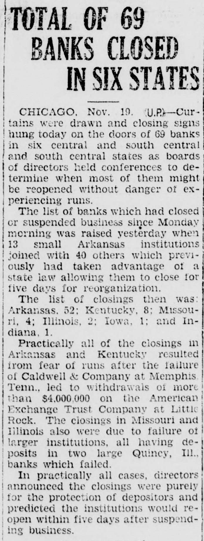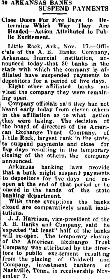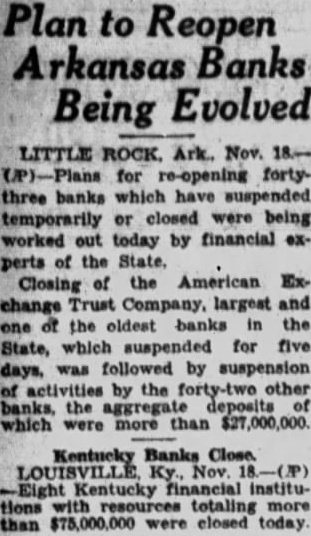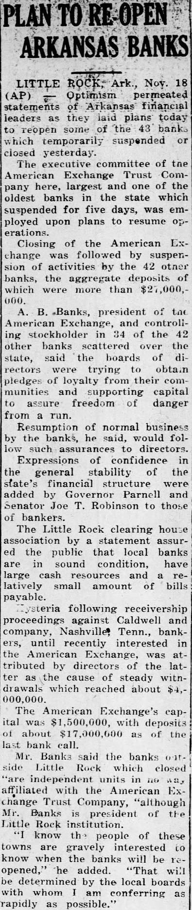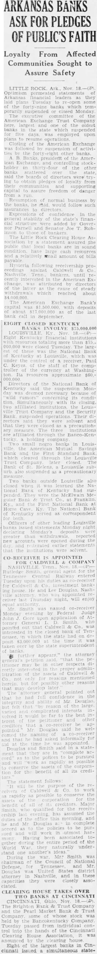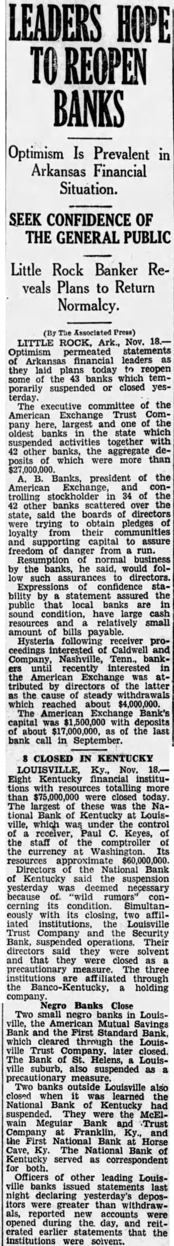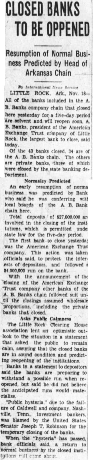 FRUIT MARKETS (B)/ The United Press) LITTLE ROCK (Ark.) Nov. 18 BAY FRUITS The closing of fifty-nine banks in central and south states generally was considered by leading financiers to-day as for protection of depositors and predictions were that most of the banks would reopen when their boards were assured the institutions were free from danger of SALES IN FALL OFF In Arkansas, where thirty-nine SAN FRANCISCO, Nov. 18.-(P) suspended business temporSales of Broadway Department arily yesterday and four others Stores, Inc. of Los Angeles for the were closed by the state, an optifiscal year ending October 31st mistic was issued last were $18,532,000 falling moderately night by A. B. Banks, president of short of the the previous the American Exchange Trust Comyear, which was $18,983,000 pany Little Rock's largest bank Two other Arkansas banks MAIL ORDER FIRM DIVIDEND closed to-day on order of the state banking department and third tors of Sears, and Com- member of the Banks pany a per stock announced it has suspended for dividend would be paid February five days 1st, 1931 and an identical dividend Is Heavy Stockholder May 1st. 1931. to Banks, who is heavy record January 10th and April 10th in outside Arkansas banks, said respectively The company paid he was concerned with local boards stock dividends during per and predicted an early resumption each of the 1930 quarters. of normal The recent failure of Caldwell and Company Nashville, Tenn. ANGELES FRUIT was blamed Senator Joseph T Robinson for the temporary ing of the Arkansas institutions while in Missouri and Illinois the closing of six small institutions also was due to the preclosing larger banks Robinson said the Caldwell and Company had created hysin withdrawals of $4,000,000 from the American Exchange Trust Company within ten days and made necessary the temporary Most of the other Arkansas banks which closed were affiliated with the American Exchange Trust, which was the first close. All Held Solvent Besides the thirty-nine banks in Arkansas, six banks were yesterday in Kentucky four in Missouri two in Illinois and one Iowa. practically all cases it was emphasized the banks were solvent and that the closings were rather than forced Navels actions. The closing of banks Lisko Downing, La Salle La Grange and by the closing last week of two Quincy Ill banks, with which the Missouri had deposIted surplus funds. The two Illinois banks at Clayton and Timewell Val also were closed as result of the the institutions LIVESTOCK MARKET In Kentucky the closing of six banks at Louisv and Franklin LOS ANGELES LIVESTOCK also was said to a protective YORK DRIED FRUIT measure prevent runs which threatened because of rumors followed the failure of Caldwell and at Nashville HAY MARKET LOS ANGELES HAY POULTRY MARKETS