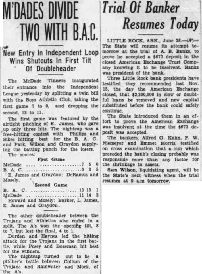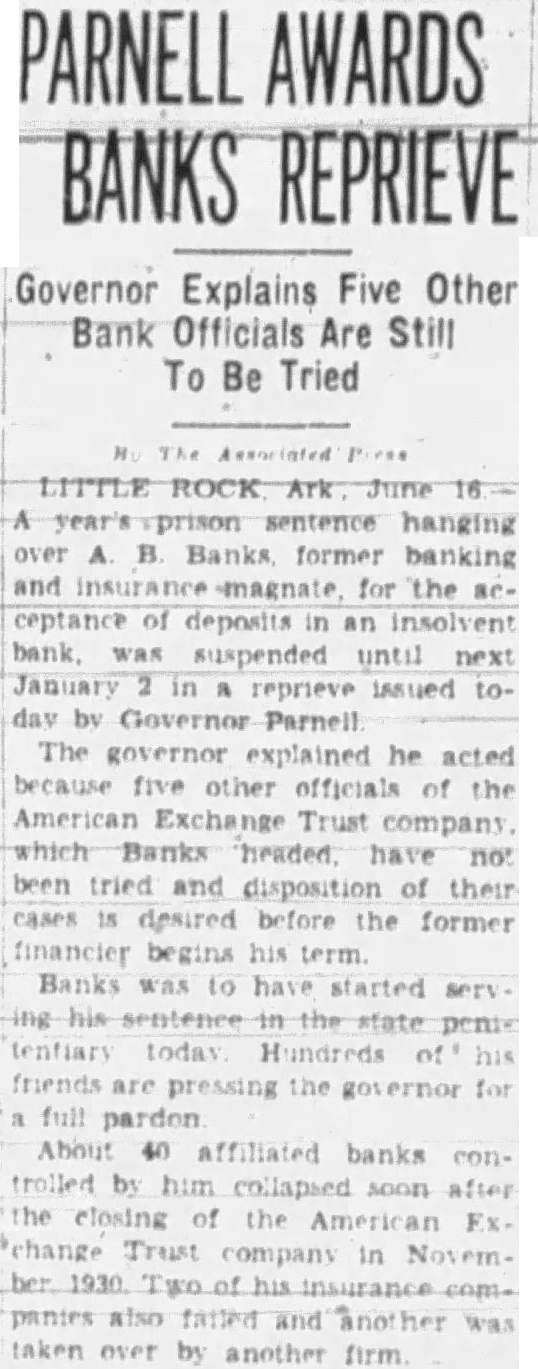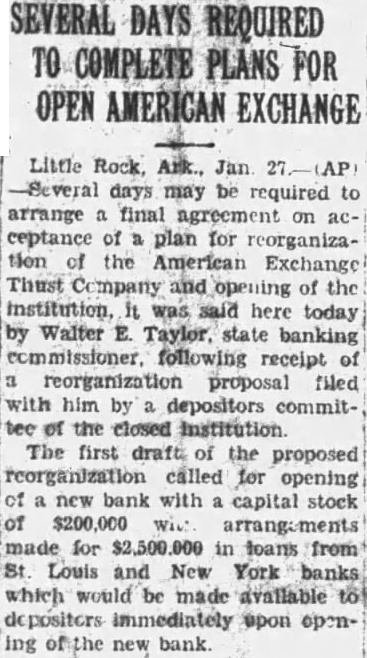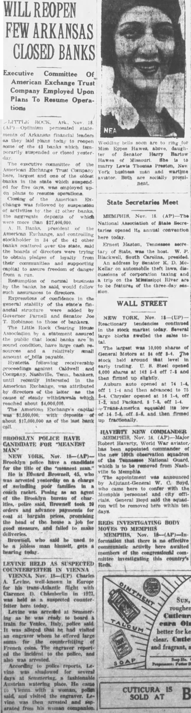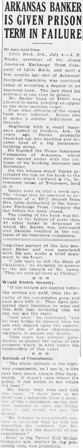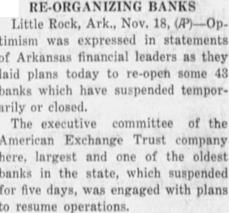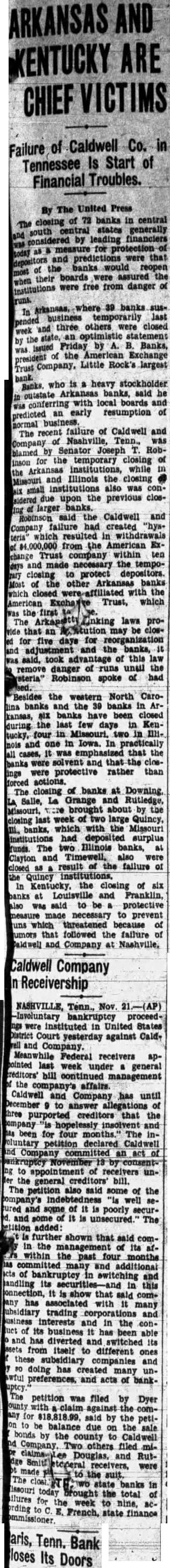 FRUIT MARKETS (B)/ The United Press) LITTLE ROCK (Ark.) Nov. 18 BAY FRUITS The closing of fifty-nine banks in central and south states generally was considered by leading financiers to-day as for protection of depositors and predictions were that most of the banks would reopen when their boards were assured the institutions were free from danger of SALES IN FALL OFF In Arkansas, where thirty-nine SAN FRANCISCO, Nov. 18.-(P) suspended business temporSales of Broadway Department arily yesterday and four others Stores, Inc. of Los Angeles for the were closed by the state, an optifiscal year ending October 31st mistic was issued last were $18,532,000 falling moderately night by A. B. Banks, president of short of the the previous the American Exchange Trust Comyear, which was $18,983,000 pany Little Rock's largest bank Two other Arkansas banks MAIL ORDER FIRM DIVIDEND closed to-day on order of the state banking department and third tors of Sears, and Com- member of the Banks pany a per stock announced it has suspended for dividend would be paid February five days 1st, 1931 and an identical dividend Is Heavy Stockholder May 1st. 1931. to Banks, who is heavy record January 10th and April 10th in outside Arkansas banks, said respectively The company paid he was concerned with local boards stock dividends during per and predicted an early resumption each of the 1930 quarters. of normal The recent failure of Caldwell and Company Nashville, Tenn. ANGELES FRUIT was blamed Senator Joseph T Robinson for the temporary ing of the Arkansas institutions while in Missouri and Illinois the closing of six small institutions also was due to the preclosing larger banks Robinson said the Caldwell and Company had created hysin withdrawals of $4,000,000 from the American Exchange Trust Company within ten days and made necessary the temporary Most of the other Arkansas banks which closed were affiliated with the American Exchange Trust, which was the first close. All Held Solvent Besides the thirty-nine banks in Arkansas, six banks were yesterday in Kentucky four in Missouri two in Illinois and one Iowa. practically all cases it was emphasized the banks were solvent and that the closings were rather than forced Navels actions. The closing of banks Lisko Downing, La Salle La Grange and by the closing last week of two Quincy Ill banks, with which the Missouri had deposIted surplus funds. The two Illinois banks at Clayton and Timewell Val also were closed as result of the the institutions LIVESTOCK MARKET In Kentucky the closing of six banks at Louisv and Franklin LOS ANGELES LIVESTOCK also was said to a protective YORK DRIED FRUIT measure prevent runs which threatened because of rumors followed the failure of Caldwell and at Nashville HAY MARKET LOS ANGELES HAY POULTRY MARKETS