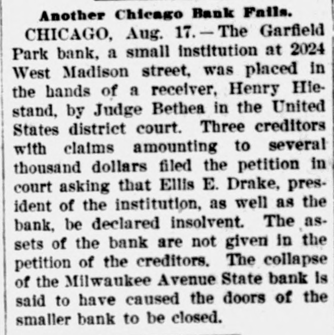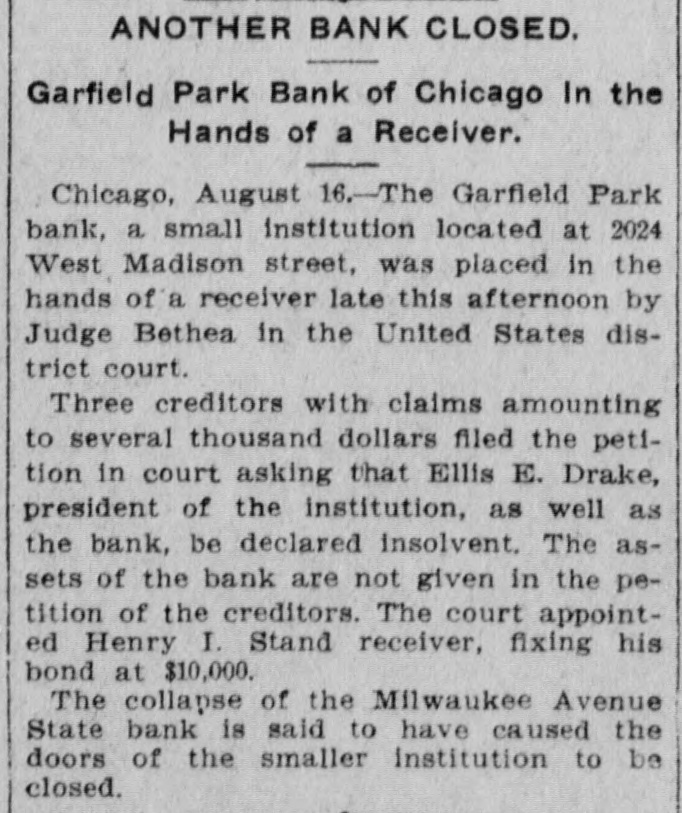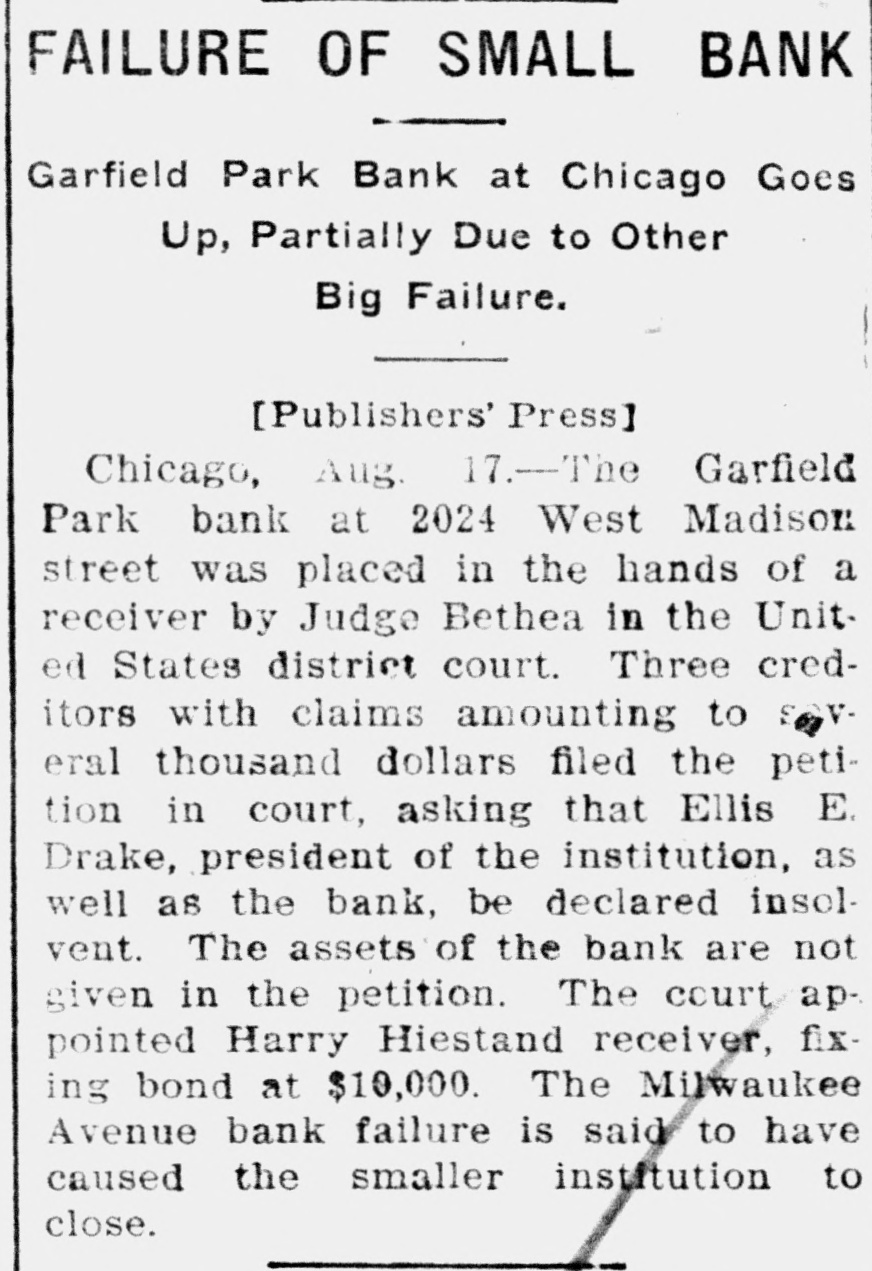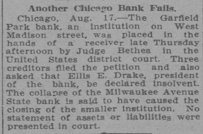 Another Chicago Bank Fails. CHICAGO, Aug. 17. - The Garfield Park bank, a small institution at 2024 West Madison street, was placed in the hands of a receiver, Henry Hiestand, by Judge Bethea in the United States district court. Three creditors with claims amounting to several thousand dollars filed the petition in court asking that Ellis E. Drake, president of the institution, as well as the bank, be declared insolvent. The assets of the bank are not given in the petition of the creditors. The collapse of the Milwaukee Avenue State bank Is said to have caused the doors of the smaller bank to be closed.