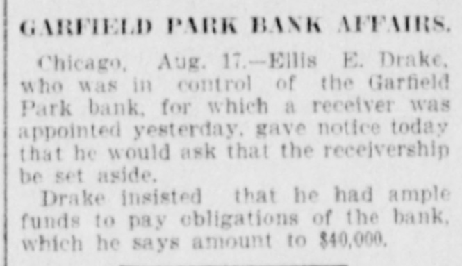 ANOTHER BANK CLOSED. Milwaukee Avenue (Chicago) Bank Failure Takes Another With It. Chicago, Aug. 17-The Garfield Park bank, a small institution located at 2024 West Madison street, was placed in the hands of a receiver late yesterday afternoon by Judge Bethea in the district court. The creditors, with claims amounting to several thousand dollars, filed the petition in court asking that Ellis E. Drake, president of the institution, as well as the bank, be declared insolvent. The assets of the bank are not given in the petition of the creditors. The court appointed Henry Hiestand receiver, fixing his bond at $10,000. The collapse of the Milwaukee Avenue State bank is said to have caused the doors of the smaller institution to be closed. President Drake declared last night that he was solvent and if given time to dispose of certain securities he would be able to pay all of the creditors in full.