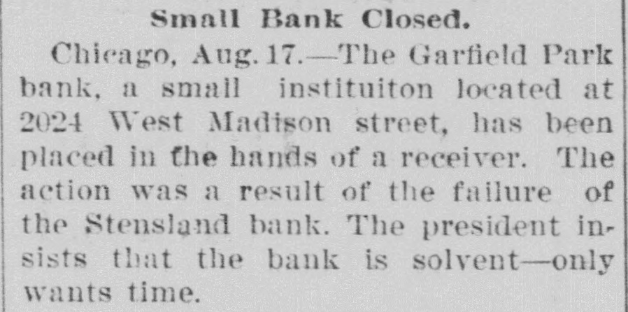 The Garfield Park bank ... was placed in the hands of a receiver late this afternoon by Judge Bethea ... The court appointed Henry I. Stand (Hiestand) receiver, fixing his bond at $10,000. The collapse of the Milwaukee Avenue State bank is said to have caused the doors of the smaller institution to be closed.