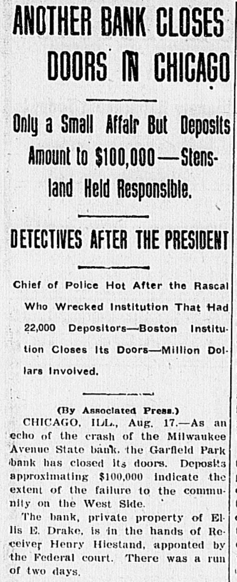 ANOTHER BANK CLOSES DOORS IN CHICAGO Only a Small Affair But Deposits Amount to $100,000-Stensland Held Responsible. DETECTIVES AFTER THE PRESIDENT Chief of Police Hot After the Rascal Who Wrecked Institution That Had 22,000 Depositors-Boston Institu. tion Closes Its Doors-Million Dol. lars Involved. (By Associated Press.) CHICAGO, ILL., Aug. 17.-As an echo of the crash of the Milwaukee Avenue State bank. the Garfield Park bank has closed its doors. Deposits approximating $100,000 indicate the extent of the failure to the community on the West Side. The bank, private property of Ellis E. Drake, is in the hands of Receiver Henry Hiestand, apponted by the Federal court. There was a run of two days.