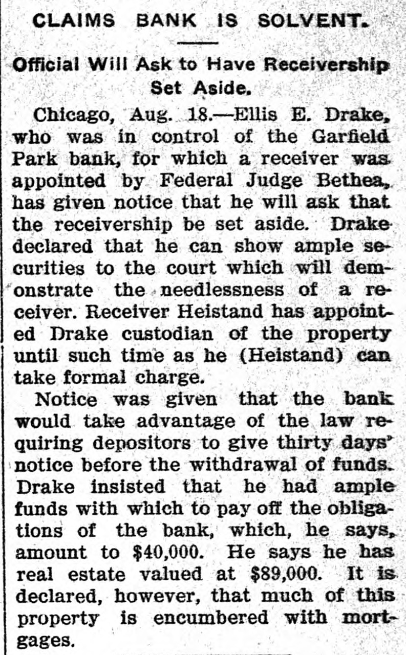 CLAIMS BANK IS SOLVENT. Official Will Ask to Have Receivership Set Aside. Chicago, Aug. 18.-Ellis E. Drake, who was in control of the Garfield Park bank, for which a receiver was appointed by Federal Judge Bethea, has given notice that he will ask that the receivership be set aside. Drake declared that he can show ample securities to the court which will demonstrate the needlessness of a receiver. Receiver Heistand has appointed Drake custodian of the property until such time as he (Heistand) can take formal charge. Notice was given that the bank would take advantage of the law requiring depositors to give thirty days' notice before the withdrawal of funds. Drake insisted that he had ample funds with which to pay off the obligations of the bank, which, he says, amount to $40,000. He says he has real estate valued at $89,000. It is declared, however, that much of this property is encumbered with mortgages.
