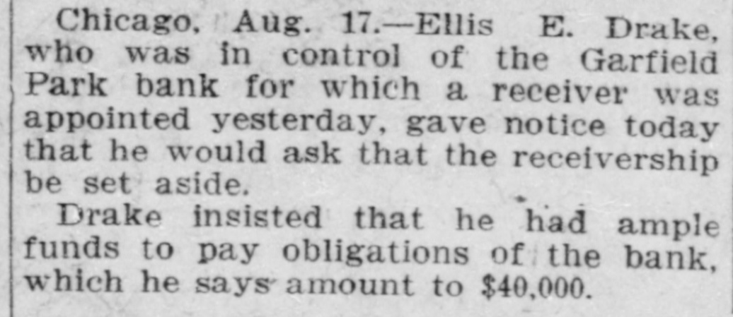 Contemporary reports state the bank was placed in the hands of a receiver (Henry/ Harry Hiestand/Fetzer variants) on Aug 16–17, 1906. Multiple articles tie the failure to the collapse of the Milwaukee Avenue State Bank and note a two-day run prior to closing. Bank described as private property of Ellis E. Drake in one article, so classified as private.