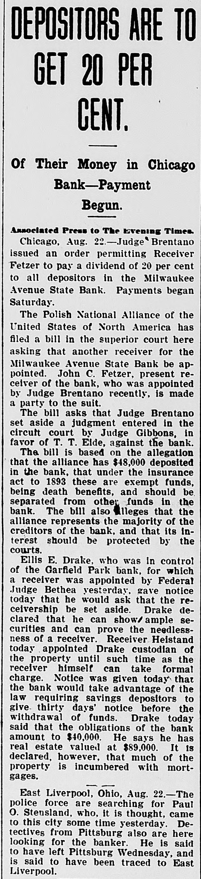 DEPOSITORS ARE TO GET 20 PER CENT. Of Their Money in Chicago Bank-Payment Begun. Associated Press to The Evening Times. Chicago, Aug. 22.-Judge Brentano issued an order permitting Receiver Fetzer to pay a dividend of 20 per cent to all depositors in the Milwaukee Avenue State Bank. Payments began Saturday. The Polish National Alliance of the United States of North America has filed a bill in the superior court here asking that another receiver for the Milwaukee Avenue State Bank be appointed. John C. Fetzer, present receiver of the bank, who was appointed by Judge Brentano recently, is made a party to the suit. The bill asks that Judge Brentano set aside a judgment entered in the circuit court by Judge Gibbons, in favor of T. T. Eide, against the bank. The bill is based on the allegation that the alliance has $48,000 deposited in the bank, that under the insurance act to 1893 these are exempt funds, being death benefits, and should be separated from other funds in the bank. The bill also lleges that the alliance represents the majority of the creditors of the bank, and that its interest should be protected by the courts. Ellis E. Drake, who was in control of the Garfield Park bank, for which a receiver was appointed by Federal Judge Bethea yesterday, gave notice today that he would ask that the receivership be set aside. Drake declared that he can show/ample securities and can prove the needlessness of a receiver. Receiver Heistand today appointed Drake custodian of the property until such time as the receiver himself can take formal charge. Notice was given today that the bank would take advantage of the law give. requiring thirty days' savings notice depositors before the to withdrawal of funds. Drake today said that the obligations of the bank amount to $40,000. He says he has real estate valued at $89,000. It IS declared, however, that much of the property is incumbered with mortgages. East Liverpool, Ohio, Aug. 22.-The police force are searching for Paul O. Stensland, who, it is thought, came to this city some time yesterday. Detectives from Pittsburg also are here looking for the banker. He is said to have left Pittsburg Wednesday, and is said to have been traced to East Liverpool.