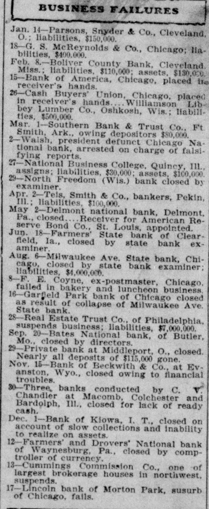 BUSINESS FAILURES Jan. 14-Parsons, Snyder & Co., Cleveland, O.; liabilities, $150,000. 18-G. S. McReynolds & Co., Chicago; liabilities, $400.000. Feb. 8.-Boliver County Bank, Cleveland, Miss.; liabilities, $110,000; assets, $130,000. 15-Bank of America, Chicago, placed in receiver's hands. 26-Cash Buyers' Union, Chicago, placed in receiver's hands Williamson Libbey Lumber Co., Oshkosh, Wis.; liabilities, $500,000. Mar. 1-Southern Bank & Trust Co., Ft. Smith, Ark., owing depositors $80,000. 2-Walsh, president defunct Chicago National bank, arrested on charge of falsifying reports. 27-National Business College, Quincy, Ill., assigns; liabilities, $30,000; assets, $100,000. 29-North Freedom (Wis.) bank closed by examiner. Apr. 2-Teis, Smith & Co., bankers, Pekin, Ill.; liabilities, $100,000. May 2-Delmont national bank, Delmont, Pa., closed Receiver for American Reserve Bond Co., St. Louis, appointed. Jun. 18-Farmers' State bank of Clearfield, Ia., closed by state bank examiner. Aug. 6-Milwaukee Ave. State bank, Chicago, closed by state bank examiner; liabilities, $4,000,000. 8-F. E. Coyne, ex-postmaster, Chicago, failed in bakery and luncheon business. 16-Garfield Park bank of Chicago closed as result of collapse of Milwaukee Ave. State bank. 28-Real Estate Trust Co., of Philadelphia, suspends business; liabilities, $7,000,000. Sep. 20-Bates National bank, of Butler, Mo., closed by directors. 29-Private bank at Middleport, O., closed. Nearly all deposits of $115,000 gone. Nov. 15-Bank of Beckwith & Co., at Evanston, Wyo., closed owing to financial troubles. 30-Three banks conducted by C. V. Chandler at Macomb, Colchester and Bardolph, Ill., closed for lack of ready cash. Dec. 1-Bank of Kiowa, I. T., closed on account of slow collections and inability to realize on assets. 12-Farmers' and Drovers' National bank of Waynesburg, Pa., closed by comptroller of currency. 13-Cummings Commission Co., one of largest brokerage houses in northwest, suspends. 17-Lincoln bank of Morton Park, susurb of Chicago, fails.