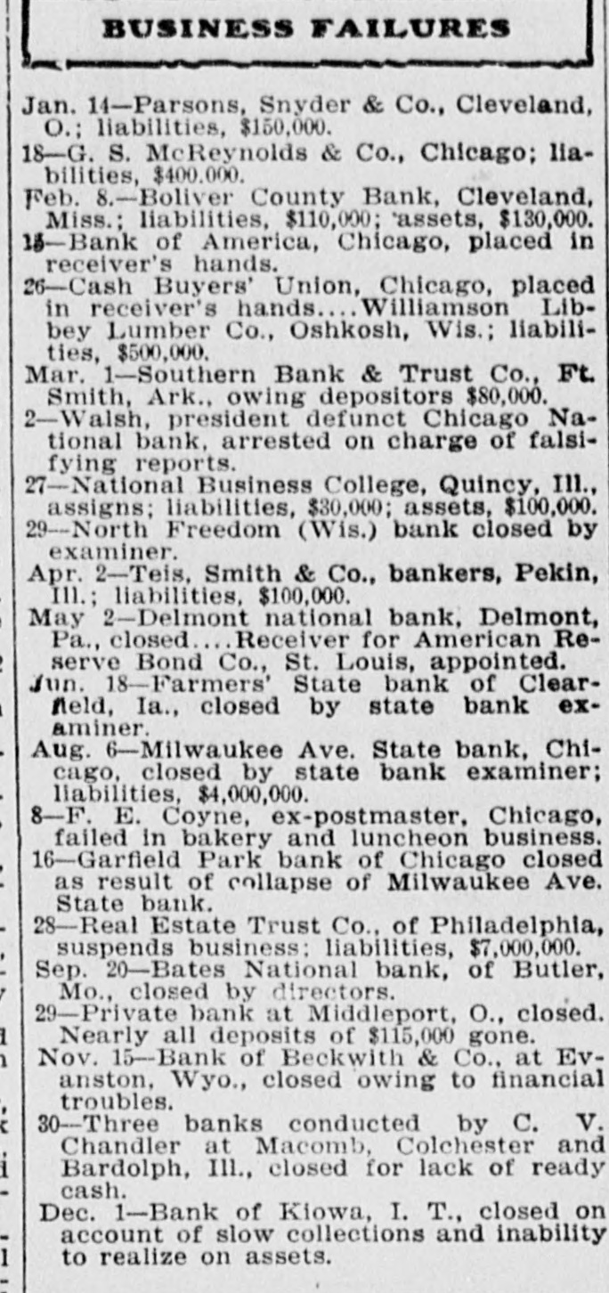 BUSINESS FAILURES Jan. 14-Parsons, Snyder & Co., Cleveland, O.; liabilities, $150,000. 18-G. S. McReynolds & Co., Chicago; liabilities, $400,000. Feb. 8.-Boliver County Bank, Cleveland, Miss.: liabilities, $110,000; assets, $130,000. 15-Bank of America, Chicago, placed in receiver's hands. 26-Cash Buyers' Union, Chicago, placed in receiver's hands Williamson Libbey Lumber Co., Oshkosh, Wis.; liabilities, $500,000. Mar. 1-Southern Bank & Trust Co., Ft. Smith, Ark., owing depositors $80,000. 2-Walsh, president defunct Chicago National bank, arrested on charge of falsifying reports. 27-National Business College, Quincy, Ill., assigns; liabilities, $30,000; assets, $100,000. 29-North Freedom (Wis.) bank closed by examiner. Apr. 2-Teis, Smith & Co., bankers, Pekin, Ill.; liabilities, $100,000. May 2-Delmont national bank, Delmont, Pa., closed Receiver for American Reserve Bond Co., St. Louis, appointed. Jun. 18-Farmers' State bank of Clearfield, Ia., closed by state bank examiner. ug. 6-Milwaukee Ave. State bank. Chicago, closed by state bank examiner; liabilities, $4,000,000. 8-F. E. Coyne, ex-postmaster, Chicago, failed in bakery and luncheon business. 16-Garfield Park bank of Chicago closed as result of collapse of Milwaukee Ave. State bank. 28-Real Estate Trust Co., of Philadelphia, suspends business; liabilities, $7,000,000. Sep. 20-Bates National bank, of Butler, Mo., closed by directors. 29-Private bank at Middleport, O., closed. Nearly all deposits of $115,000 gone. Nov. 15-Bank of Beckwith & Co., at Evanston, Wyo., closed owing to financial troubles. 30-Three banks conducted by C. V. Chandler at Macomb, Colchester and Bardolph, Ill., closed for lack of ready cash. Dec. 1-Bank of Kiowa, I. T., closed on account of slow collections and inability to realize on assets. 12-Farmers' and Drovers' National bank of Waynesburg, Pa., closed by comptroller of currency. 13-Cummings Commission Co., one of largest brokerage houses in northwest, suspends. 17-Lincoln bank of Morton Park, susurb of Chicago, fails.