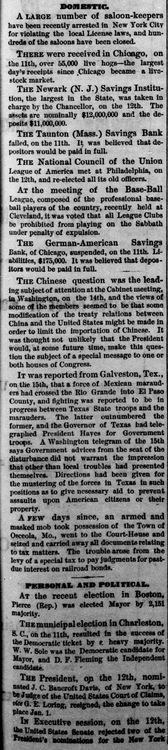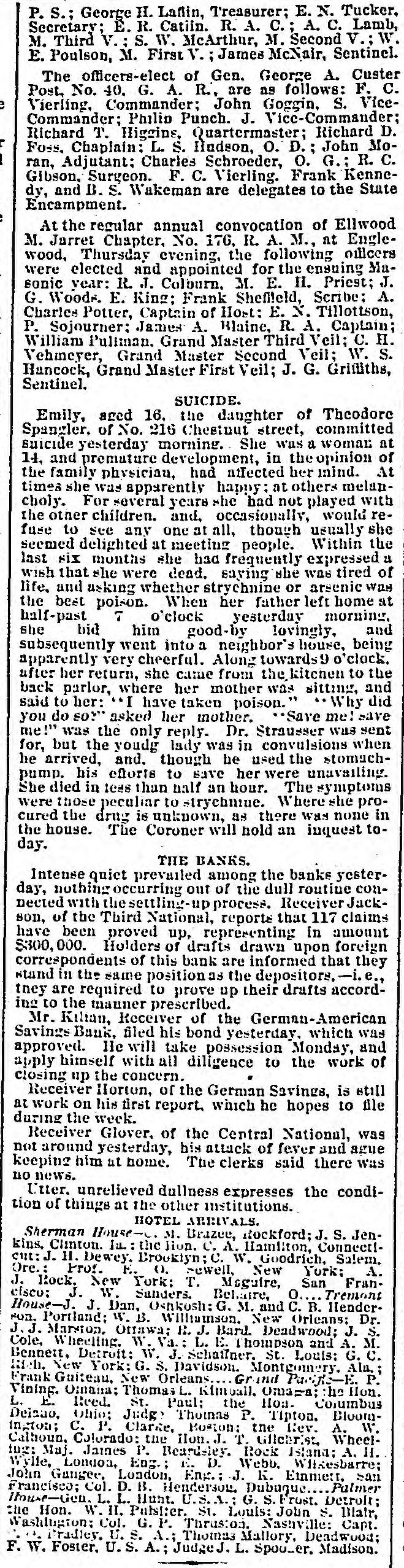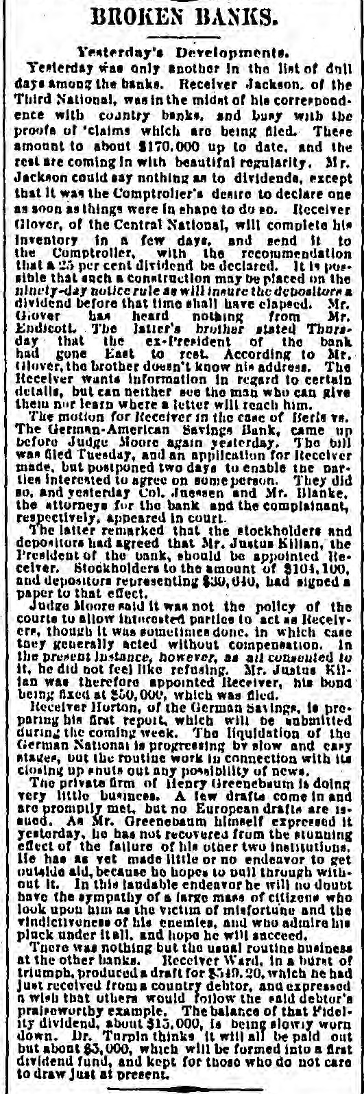 BROKEN BANKS. Yesterday's Developments. Yesterday was only another In the list of dall days among the banks. Receiver Jackson. of the Third National, was in the midst of his correspondence with country banks, and buay with the proofs of 'claims which are being filed. These amount to about $170.000 up to date. and the rest are coming In with beautiful regularity. Mr. Jackson could say nothing an to dividends, except that It was the Comptrolier's desire to declare one as soon as things were in shape to do 20. Receiver (llover, of the Central National, will complete his Inventory in a few days. and send It to the Comptroller, with the recommendation that A 25 per cent dividend be declared. It " possible that each a construction may be placed on the ninety-day notice rule as will insure the depositors a dividend before that time shall have clapsed. Mr. Glover has heard nothing from Mr. Endicott. The latter's brother stated Thursday that the ex-President of the bank had gone East to real. According to Mr. (lover, the brother doesn't know nie address. The Receiver wants information in regard to certain details, but can neither see the m3b who can give them not learn where a letter will reach him. The motion for Receiver in the case of Beris YR. The German-American Savings Bank, came up before Judge Moore again yesterday. The bill was filed Tuesday, and an application for Receiver made. but postponed two days to enable the parties interested to agree on some person. They did so, and vesterday Col. Inessen and Mr. Blanke, the attorneys for the bank and the complainant, respectively. appeared in court. The latter remarked that the stockholders and depositors had agreed that Mr. Justus Killan, the President of the bank, should be appointed Receiver. Stockholders to the amount of $104. 100, and depositors representing $30,630, had signed a paper to that effect. Judge Moore sold It was not the policy of the courte to allow Interested partice to act as ReceivCTP, though It was sometimes done. in which case toey generally acted without compensation. In the present Instance, however, as all consented to it, he did not fee) like refusing. Mr. Justus Killan was therefore appointed Receiver, his bond being fixed at $50,000, which was filed. Receiver Hurton, of the German Savings, 10 pre. paring bis first report, which will be submitted during the coming week. The liquidation of the German National is progressing by slow and cary stages, but the routine work in connection with its closing up shuts out any possibility of news. The private firm of Henry Greenebaum is doing very little business. A few drafts come in and are promptly met, but no European drafts are 19. sued. As Mr. Greenebaum himself expressed It yestorday. be has not recovered from the stunning effect of the failure of his other two institutions. He has as vet made little or no endeavor to get outside aid, because be hopes to pull through with. out It. In this laudable endeavor be will no doubt have the sympathy of a large mass of citizens who look upon him as the victim of misfortune and the vindictiveness of his enemies, and who admire the pluck under itall. and hope he will succeed. There was nothing but the usual routine business at the other banks. Receiver Ward, In a burst of triumph. produceds draft for $549.20. which he had just received froms country debtor, and expressed n wish that others would follow the said debtor's praiseworthy example. The balance of that Fidelity dividend, about $15,000, is being slowly worn down. Dr. Turpin thinks It will all be paid out but about 000, which will be formed into a first dividend fund, and kept for those who do not care to draw Just at present.
