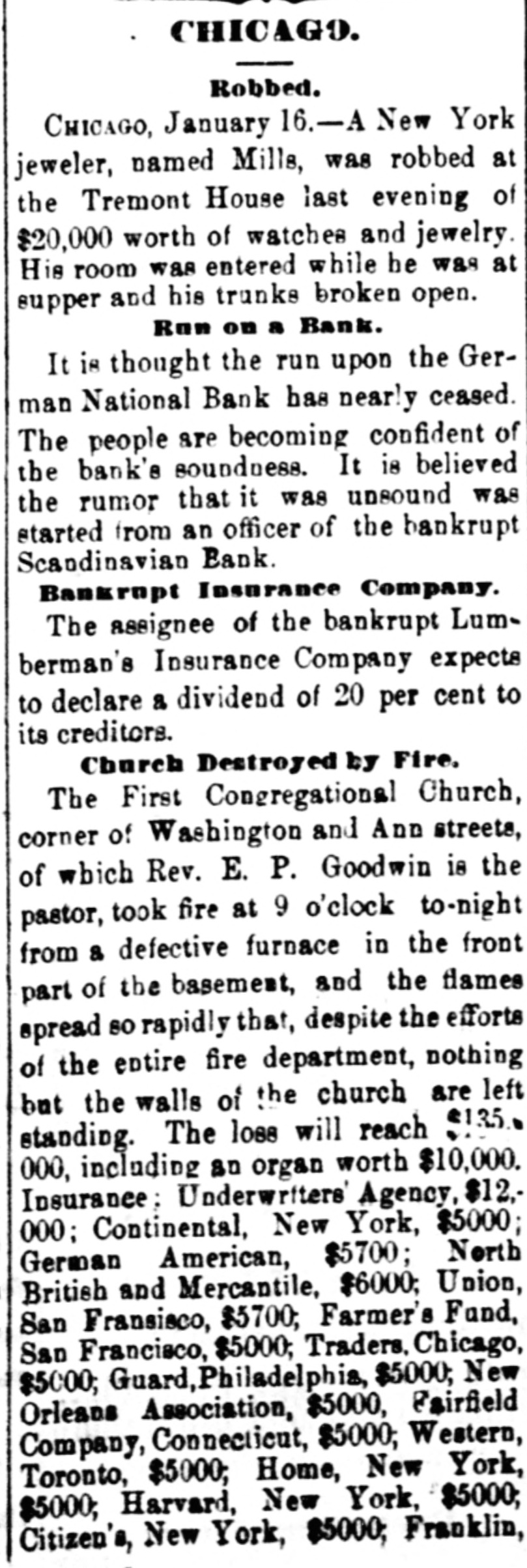 CHICAGO. -Robbed. CHICAGO, January 16.-A New York jeweler, named Mills, was robbed at the Tremont House last evening of $20,000 worth of watches and jewelry His room was entered while he was at supper and his trunks broken open. Ran on a Bank. It is thought the run upon the German National Bank has nearly ceased. The people are becoming confident of the bank's soundness. It is believed the rumor that it was unsound was started from an officer of the bankrupt Scandinavian Bank. Bankrupt Insurance Company. The assignee of the bankrupt Lumberman's Insurance Company expects to declare a dividend of 20 per cent to its creditors. Church Destroyed by Fire. The First Congregational Church, corner of Washington and Ann streets, of which Rev. E. P. Goodwin is the pastor, took fire at 9 o'clock to-night from a defective furnace in the front part of the basement, and the flames spread so rapidly that, despite the efforts of the entire fire department, nothing but the walls of the church are left standing. The loss will reach $135. 000, including an organ worth $10,000. Insurance: Underwriters Agency, $12.000; Continental, New York, $5000; German American, $5700; North British and Mercantile, $6000; Union, San Fransisco, $5700; Farmer's Fund, San Francisco, $5000; Traders. Chicago, $5000; Guard, Philadelphia, $5000; New Orleans Association, $5000, Fairfield Company, Connecticut, $5000; Western, Toronto, $5000; Home, New York, $5000; Harvard, New York, $5000; Citizen's, New York, $5000; Franklin,