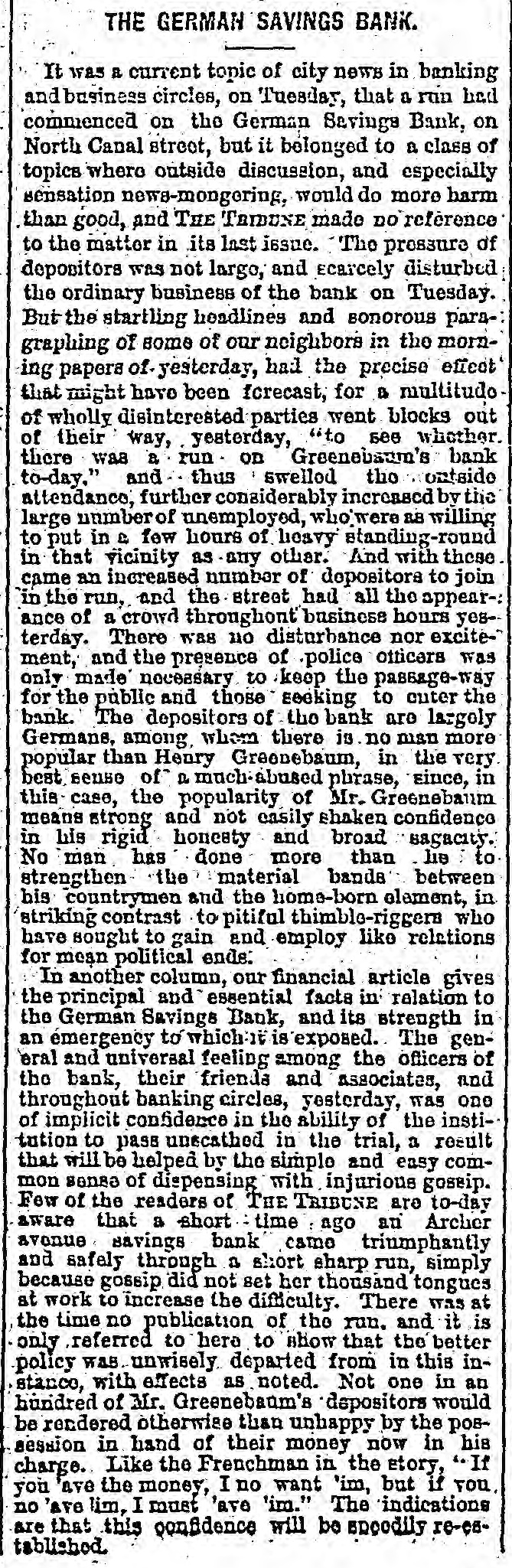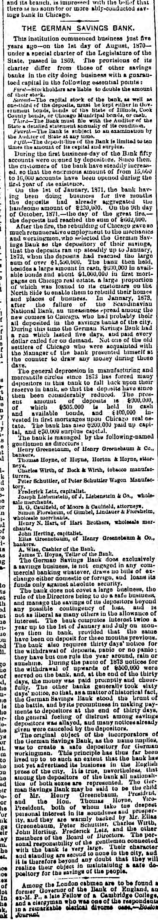 The original object of the incorporators of the German Savings Bank, as the name implies, was to create a safe depository for German workingmen. This principle has thus far been lived up to to such an extent that the bank has not yet advertised its business in the English press of the city. It is true, nevertheless, that among the depositors of the bank all nationalities of both sexes are represented. The German Savings Bank may be said to be the child of Mr. Henry Greenebaum, President, and the Hon. Thomas Hoyne, Vice President, both of whom take the deepest personal interest in its soundness and prosperity, and they are warmly backed by Mr. Elias Greenebaum, Peter Schuttler, Charles Wirth, John Horting, Frederick Letz, and the other members of the Board of Directors. The personal responsibility of the gentlemen connected with the bank is very large. Their character and standing are second to none in the city, and it is therefore beyond any doubt that they will realize their object in maintaining a safe depository for the savings of the people.