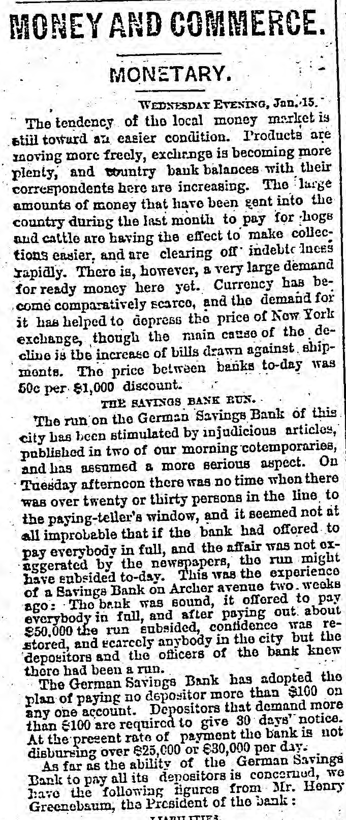 The bank does not covet a large business, the rule of the Directors being to do a safe business, and manage the savings of its depositors beyond any possible contingency of loss, and is not as liberal as many others in the allowance of interest. The bank computes interest twice a year up to the 1st of January and July on moneys then in bank, provided that the same have been on deposit for three months previous. The bank also requires thirty days' notice for the withdrawal of deposits, panic or no panic; they have but one rule the year around, rain or sunshine. During the panic of 1873 notices for the withdrawal of upwards of $500,000 were served on the bank, and, at the end of the thirty days, the money was paid promptly and cheerfully. The other banks generally took sixty days' notice, so that, as a matter of historical fact, the German Savings Bank stood the brunt of the battle, and by its promptness in making payments to depositors at the end of thirty days, the general feeling of distrust among savings depositors was allayed, and many notices already given were canceled by the depositors.