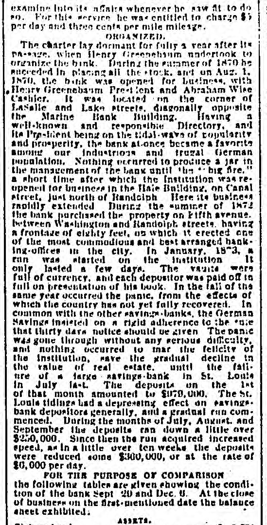 On the 1st of January, 1871, the bank having been doing business for five months the deposits had already aggregated the handsome amount of $230,000. On the 9th day of October, 1871,-the day of the great fire,-the deposits had reached the sum of $662,000. After the fire, the rebuilding of Chicago gave so much remunerative employment to the mechanics and workingmen, who selected the German Savings Bank as the depository of their savings, that the deposits ran up steadily up to January, 1873, when the deposits had reached the large sum of over $1,500,000. The bank then held, besides a large amount in cash, $600,000 in available bonds and about $1,000,000 in first mortgages on Chicago real estate, a large proportion of which was loaned to its customers on the North Side to enable them to rebuild their homes and places of business. In January, 1873, after the failure of the Scandinavian National Bank, an uneasiness spread among the new comers to Chicago, who had probably their all deposited in the savings banks of the city. During this time the German Savings Bank had a run which lasted five days, and paid every dollar called for on demand. Not one of the old settlers of Chicago who were acquainted with the Manager of the bank presented himself at the counter to draw any money during those days.