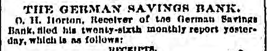 THE GERMAN SAVINGS BANK. D. H. fiorton. Receiver of the German Savings Bank. filed his twenty-sixth monthly report yesterday, which is no follows: INSCRIPTS.
