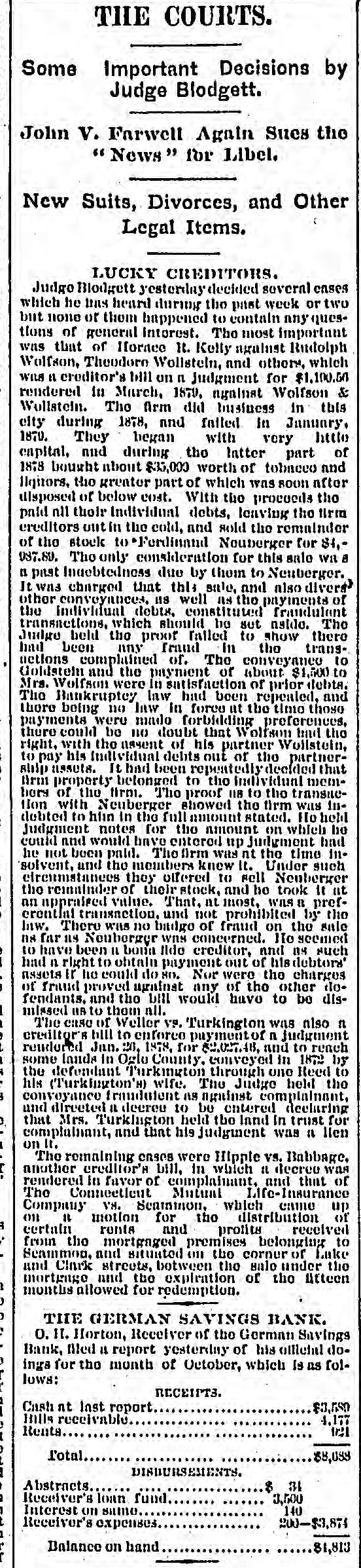 THE COURTS. Some Important Decisions by Judge Blodgett. John v. Farwell Again Sues the " News for Libel. New Suits, Divorces, and Other Legal Items. LUCKY CREDITORS. Judge Blodgett yesterday decided several cases which he has heard during the past week or two but none of them happened to contain any questions of general Interest. The most important was that of Hornee It. Kelly against Rudolph Wolfson, Theodore Wollstein, and others, which WILS a creditor's bill on n Judgment for $1,100.50 rendered in March, 1870, against Wolfson & Wollstein. The firm did business in this city during 1878, and failed In January, 1870. They began with very httle capital, and during the Intter part of 1878 bought about $35,000 worth of tobacco and Hquors, the greater part of which was soon after disposed of below cost. With the proceeds the paid all thoir Individual debts, leaving the firm creditors out in the cold, and sold the remulnder of the stock to Fordinand Nouberger for $4,987.80. The only consideration for this sale WR a n past Indebtedness due by thom to Neuberger. It was charged that this sale, and also divers' other conveyances, us well as the payments of the individual debts, constituted fraudulent transactions, which should be set nsido. The Judge beld the proof failed to show there had been any fraud in the transnetions complained of. The conveyance to Goldstein and the payment of about $1,500 to Mrs. Wolfson were In sutisfaction of prior debts. The Bankruptcy law had been repeated, and thore being no law in force at the time those payments were made forbidding preferences, there could be no doubt that Wolfson but the right, with the assent of his partner Wollstein, to pay his Individual debts out of the partnership assets. It had been repeatedly decided that Brui property belonged to the individual memhers of the firm. The proof 08 to the transueHon with Neuberger showed the firm was Indebted to him In the full amount stated. Ho held Judgment notes for the amount on which he could and would have entered up judgment had he not been paid. The firm was nt the time Insolvent, and the members knew It. Under such efrennatances they offered to sell Neuberger the remainder of their stock, and he took It at an appraised value. That, at most, was a prefcrential transaction, and not prohibited by the law. There was no bailgo of fraud on the sale ns far as Neuberger was concerned. Ho seemed to have been IL bonn tide creditor, and 08 such had n right to obtain payment out of his debtors' assets Ir he could do NO. Nor were the charges of fraud proved against any of the other dofendants, and the bill would have to be dismissed us to them all. The case of Weller vs. Turkington was also n creditor's bill to enforce payment of n judgment rendered Jan. 20, 1878, for 18, and to reach some lands In Oglo County. conveyed in 18T2 by the defendant Turkington through one Reed to his (Turkington's) wife. The Judge held the convoyance fraudulent as against complainant, and directed a deeree to be entered declaring that Mrs. Turkington held the land In trust for complainant, and that his judgment was a lien on It. The remaining enses were Hipple vs. Babbage. another creditor's bill, in which IL decree was rendered In favor of complainant, and that of The Connectient Mutual Life-Insurance Company V8. Seammon, which came up on a motion for the distribution of certain rents and profits received from the mortgaged premises belonging to Seammon, and situated on the corner of Lake and Clark streets, botween the salo under the mortgage and the expiration of the atteen months allowed for redemption. THE GERMAN SAVINGS BANK. 0. 11. Horton, Receiver of the German Savings Bank, filed " report yesterday of his official doings for the month of October, which is as follows: RECEIPTS. Cash nt Inst report $3,580 Inits receivable 4,177 Rents ICI Total $8,088 DISDURSEMENTS, Abstracts $ 31 Receiver's loan fund 3,500 Interest on same 140 200-$3,874 Receiver's expenses Balance on hand 81,813