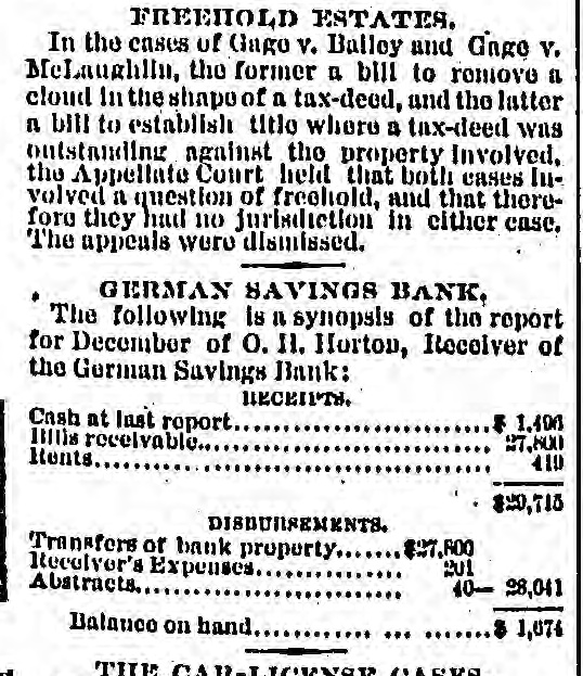# FREEHOLD ESTATES. In the cases of Gage v. Balley and Gage v. McLaughlin, the former a bill to remove a cloud in the shape of a tax-deed, and the latter a bill to establish title where a tax-deed was outstanding against the property Involved, the Appellate Court held that both cases involved a question of freehold, and that therefore they had no jurisdiction in either case. The appeals were dismissed. # GERMAN SAVINGS BANK, The following is a synopsis of the report for December of O. H. Horton, Receiver of the German Savings Bank: RECEIPTS. Cash at last report.........................................................................................................................................................................................................................................................................................................................................................................................................................................................................................................................................................................................................................................................................................................................................................................................................................................................................................................................................................................................................................................................................................................................................................................................................................................................................................................................................................................................................................................................................................................................................................................................................................................................................................................................................................................................................................................................................................................................................................................................................................................................................................................................................................................................................................................................................................................................................................................................................................................................................................................................................................................................................................................................................................................................................................................................................................................................................................................................................................................................................................................................................................................................................................................................................................................................................................................................................................................................................................................................................................................................................................................................................................................................................................................................................................................................................................................................................................................................................................................................................................................................................................................................................................................................................................................................................................................................................................................................................................................................................................................................................................................................................................................................................................................................................................................................................................................................................................................................................................................................................................................................................................................................................................................................................................................................................................................................................................................................................................................................................................................................................................................................................................................................