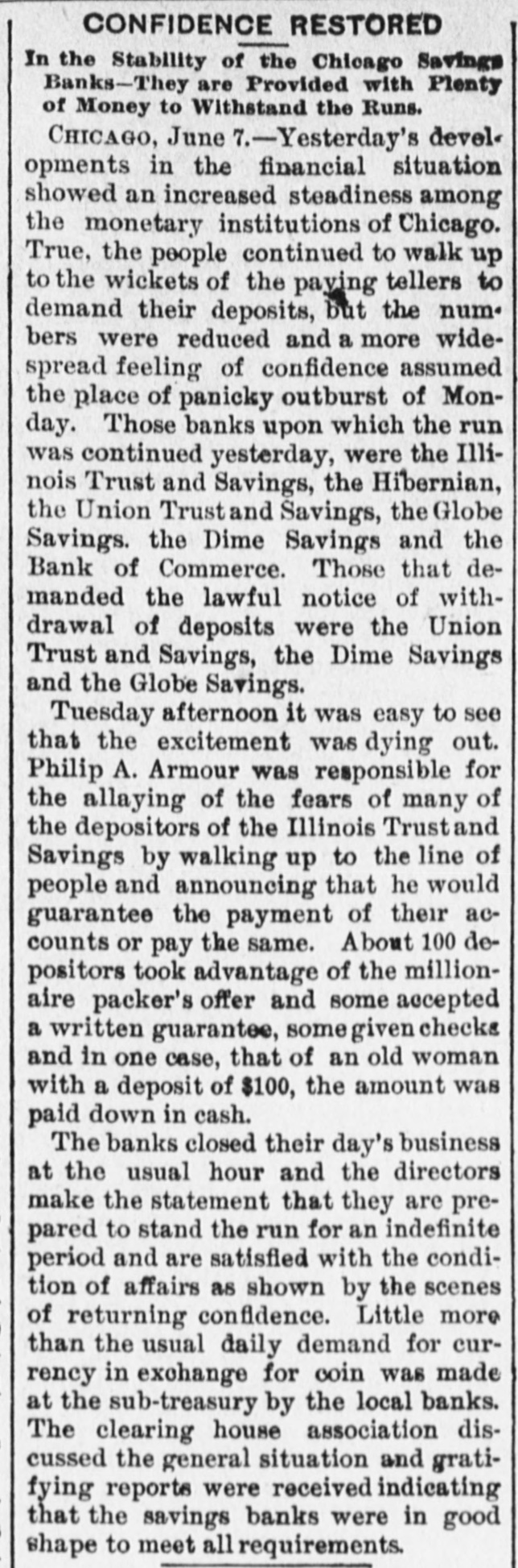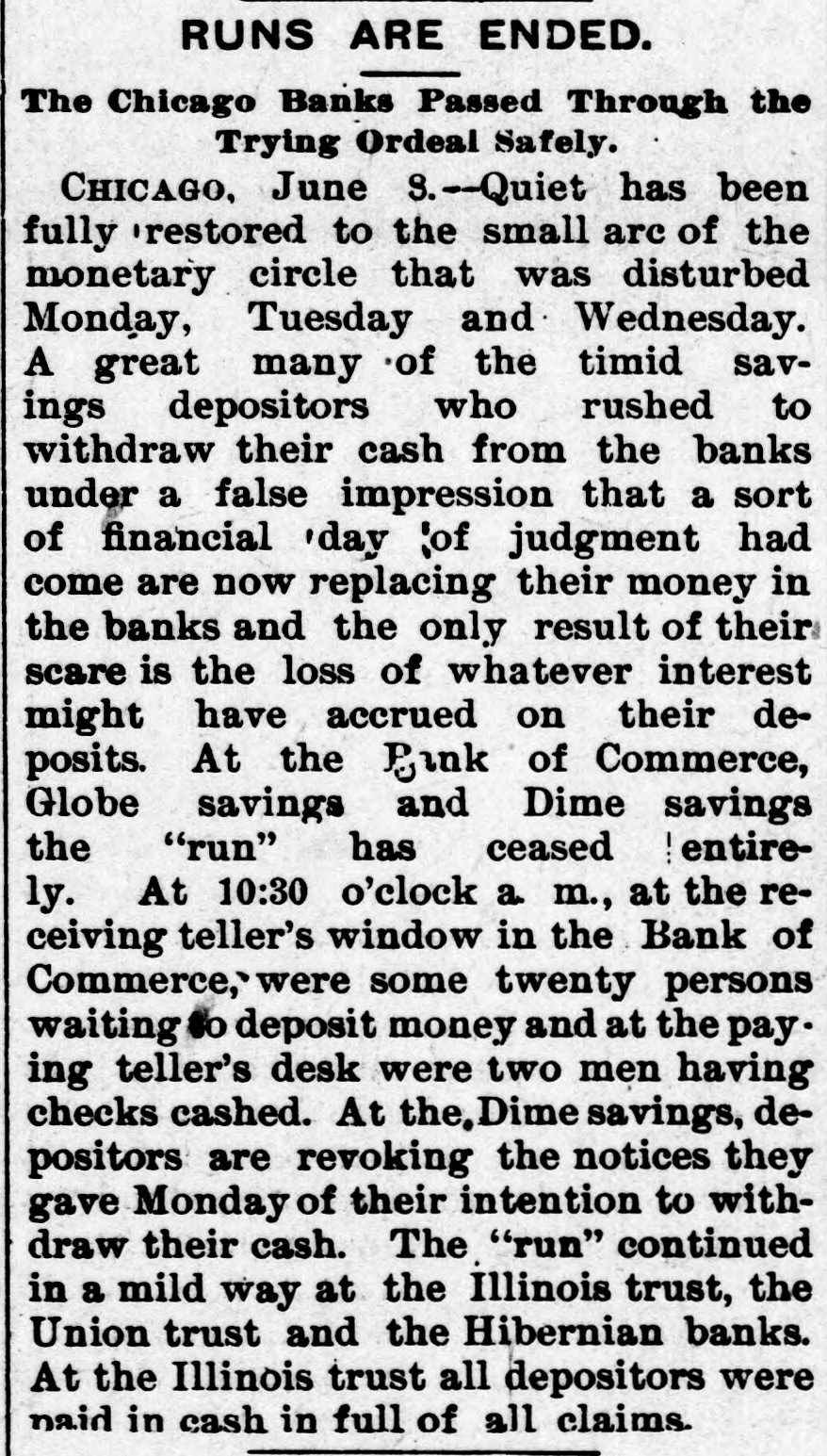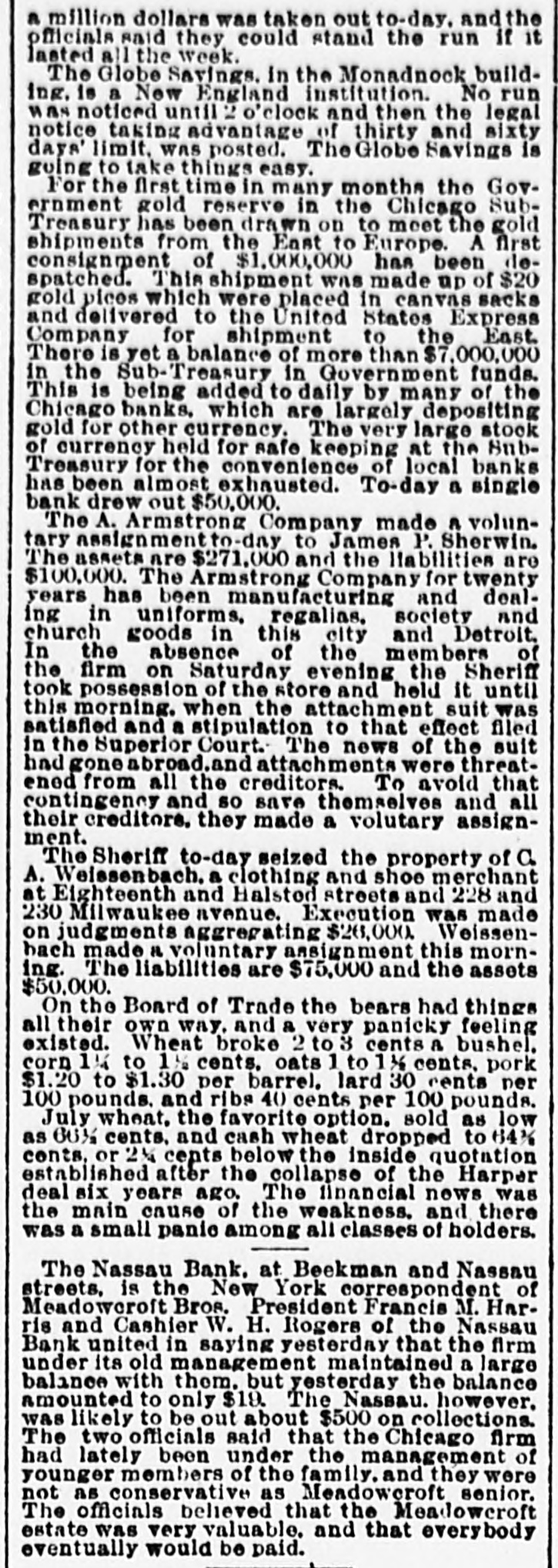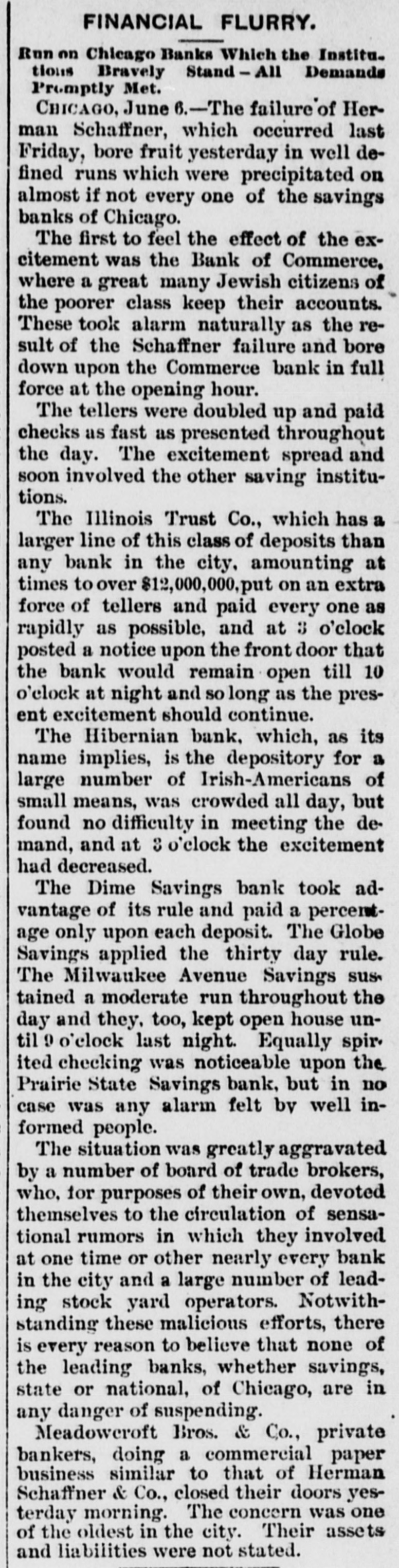 CHICAGO, June 5.-The failure of Herman Shaffner & Co., which occurred last Friday. bore fruit to-day in well defined runs which were precipitated on almost If not every one of the savings banks of Chicago. The first to feel the effect of the exeitement was the Bank of Commerce, where a great many Jewish oltizens of the poorer class keep their accounts. These took alarm as the result of the Shaffner faflure and bore down upon the Ban- of Commerce in full force at the opening, hour. The tellers were doubled up and paid checks as fast as presented throughout the day. The excitement spread and soon involved the other savings institutions. The Illinois Trust Co. which has a larger line of this class of deposits than any other bank in the city, amounting at times to over $12,000,000, put on an extra force of tellers and paid every one as rapidly as possible, and at 3 o'clock posted notice on the front door that the bank would remain open until 9 o'clock to-night and as long as the present exeitement should continue. At twelve o'clock to-night the Illinois Trust & Savings Bank was still paying off and the crowd of depositors anxious to draw their money was still as large as ever. The bank officials said that they cared nothing whatever for the run, but were rather pleased than otherwise to pay out the money as it meant & big saving to the institution in interest, the quarterly instalment being due on July 1, and which all depositors who drew their money today have lost. The bank officers estimate that the run so far hasgiven them a net profit of $35,000. It was announced at midnight that the bank would not close as long as a single depositor cared to draw out a dollar. The Hibernian bank, which as the name implies, was the depository for a large number of Irish Americans of small means, was crowded all day. but found no difficulty in meeting the demand, and at 3 o'elock the excitement had perceptibly decreased. The Dime Savings paid & percentage only on each deposit. The Globe Savings applied the thirtyday rule. The Milwaukee Avenue Savings sustained & moderate run throughout the day. and they too kept open house until o'clock to-night. Equally spirited checking was noticeable upon the Prairie State Savings and Union Trust Company, as well as upon the Avenue Savings Bank, but in no case was any alarm felt by well-informed people. Thesituation was greatly aggravated by a number of board of trade brokers, who, for purposes of their own devoted themselves to the circulation of rumors which involved at one time or another nearly every bank in the city, and & large number of leading stock yard operators. Notwithstanding these malicious stories, there is every reason to believe that none of the leading banking institutions, whethor savings, State or national, of Chicago are in any danger of suspending. The failure of Meadowcroft Bros., & minor institution. occurred but aroused little or no interest in the minds of the general public. Their total deposits did not exceed $200,000.