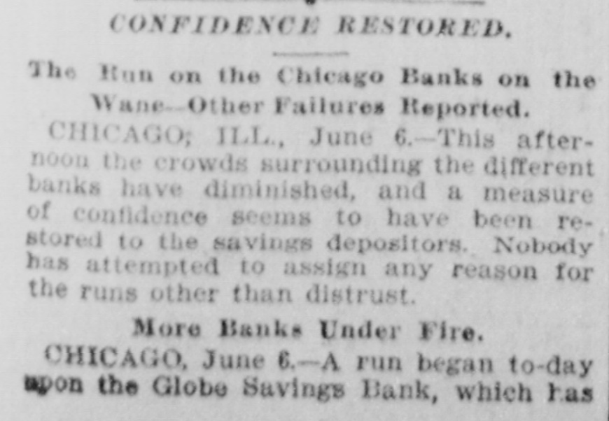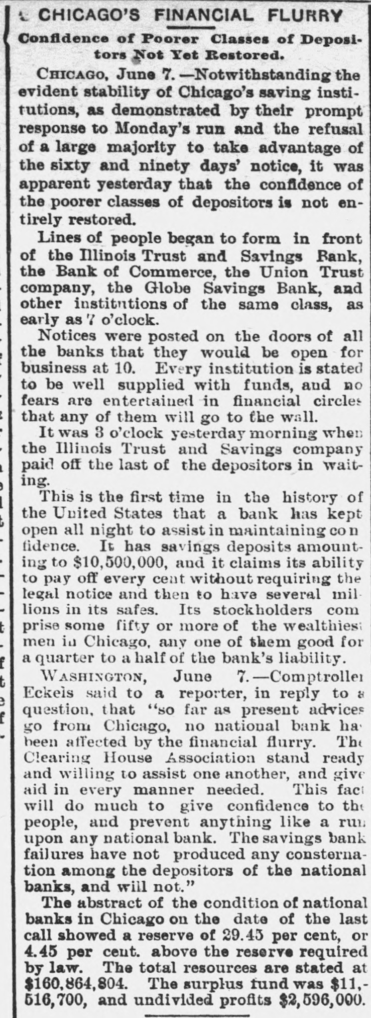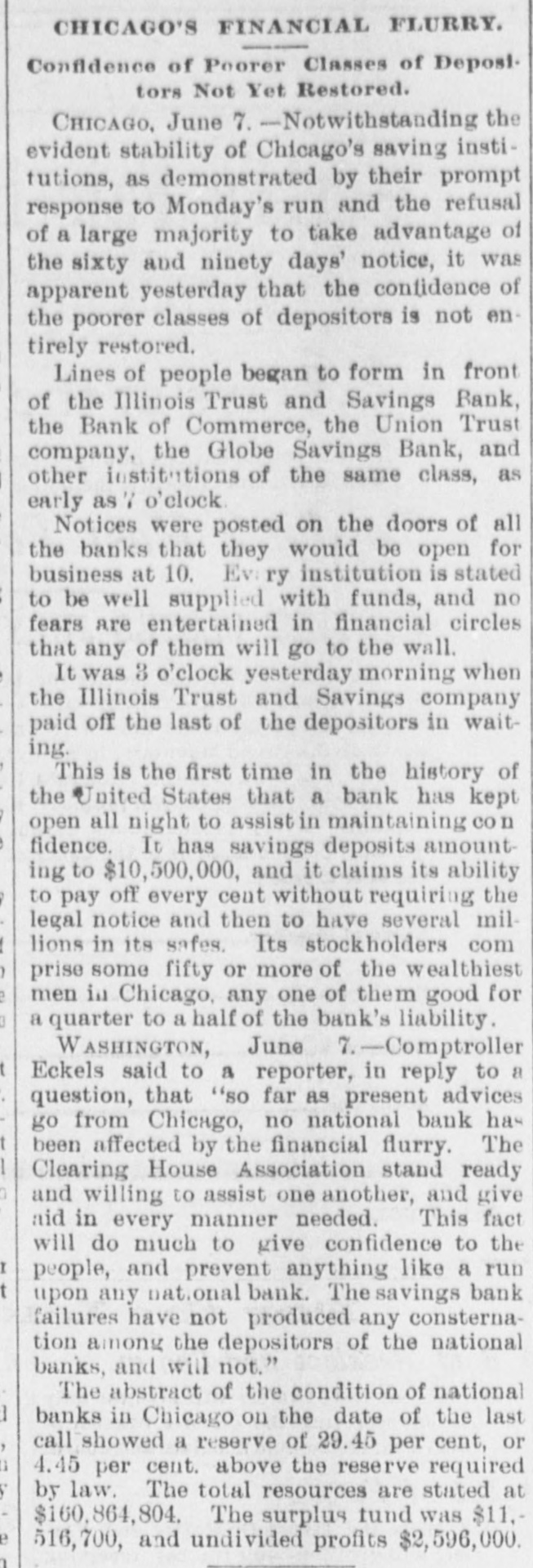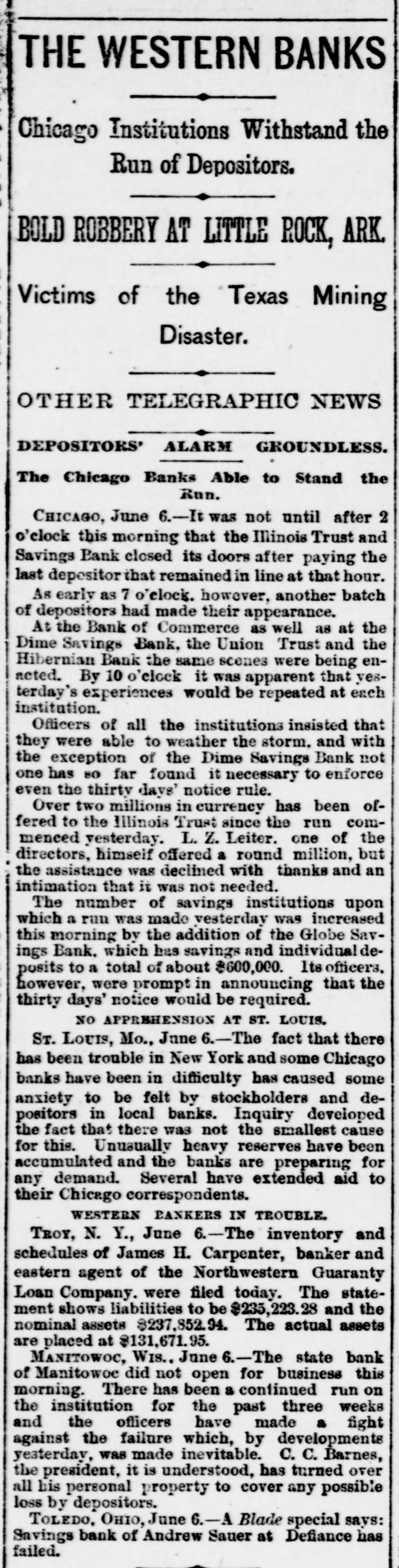 ANXIOUS DEPOSITORS. CHICAGO BANKERS ARE HAVING TROUBLOUS TIMES. Board of Trade Brokers Trying to Precipitate a Panie-Unusual Banking Hours. Special to the RECORD-UNION. CHICAGO, June 6.-3 A. M.-The failure of Hermann Schaffner & Co.'s Bank, which occurred last week, bore fruit yesterday in well defined runs which were precipitated on almost, if not every one of the savings banks of Chicago. First to feel the effect of the excitement was the Bank of Commerce, where a great many of the accounts. The class keep Jewish their citizens Schaffner poorer failure had alarmed them and they bore down upon the Commerce at the opening hour. Tellers were doubled up and paid checks as fast as presented throughout the day, the officials of the bank expressing no and that they to meet would alarm be whatever, able any saying demands. The Illinois Trust and Savings Bank, which has a larger line of this class of deposits than any other bank in the city, amounting at times to over $12,000,000, put on an and everyone as as extra rapidly force of tellers possible. paid At o'clock this afternoon they posted a notice on the front door that the bank would remain open until 10 o'clock to-night, and as long as the present excitement continued. The Hibernian Bank, which, as its name implies, was the depository for a large number of Irish-Americans of small means, was crowded all day, but found no difficulty meeting all demands. The Dime Savings Bank took advantage of the rule requiring, if necessary, sixty days' notice of withdrawal and paid only a percentage of deposits to-day. The Globe Savings Bank applied the thirty-day rule. The Milwaukee=avenue Savings Bank sustained a moderate run throughout the day, and they, too, kept open 9 o'clock was noted Equally housa spirited until checking to-night. upon the Price, State National and rie as well as State Savings Banks, Prai- upon the Union Trust Company and the Avenue Savings Bank, but in no case was any alarm felt by well-informed people. In many these fact, at of institutions large depositors came in during the afternoon and made heavy deposits. To-day's situation was greatly aggravated by a number of Board of Trade brokers, who for reasons of their own devoted themselves to the circulation of sensational rumors in which they involved at one time or another nearly every bank in the city and a large number of leading stock yards operators. Notwithstanding these malicious efforts no fear is felt as to the safety of any of the leading banking institutions of the city. The failure of Meadowcroft Brothers, a total of minor institution, with deposits perhaps $200,000, aroused little or no interest. At midnight the Illinois Trust and Savings Bank was still paying off, and the crowd of depositors anxious to draw was as large as money bank still ever. The officials are rather pleased than pay out the it otherwise to money, as means a big saving to the institution in interest. So far the net profit is about $35,000. At this hour it was announced that the bank would not close as long as a single depositor cared to draw out a dollar. The paying of money is being continued at seven windows. President Mitchell said: "We will right months and not here for three close stay our doors night or day if such a proceeding should become necessary. We are good for any run no matter how long it keeps up." " At 1:30 A. M. the Illinois Trust and Savings Bank was still open, the force of paying-tellers at seven windows having been relieved by fresh men and enough people are still waiting for money to keep the bank open two hours more. President Mitchell said he had plenty money on hand and plenty of men to pay it out.