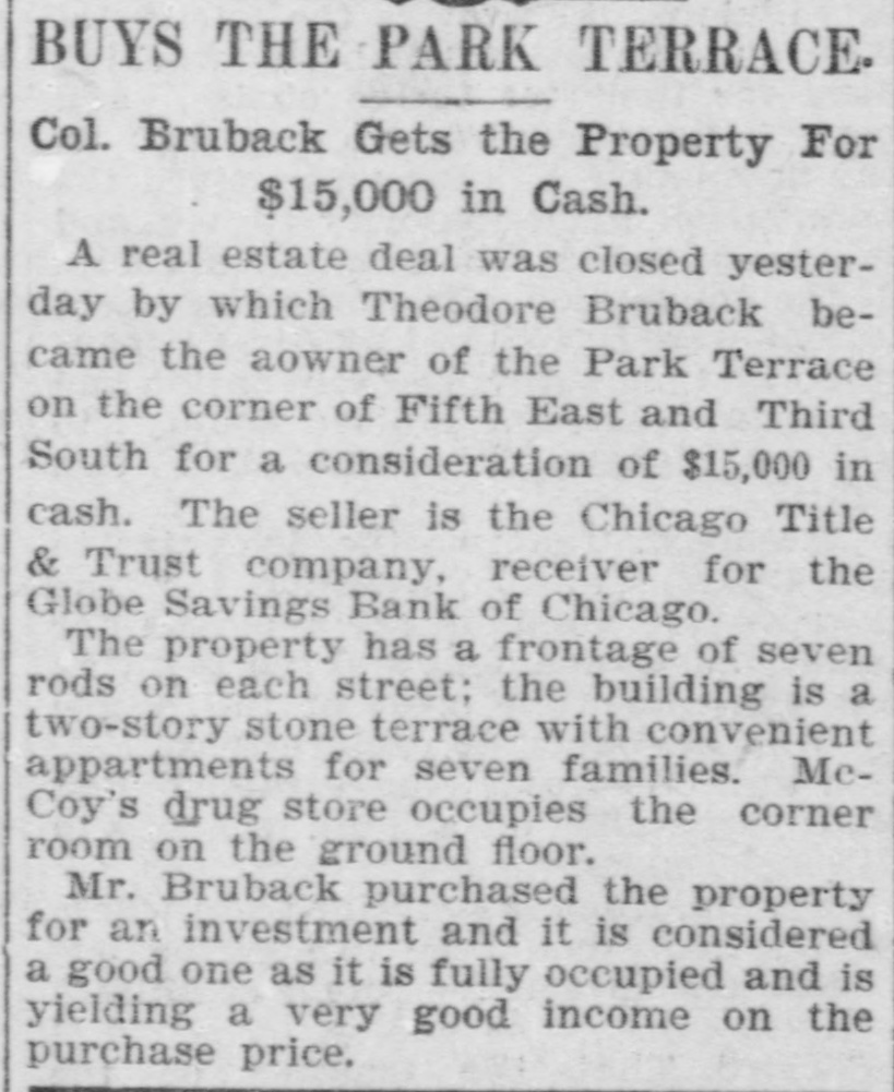 # BUYS THE PARK TERRACE. Col. Bruback Gets the Property For $15,000 in Cash. A real estate deal was closed yesterday by which Theodore Bruback became the aowner of the Park Terrace on the corner of Fifth East and Third South for a consideration of $15,000 in cash. The seller is the Chicago Title & Trust company, receiver for the Globe Savings Bank of Chicago. The property has a frontage of seven rods on each street; the building is a two-story stone terrace with convenient appartments for seven families. McCoy's drug store occupies the corner room on the ground floor. Mr. Bruback purchased the property for an investment and it is considered a good one as it is fully occupied and is yielding a very good income on the purchase price.