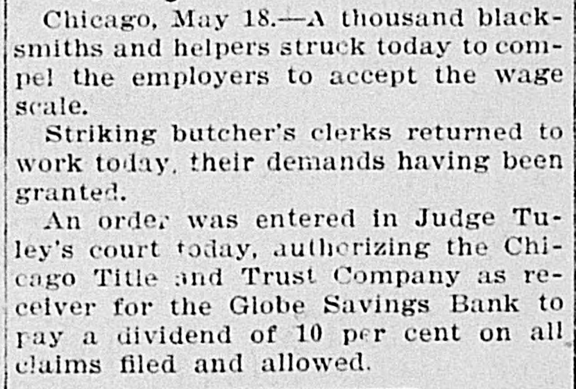 Chicago, May 18.-A thousand blacksmiths and helpers struck today to compel the employers to accept the wage scale. Striking butcher's clerks returned to work today. their demands having been granted. An order was entered in Judge Tuley's court today, authorizing the Chicago Title and Trust Company as recelver for the Globe Savings Bank to pay a dividend of 10 per cent on all claims filed and allowed.