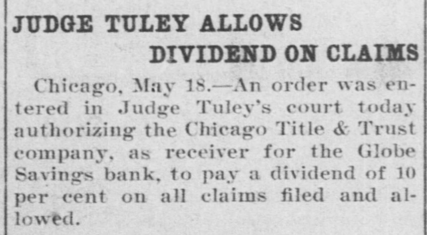 JUDGE TULEY ALLOWS DIVIDEND ON CLAIMS Chicago, May 18.-An order was entered in Judge Tuley's court today authorizing the Chicago Title & Trust company, as receiver for the Globe Savings bank, to pay a dividend of 10 per cent on all claims filed and allowed.