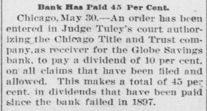 Bank Has Paid 45 Per Cent. Chicago, May 30.-An order has been entered in Judge Tuley's court authorlizing the Chicago Title and Trust company,as receiver for the Globe Savings bank. to pay a dividend of 10 per cent. on all claims that have been filed and allowed. This makes a total of 45 per cent. in dividends that have been paid since the bank failed in 1897.