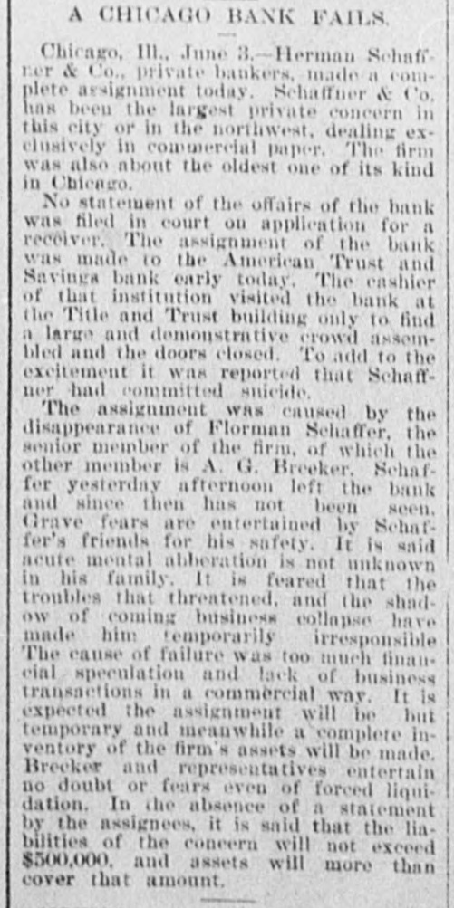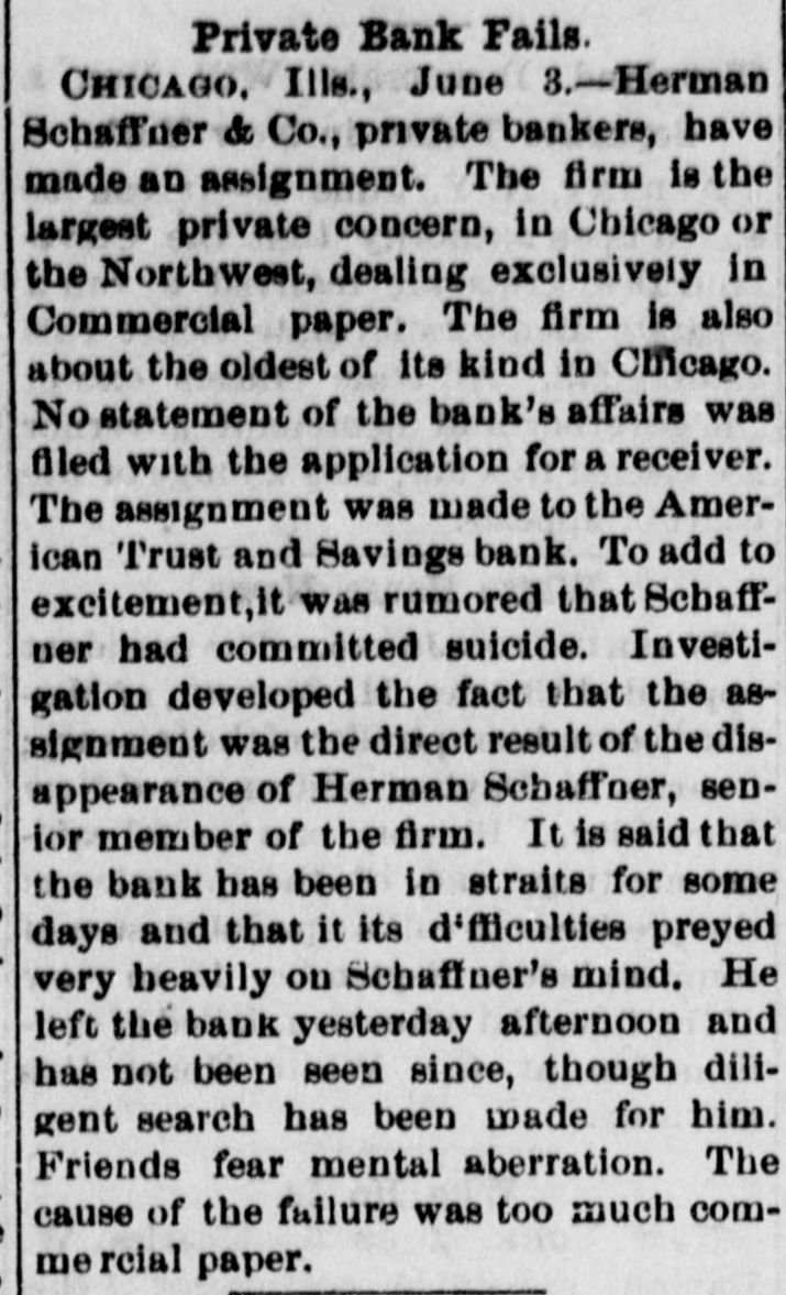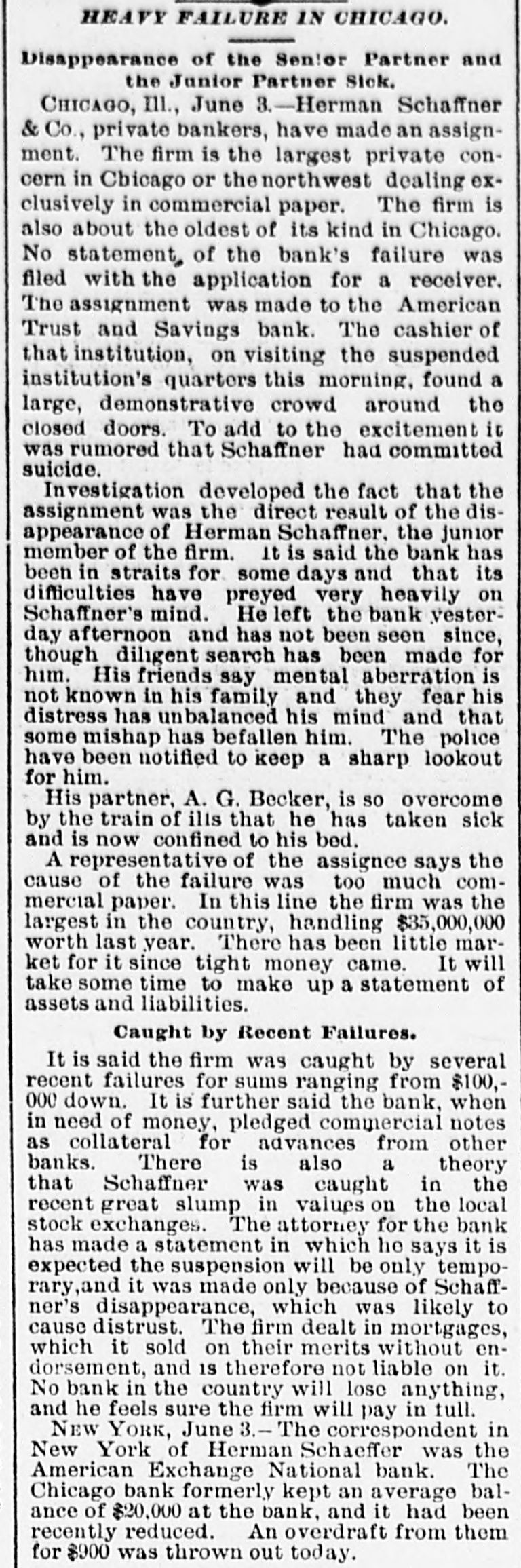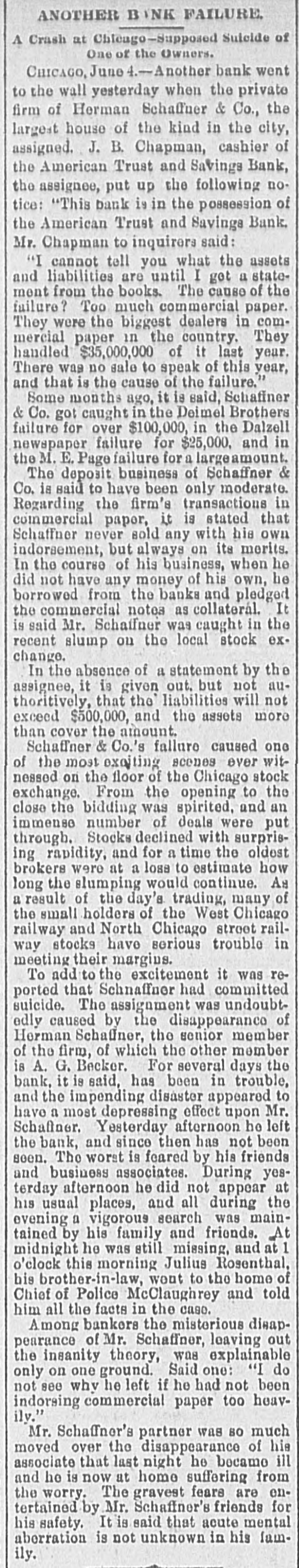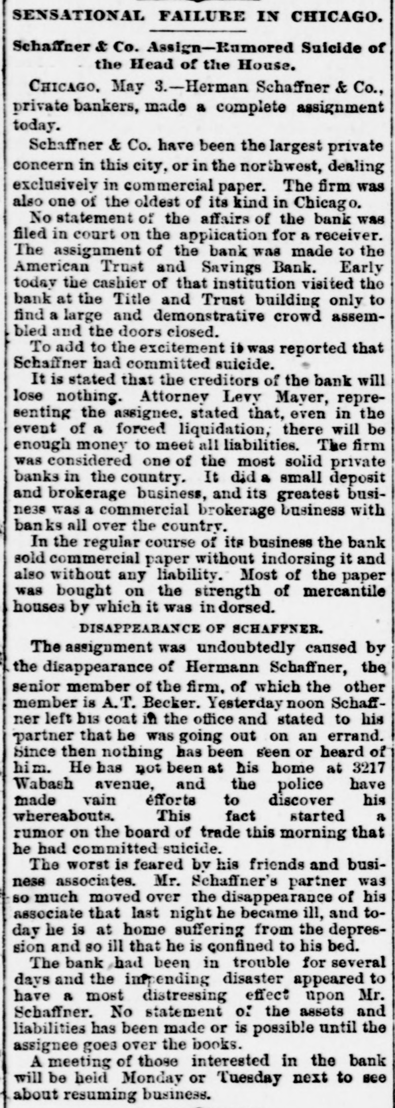 SENSATIONAL FAILURE IN CHICAGO. Schaffner s Co. Assign-Ramored Suicide of the Head of the House. CHICAGO. May 3.-Herman Schaffner & Co., private bankers, made a complete assignment today. Schaffner & Co. have been the largest private concern in this city, or in the northwest, dealing exclusively in commercial paper. The firm was also one of the oldest of its kind in Chicag o. No statement of the affairs of the bank was filed in court on the application for a receiver. The assignment of the bank was made to the American Trust and Savings Bank. Early today the cashier of that institution visited the bank at the Title and Trust building only to find a large and demonstrative crowd assembled and the doors closed. To add to the excitement it was reported that Schaffner had committed suicide. It is stated that the creditors of the bank will lose nothing. Attorney Levy Mayer, representing the assignee. stated that, even in the event of a forced liquidation, there will be enough money to meet all liabilities. The firm was considered one of the most solid private banks in the country. It did a small deposit and brokerage business, and its greatest busine38 was a commercial brokerage business with banks all over the country. In the regular course of its business the bank sold commercial paper without indorsing it and also without any liability. Most of the paper was bought on the strength of mercantile houses by which it was in dorsed. DISAPPEARANCE OF SCHAFFNER. The assignment was undoubtedly caused by the disappearance of Hermann Schaffner, the senior member of the firm. of which the other member is A.T. Becker. Yesterday noon Schaffner left his coat in the office and stated to his partner that he was going out on an errand. Since then nothing has been seen or heard of him. He has not been at his home at 3217 Wabash avenue, and the police have made vain efforts to discover his whereabouts. This fact started a rumor on the board of trade this morning that he had committed suicide. The worst is feared by his friends and business associates. Mr. Schaffner's partner was so much moved over the disappearance of his associate that last night he became ill, and today he is at home suffering from the depression and so ill that he is confined to his bed. The bank had been in trouble for several days and the impending disaster appeared to have a most distreesing effect upon Mr. Schaffner. No statement of the assets and liabilities has been made or is possible until the assignee goes over the books. A meeting of those interested in the bank will be held Monday or Tuesday next to see about resuming business.