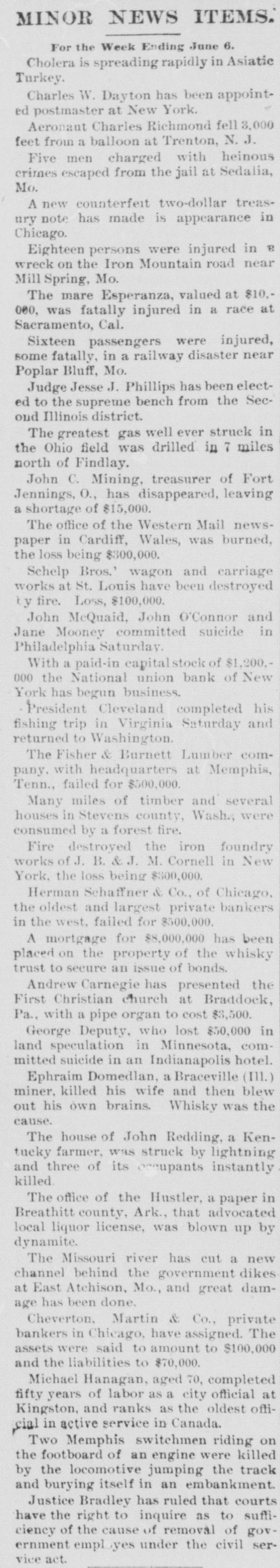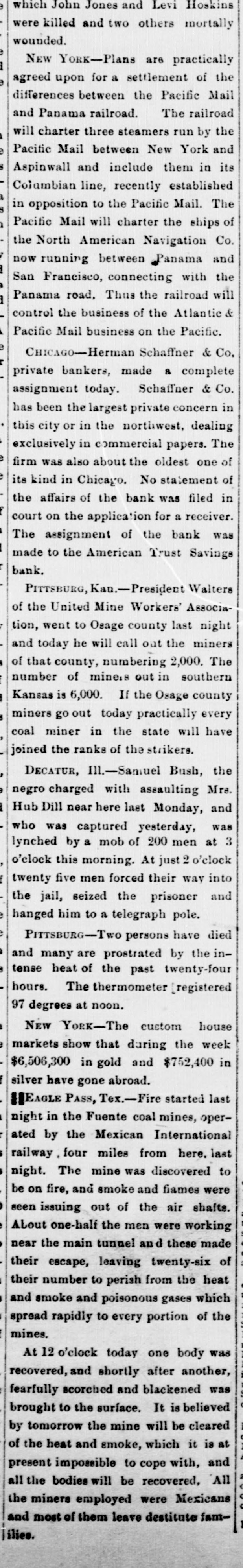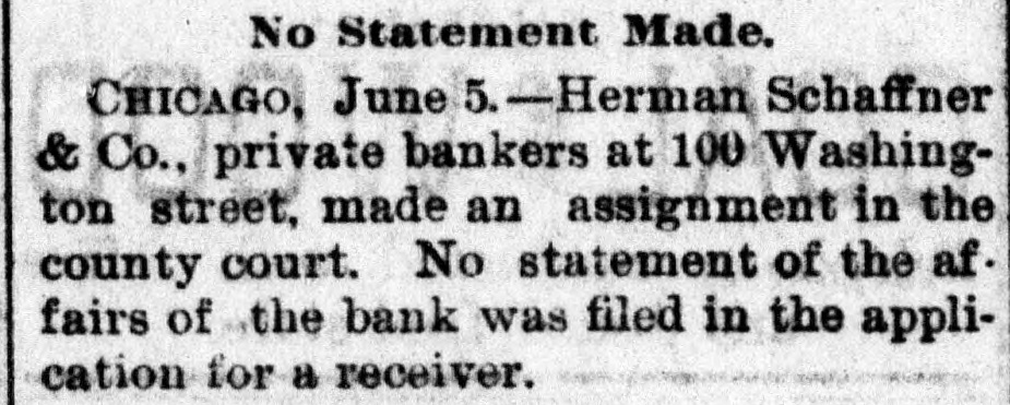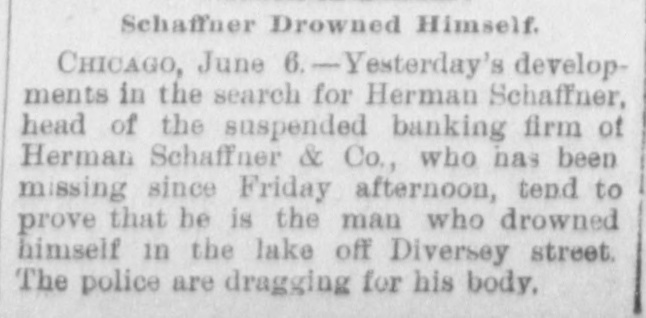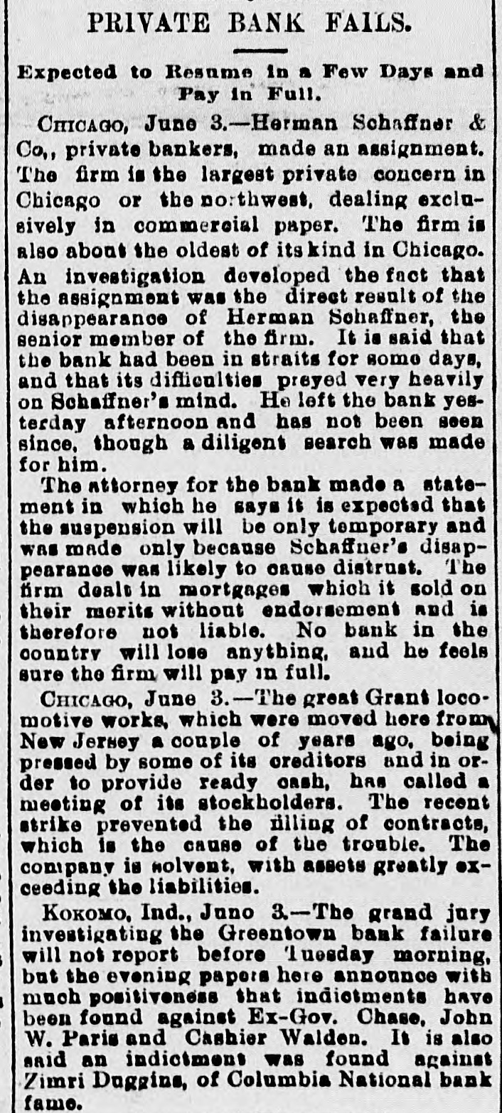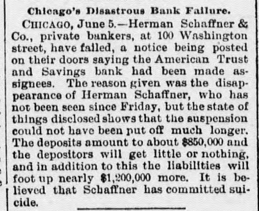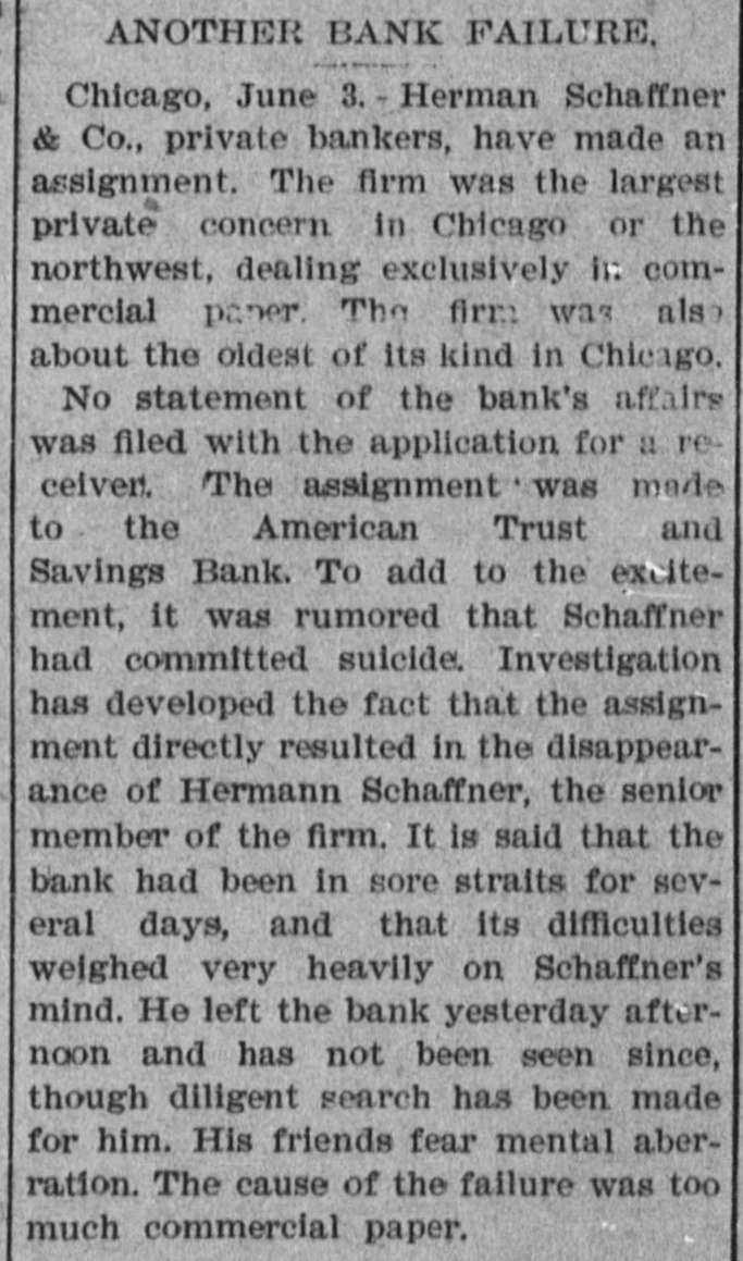 SENSATIONAL FAILURE IN CHICAGO. Schaffner s Co. Assign-Ramored Suicide of the Head of the House. CHICAGO. May 3.-Herman Schaffner & Co., private bankers, made a complete assignment today. Schaffner & Co. have been the largest private concern in this city, or in the northwest, dealing exclusively in commercial paper. The firm was also one of the oldest of its kind in Chicag o. No statement of the affairs of the bank was filed in court on the application for a receiver. The assignment of the bank was made to the American Trust and Savings Bank. Early today the cashier of that institution visited the bank at the Title and Trust building only to find a large and demonstrative crowd assembled and the doors closed. To add to the excitement it was reported that Schaffner had committed suicide. It is stated that the creditors of the bank will lose nothing. Attorney Levy Mayer, representing the assignee. stated that, even in the event of a forced liquidation, there will be enough money to meet all liabilities. The firm was considered one of the most solid private banks in the country. It did a small deposit and brokerage business, and its greatest busine38 was a commercial brokerage business with banks all over the country. In the regular course of its business the bank sold commercial paper without indorsing it and also without any liability. Most of the paper was bought on the strength of mercantile houses by which it was in dorsed. DISAPPEARANCE OF SCHAFFNER. The assignment was undoubtedly caused by the disappearance of Hermann Schaffner, the senior member of the firm. of which the other member is A.T. Becker. Yesterday noon Schaffner left his coat in the office and stated to his partner that he was going out on an errand. Since then nothing has been seen or heard of him. He has not been at his home at 3217 Wabash avenue, and the police have made vain efforts to discover his whereabouts. This fact started a rumor on the board of trade this morning that he had committed suicide. The worst is feared by his friends and business associates. Mr. Schaffner's partner was so much moved over the disappearance of his associate that last night he became ill, and today he is at home suffering from the depression and so ill that he is confined to his bed. The bank had been in trouble for several days and the impending disaster appeared to have a most distreesing effect upon Mr. Schaffner. No statement of the assets and liabilities has been made or is possible until the assignee goes over the books. A meeting of those interested in the bank will be held Monday or Tuesday next to see about resuming business.